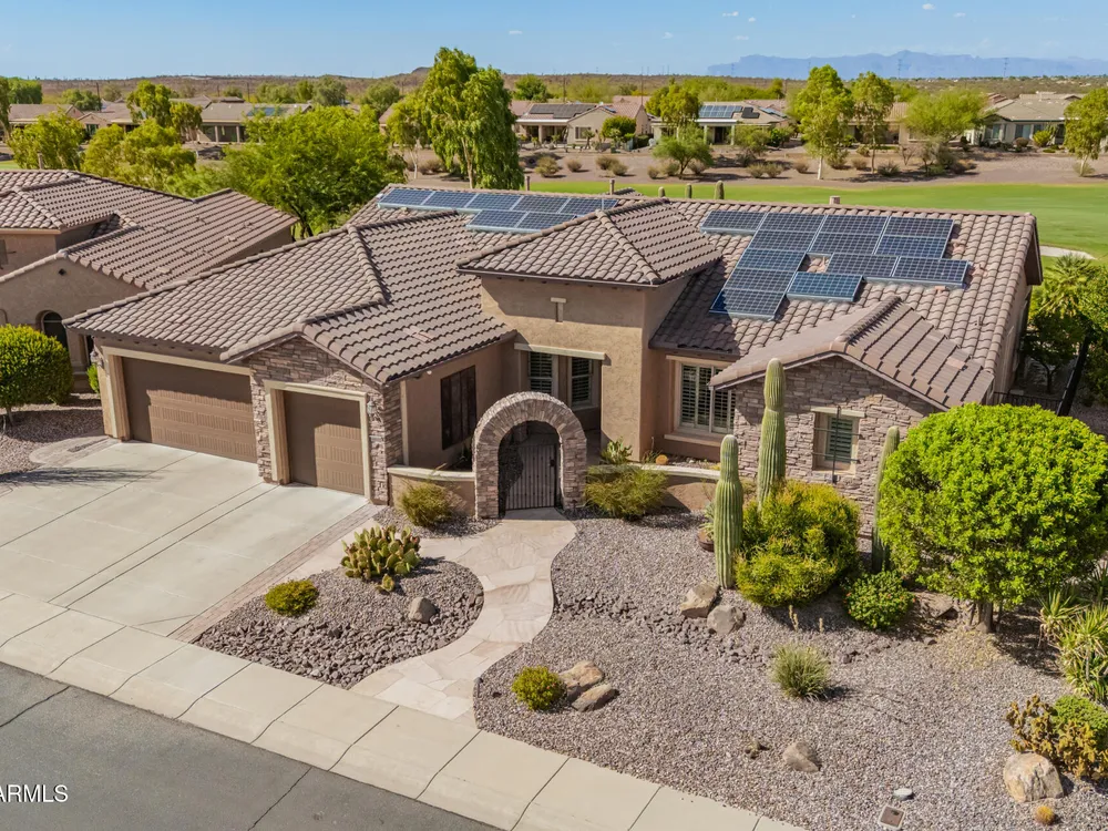 Stunning upgraded Regence model located on the 11th fairway. Ideal for golf enthusiasts seeking resort-style living! Enjoy sweeping golf course & sunset views from your private pool & spa, perfect for outdoor entertaining. Enter through a beautiful stone archway & flagstone courtyard into a home featuring a custom iron front door w/operable leaded glass, crown molding, plantation shutters, & designer tile floors. Den, flex space/library, & formal dining room offer wood flooring & a custom bar area. Upgraded kitchen includes granite countertops & backsplash, pull-out shelves, gas cooktop, double ovens, & built-in desk. The spacious owner's suite offers tranquil golf & pool views, dual walk-in closets, soaking tub, separate shower, & dual sinks. Rare full 3 car garage & more!