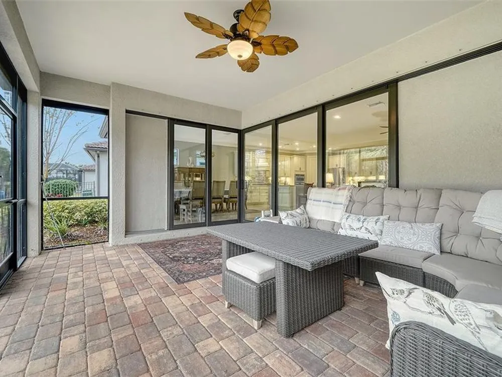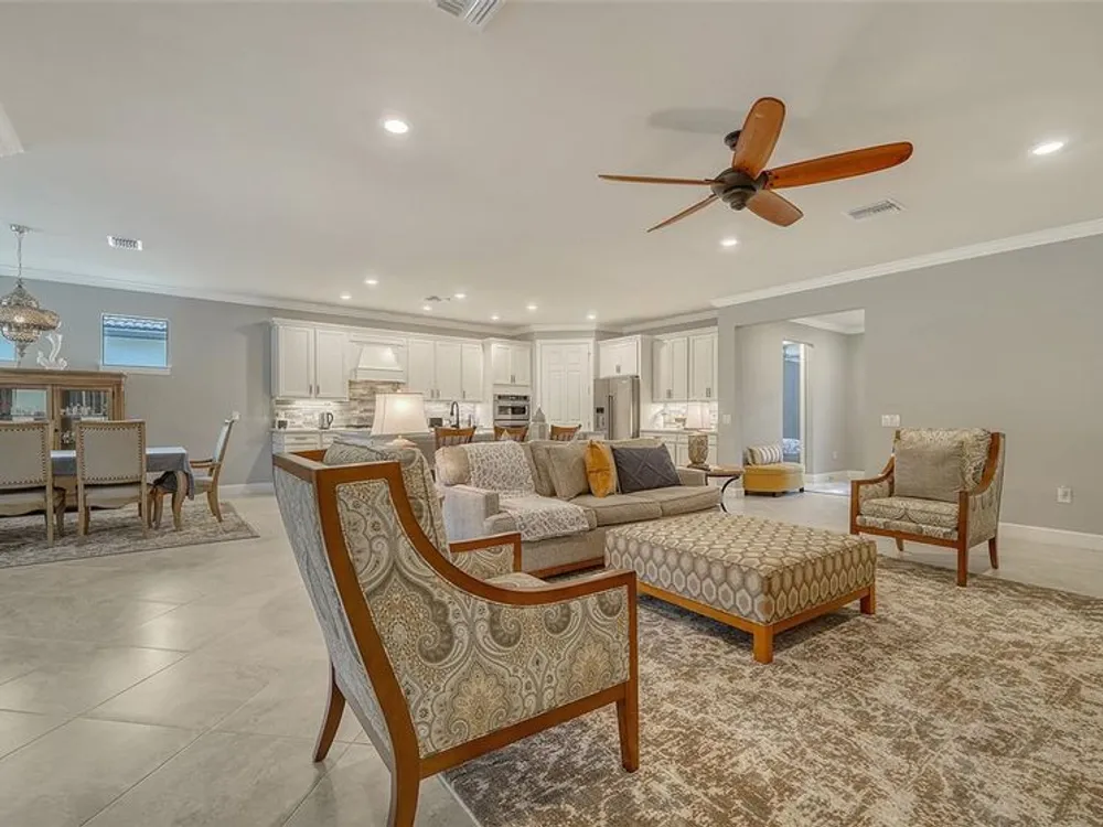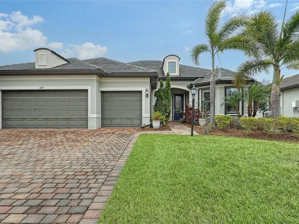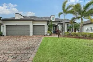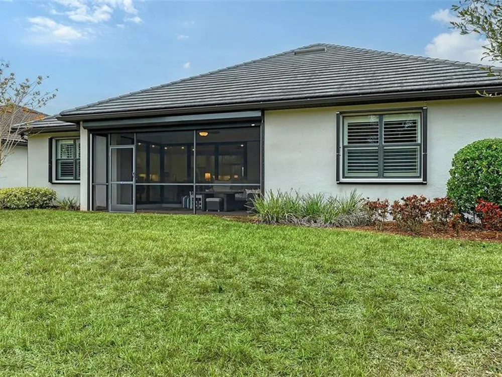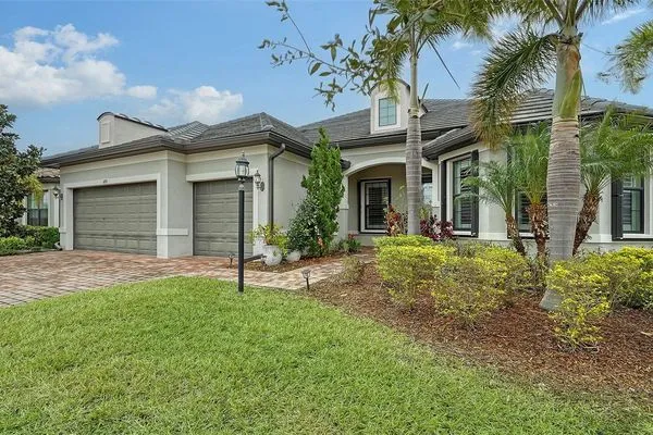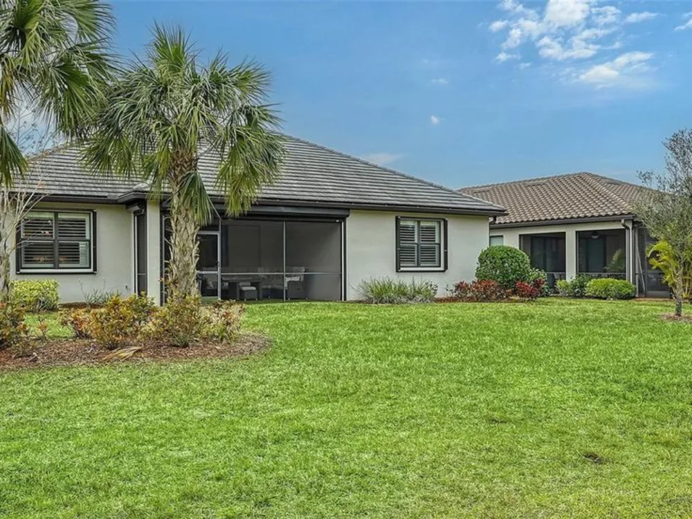 Come see this lovely home located in the gated 55+ Del Webb community in Lakewood Ranch. This popular Pinnacle model offers 3 bedrooms, 3 baths, a den, and gourmet kitchen with many built-ins. The zero corner slider leads to the screened lanai -- a great place where you can enjoy your morning coffee, relax, and entertain guests. The home offers 2488 square feet of living space along with a three-car garage (2 cars plus golf cart). The living areas have tiled floors and crown molding. Bedrooms have carpet. The spacious primary bedroom and ensuite bath has a spacious walk-in closet, large shower, and vanity with dual sinks. The open floor plan has a large gathering area adjacent to the spacious gourmet kitchen, and dinette. The kitchen countertops are quartz with white cabinetry and stainless steel appliances. There is a spacious walk-in pantry. A large island with sink, work space, breakfast bar separate the kitchen from the great room. At one end of the kitchen the dining area has easy access to the lanai. The laundry room has a utility sink and cabinetry along one wall. The home has plantation shutters throughout and hurricane shutters on the windows and doors. The 28,000 square foot Clubhouse is located within walking distance or a short drive. The Clubhouse offers numerous amenities, including, but not limited to a resort-style pool, state-of-the-art fitness center, pickleball and tennis courts, and game rooms. The Sailfish Bar and Grill restaurant offers indoor-outdoor waterfront dining. Del Webb at Lakewood Ranch is located within minutes of Lakewood Ranch Main Street and I-75 for easy access to Benderson Park, UTC shopping, restaurants, and entertainment. It is also just a short distance to Downtown Sarasota, St. Armands, and the beaches.