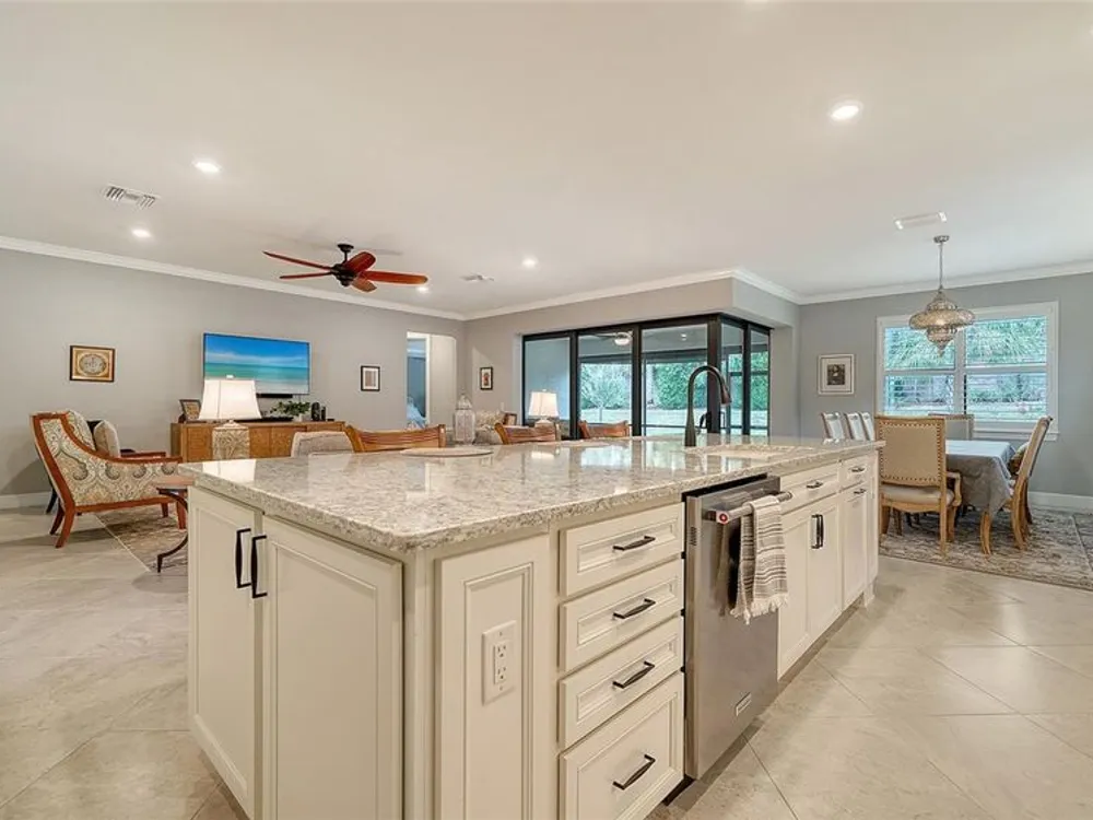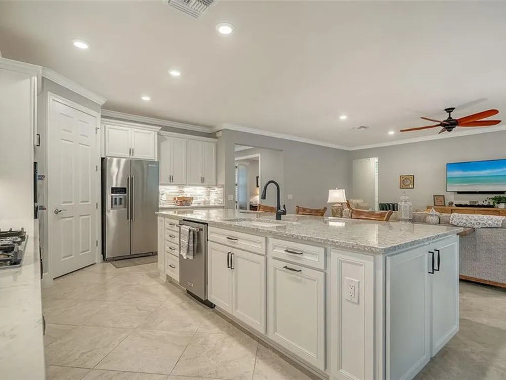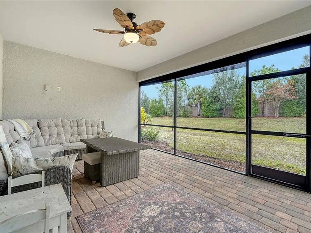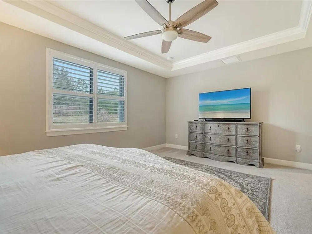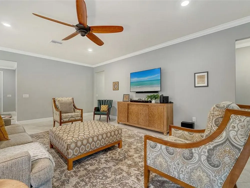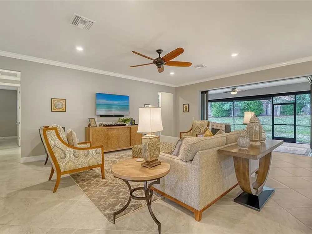 Come see this lovely home located in the gated 55+ Del Webb community in Lakewood Ranch. This popular Pinnacle model offers 3 bedrooms, 3 baths, a den, and gourmet kitchen with many built-ins. The zero corner slider leads to the screened lanai -- a great place where you can enjoy your morning coffee, relax, and entertain guests. The home offers 2488 square feet of living space along with a three-car garage (2 cars plus golf cart). The living areas have tiled floors and crown molding. Bedrooms have carpet. The spacious primary bedroom and ensuite bath has a spacious walk-in closet, large shower, and vanity with dual sinks. The open floor plan has a large gathering area adjacent to the spacious gourmet kitchen, and dinette. The kitchen countertops are quartz with white cabinetry and stainless steel appliances. There is a spacious walk-in pantry. A large island with sink, work space, breakfast bar separate the kitchen from the great room. At one end of the kitchen the dining area has easy access to the lanai. The laundry room has a utility sink and cabinetry along one wall. The home has plantation shutters throughout and hurricane shutters on the windows and doors. The 28,000 square foot Clubhouse is located within walking distance or a short drive. The Clubhouse offers numerous amenities, including, but not limited to a resort-style pool, state-of-the-art fitness center, pickleball and tennis courts, and game rooms. The Sailfish Bar and Grill restaurant offers indoor-outdoor waterfront dining. Del Webb at Lakewood Ranch is located within minutes of Lakewood Ranch Main Street and I-75 for easy access to Benderson Park, UTC shopping, restaurants, and entertainment. It is also just a short distance to Downtown Sarasota, St. Armands, and the beaches.