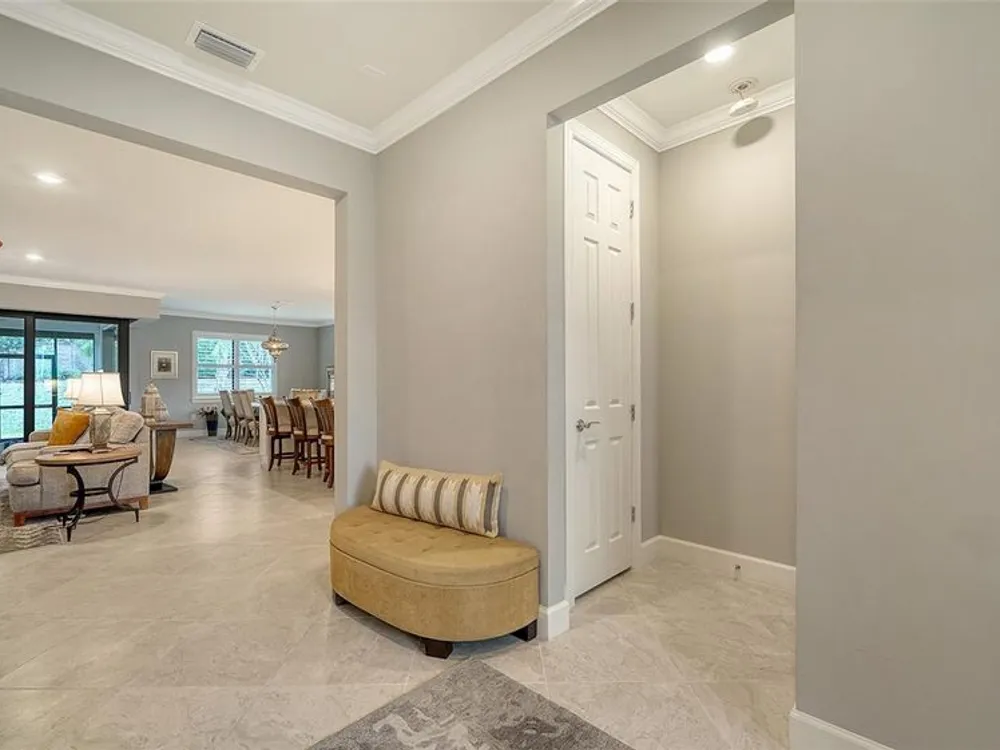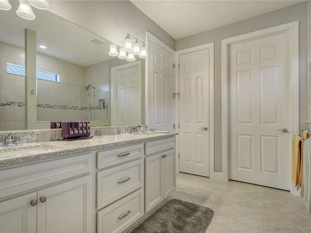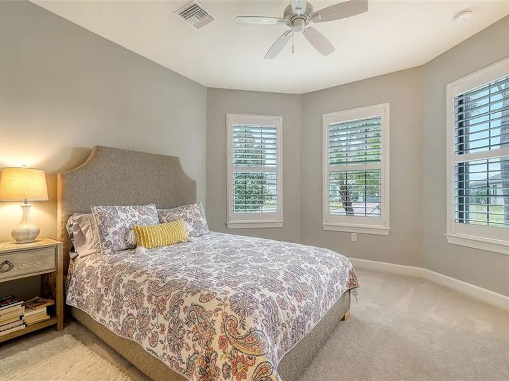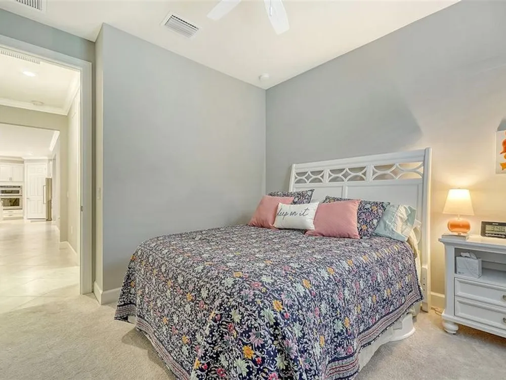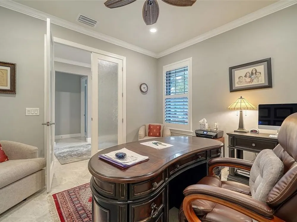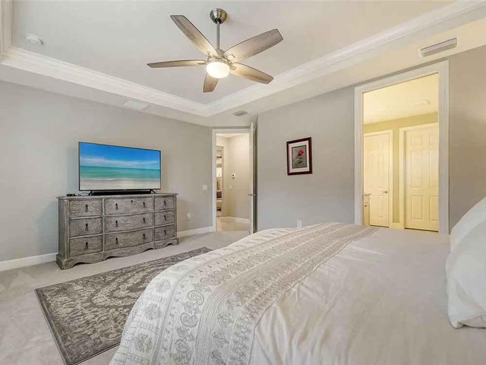 Come see this lovely home located in the gated 55+ Del Webb community in Lakewood Ranch. This popular Pinnacle model offers 3 bedrooms, 3 baths, a den, and gourmet kitchen with many built-ins. The zero corner slider leads to the screened lanai -- a great place where you can enjoy your morning coffee, relax, and entertain guests. The home offers 2488 square feet of living space along with a three-car garage (2 cars plus golf cart). The living areas have tiled floors and crown molding. Bedrooms have carpet. The spacious primary bedroom and ensuite bath has a spacious walk-in closet, large shower, and vanity with dual sinks. The open floor plan has a large gathering area adjacent to the spacious gourmet kitchen, and dinette. The kitchen countertops are quartz with white cabinetry and stainless steel appliances. There is a spacious walk-in pantry. A large island with sink, work space, breakfast bar separate the kitchen from the great room. At one end of the kitchen the dining area has easy access to the lanai. The laundry room has a utility sink and cabinetry along one wall. The home has plantation shutters throughout and hurricane shutters on the windows and doors. The 28,000 square foot Clubhouse is located within walking distance or a short drive. The Clubhouse offers numerous amenities, including, but not limited to a resort-style pool, state-of-the-art fitness center, pickleball and tennis courts, and game rooms. The Sailfish Bar and Grill restaurant offers indoor-outdoor waterfront dining. Del Webb at Lakewood Ranch is located within minutes of Lakewood Ranch Main Street and I-75 for easy access to Benderson Park, UTC shopping, restaurants, and entertainment. It is also just a short distance to Downtown Sarasota, St. Armands, and the beaches.