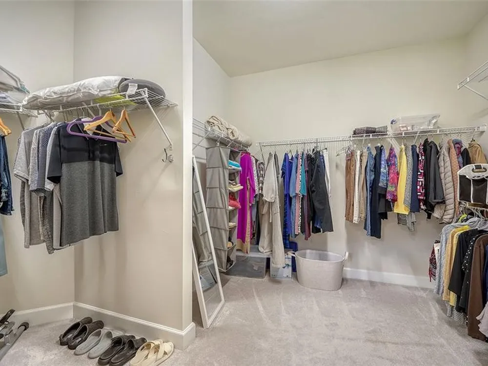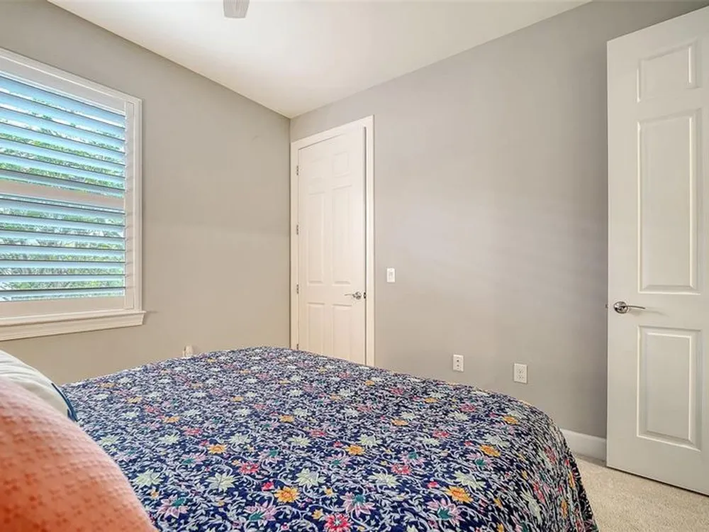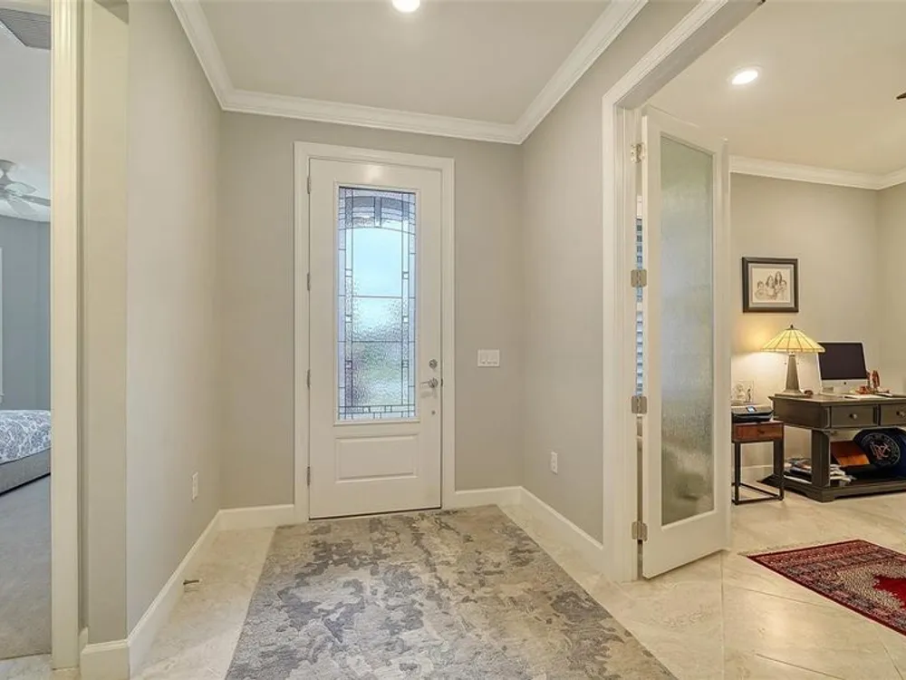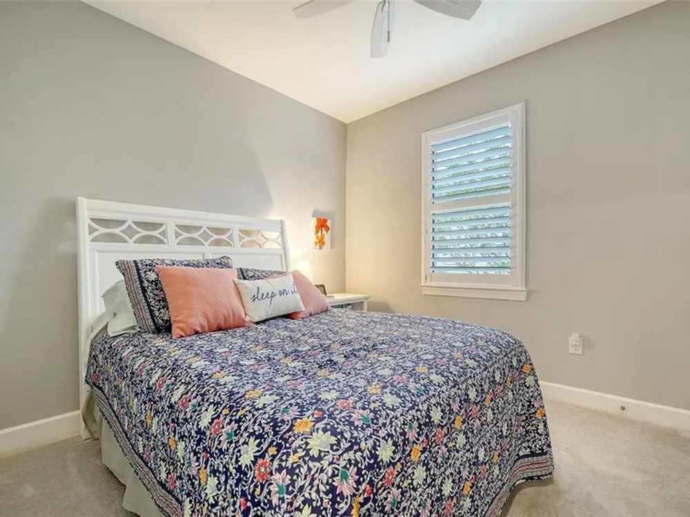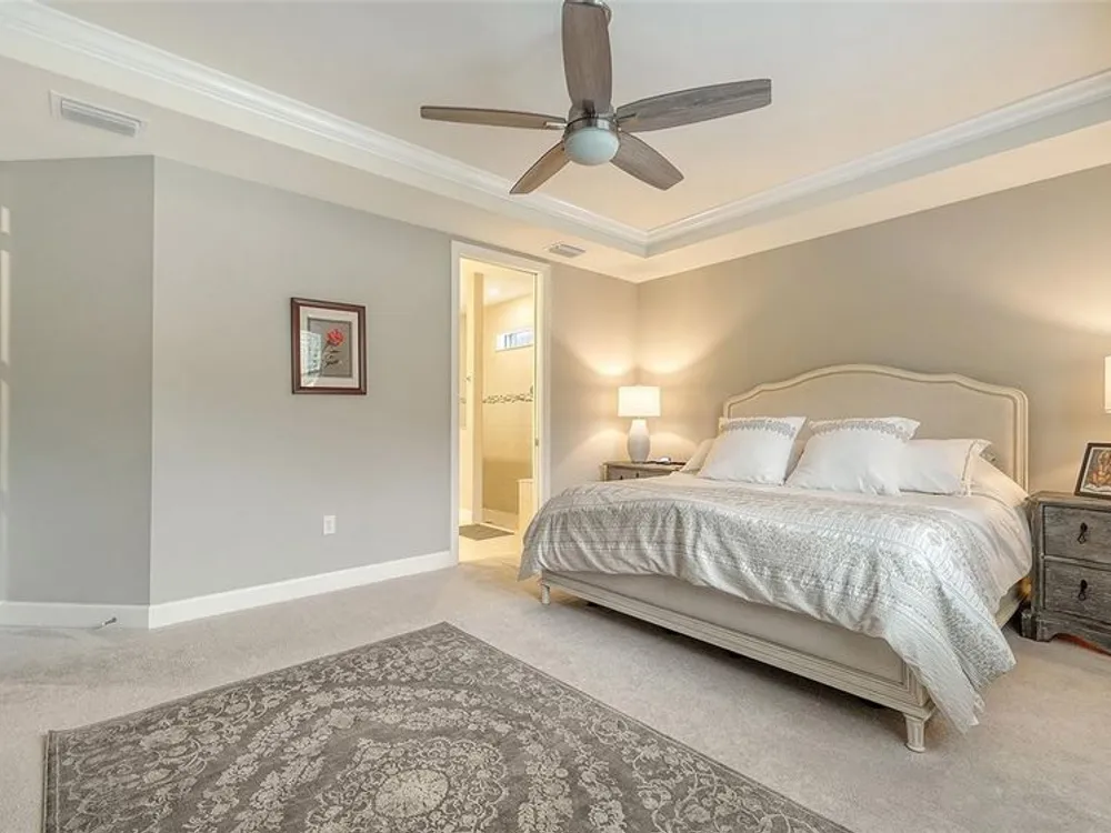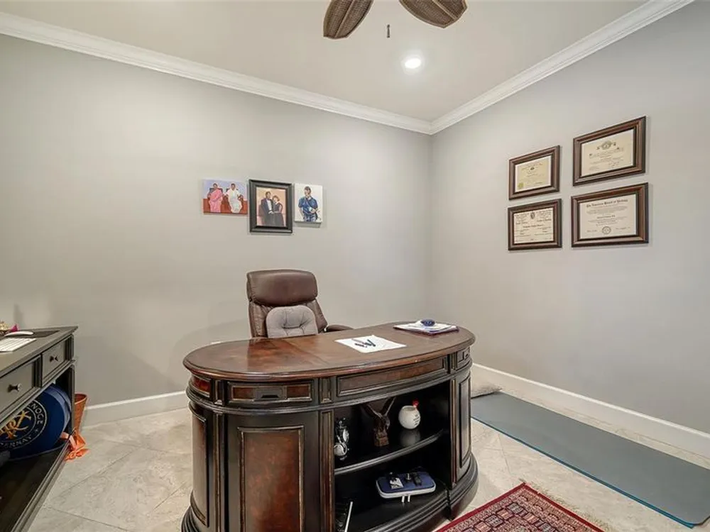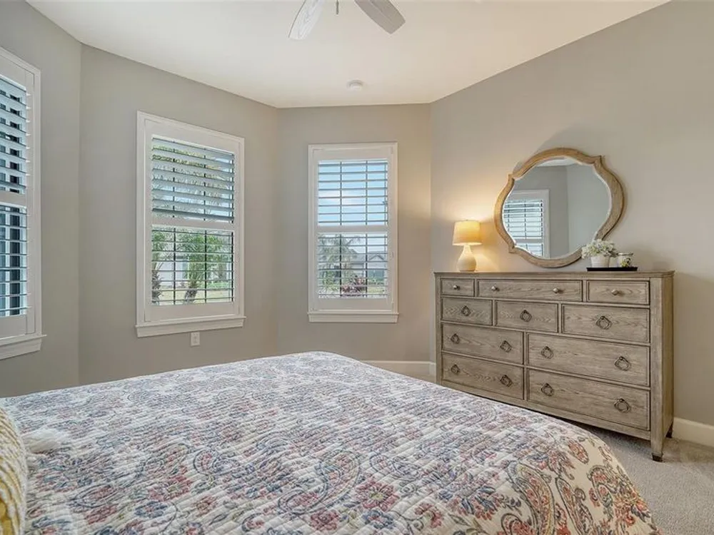 - Ceiling Fan(s), Crown Molding, High Ceilings, Open Floorplan, Solid Surface Counters, Solid-Wood Cabinets, Split Bedrooms, Thermostat, Walk-In Closet(s), Window Treatments