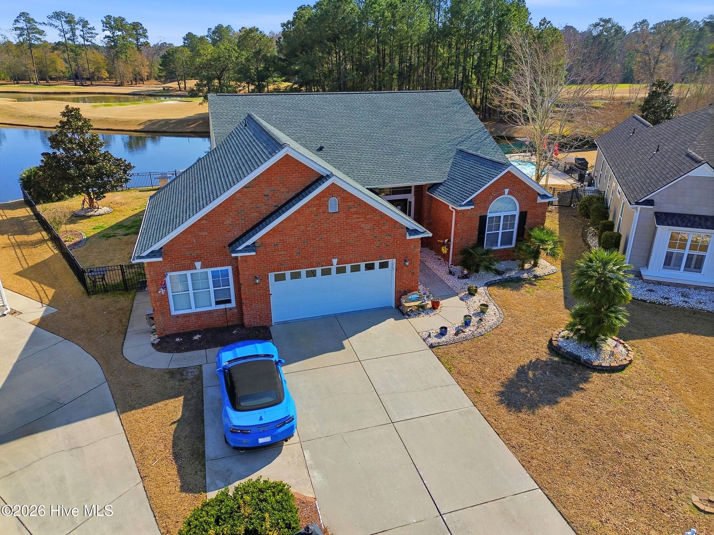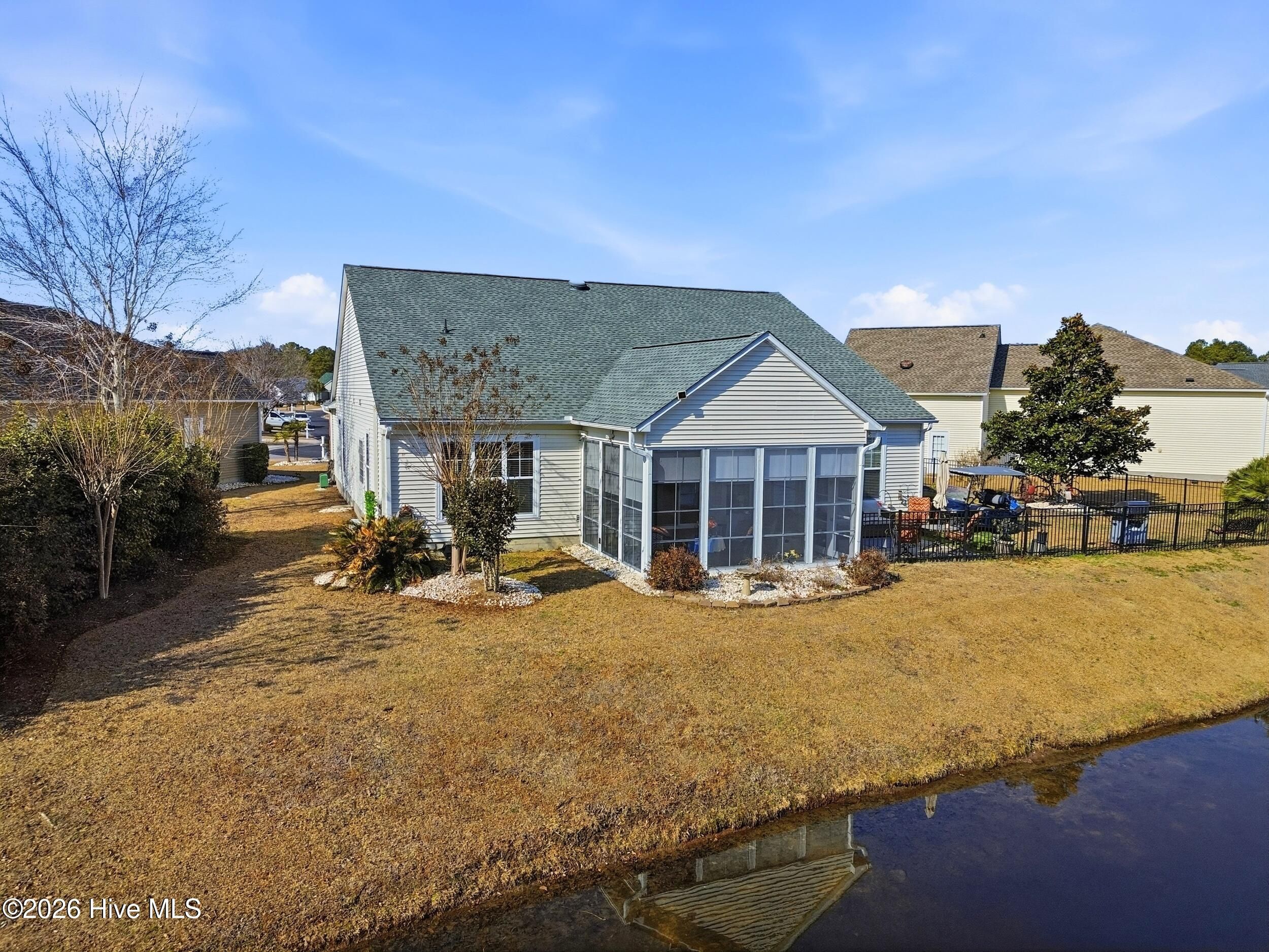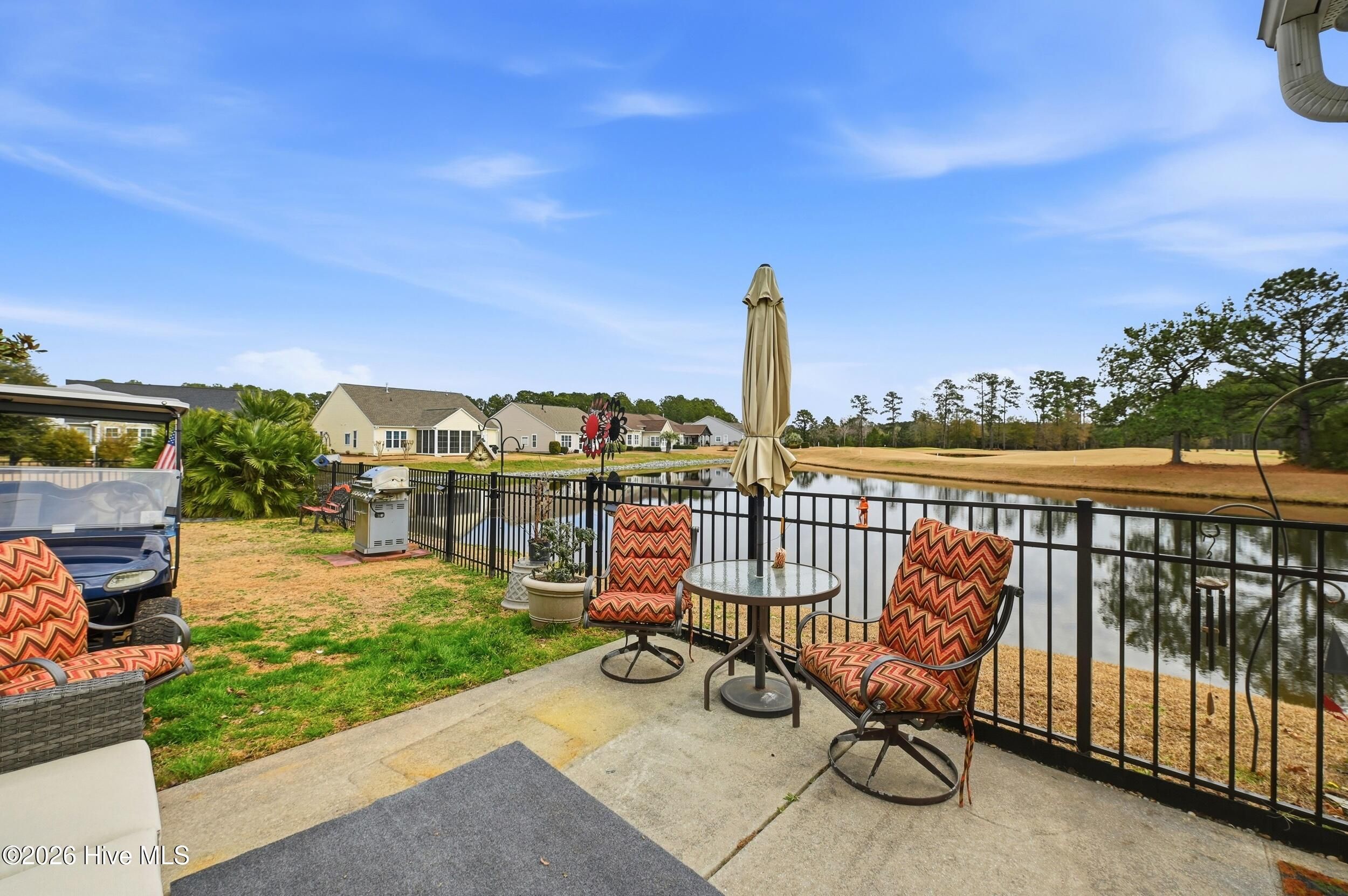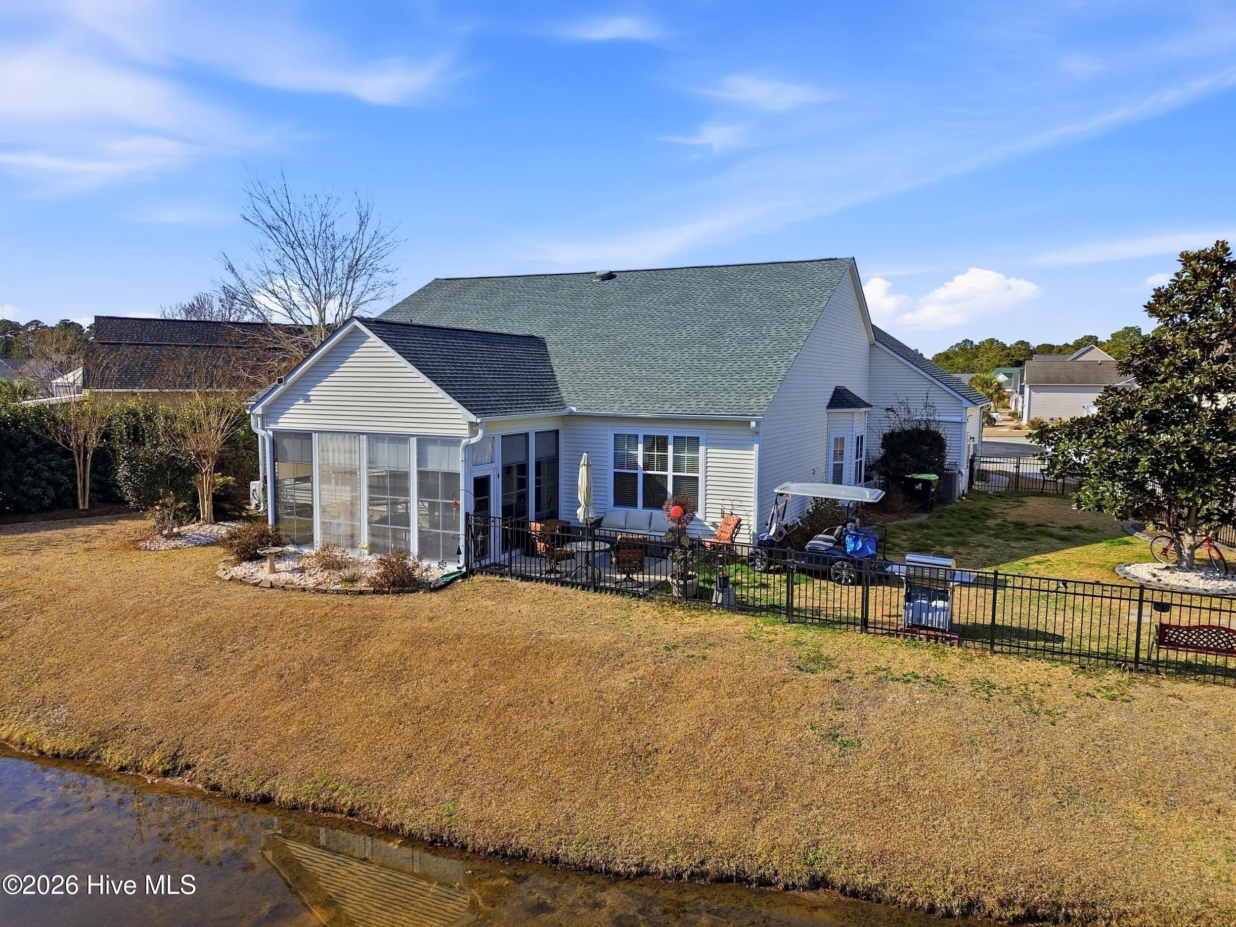 Come see this absolutely gorgeous WATERFRONT home in Meadowlands, offering spectacular Water and GOLF course views! A spacious enclosed sunroom with vinyl windows creates the perfect spot to enjoy morning coffee, read a book, or relax while taking in the serene surroundings. This popular -Newport floor plan-has been meticulously maintained & extensively upgraded. From the moment you enter, you'll love the high-volume ceilings, smooth-finish sheetrock, and abundant natural light. The home features 3 bedrooms, 2 full baths, plus a dedicated office/library that could easily serve as a 4th bedroom. The expanded & widened garage features a mini split, upgraded floors & storage racks, offering incredible space for a workshop, golf cart, motorcycles, kayaks, canoes, or other toys. Designed for a three-car layout, the cul-de-sac lot prevented installation of a third door, while still providing exceptional functionality & storage. Top-notch fixtures, fresh interior paint, & high-end waterproof luxury vinyl plank flooring enhance the home throughout. The spacious primary suite boasts a double tray ceiling & stunning pond & golf course views. The ensuite bath features a brand-new rain shower (Sept 2020), garden tub with remote-controlled shade, raised countertops, comfort-height commodes, & thoughtful upgrades. The roomy kitchen includes, 42'' cabinets, Corian-style solid surface countertops, a large pantry, island with pull-out shelving, & stainless appliances (range, refrigerator, dishwasher - 2020). Additional highlights include HVAC (approx. 2015), new roof (2023), irrigation system, & custom-organized closets. The yard is partially fenced & beautifully landscaped. The majority of the property is located in X Flood Zone, with only a small portion of the yard within the flood zone. Outstanding amenities, including a clubhouse, pool, fitness center, & recreation room. This incredible home with breathtaking views is truly special—& ready to become yours!