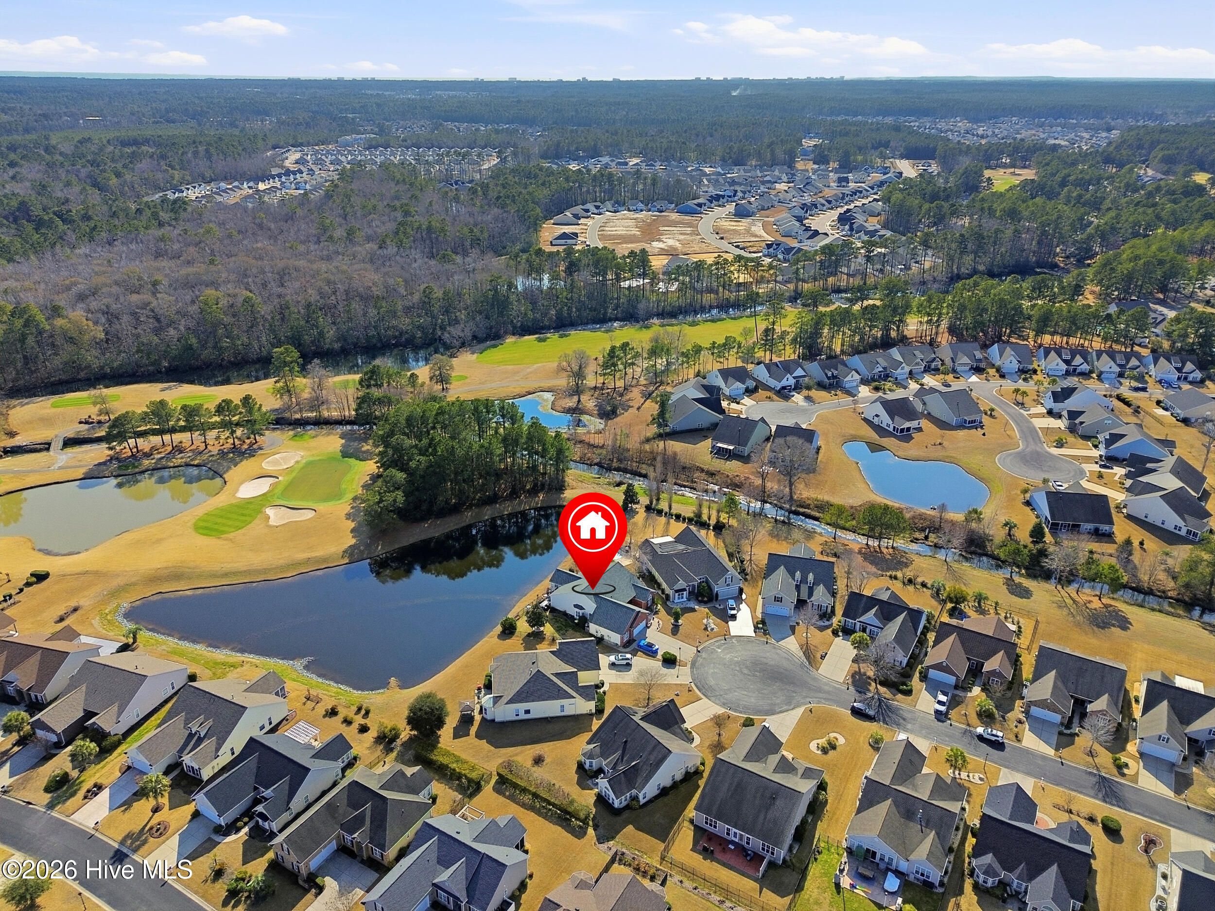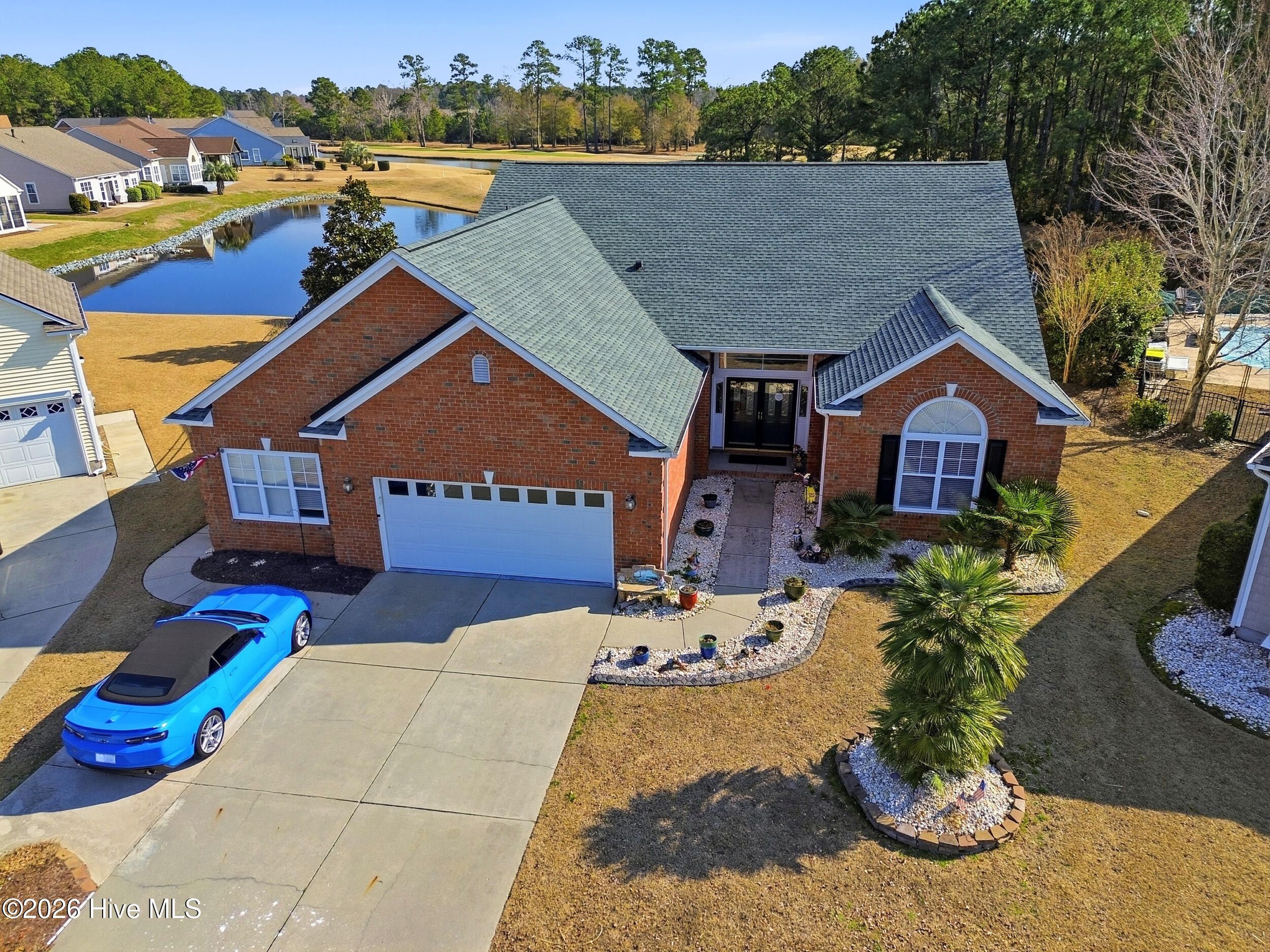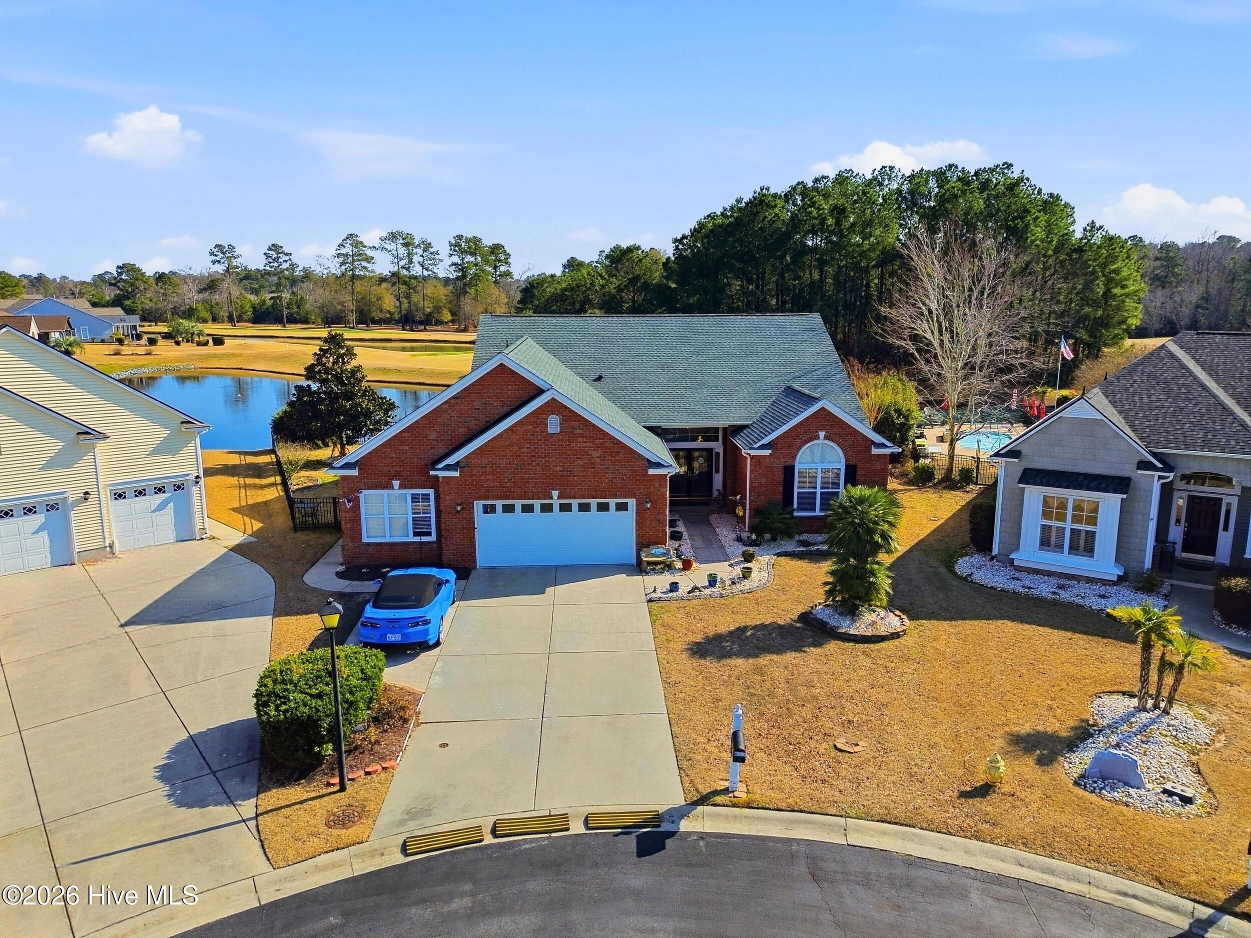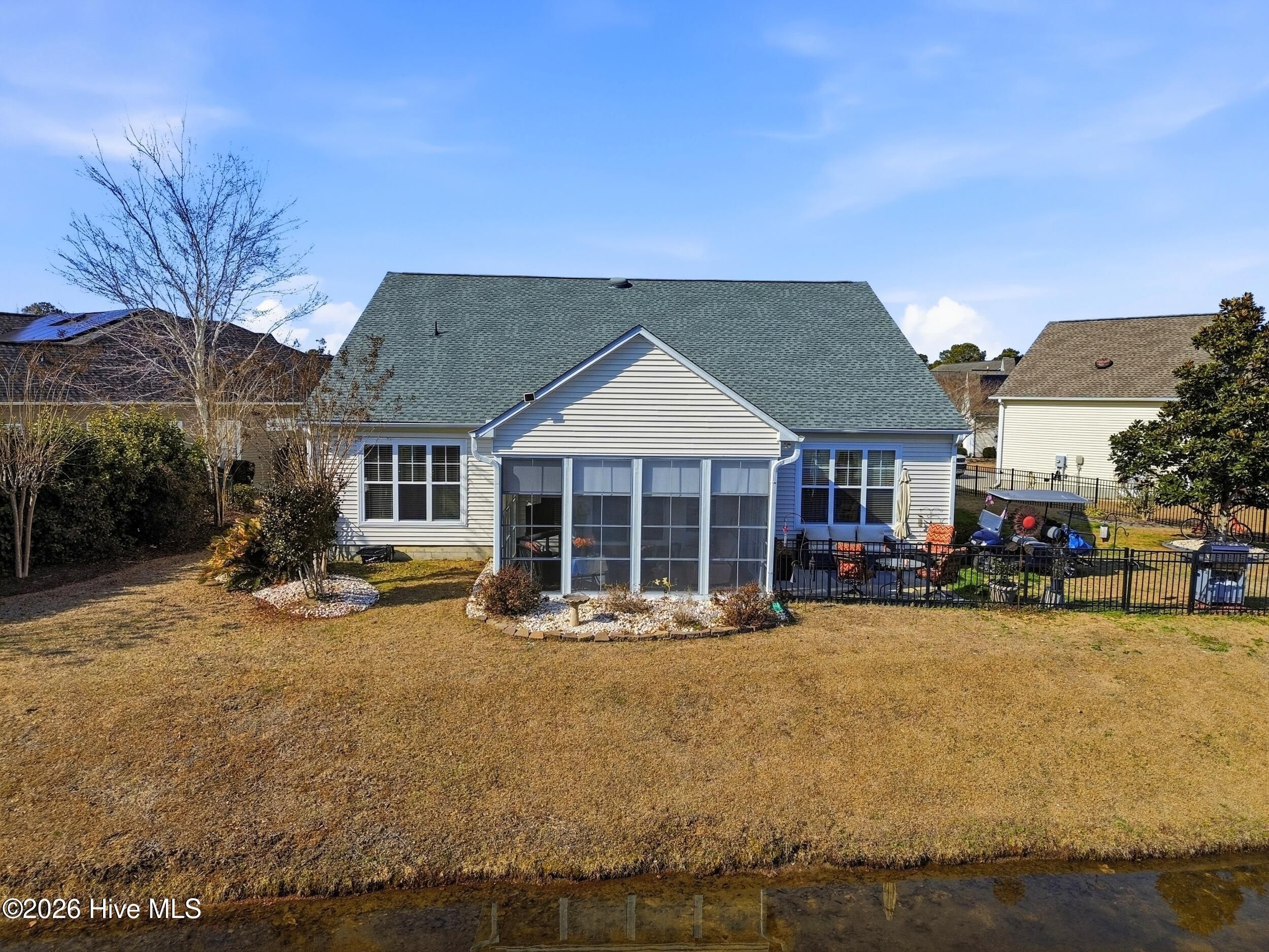 Come see this absolutely gorgeous WATERFRONT home in Meadowlands, offering spectacular Water and GOLF course views! A spacious enclosed sunroom with vinyl windows creates the perfect spot to enjoy morning coffee, read a book, or relax while taking in the serene surroundings. This popular -Newport floor plan-has been meticulously maintained & extensively upgraded. From the moment you enter, you'll love the high-volume ceilings, smooth-finish sheetrock, and abundant natural light. The home features 3 bedrooms, 2 full baths, plus a dedicated office/library that could easily serve as a 4th bedroom. The expanded & widened garage features a mini split, upgraded floors & storage racks, offering incredible space for a workshop, golf cart, motorcycles, kayaks, canoes, or other toys. Designed for a three-car layout, the cul-de-sac lot prevented installation of a third door, while still providing exceptional functionality & storage. Top-notch fixtures, fresh interior paint, & high-end waterproof luxury vinyl plank flooring enhance the home throughout. The spacious primary suite boasts a double tray ceiling & stunning pond & golf course views. The ensuite bath features a brand-new rain shower (Sept 2020), garden tub with remote-controlled shade, raised countertops, comfort-height commodes, & thoughtful upgrades. The roomy kitchen includes, 42'' cabinets, Corian-style solid surface countertops, a large pantry, island with pull-out shelving, & stainless appliances (range, refrigerator, dishwasher - 2020). Additional highlights include HVAC (approx. 2015), new roof (2023), irrigation system, & custom-organized closets. The yard is partially fenced & beautifully landscaped. The majority of the property is located in X Flood Zone, with only a small portion of the yard within the flood zone. Outstanding amenities, including a clubhouse, pool, fitness center, & recreation room. This incredible home with breathtaking views is truly special—& ready to become yours!