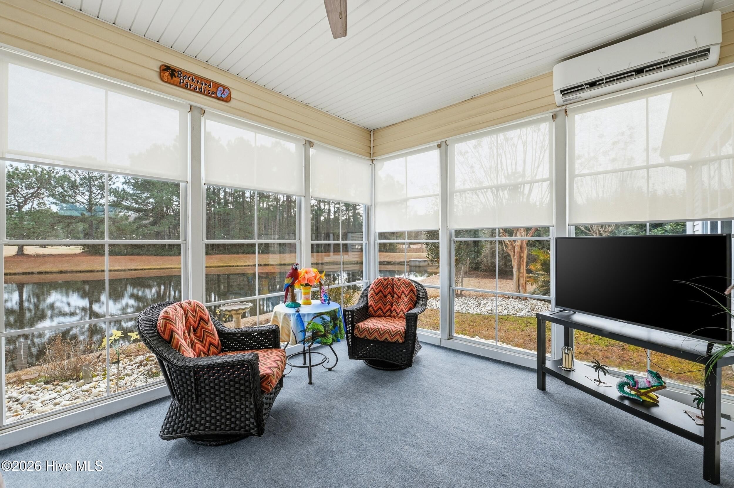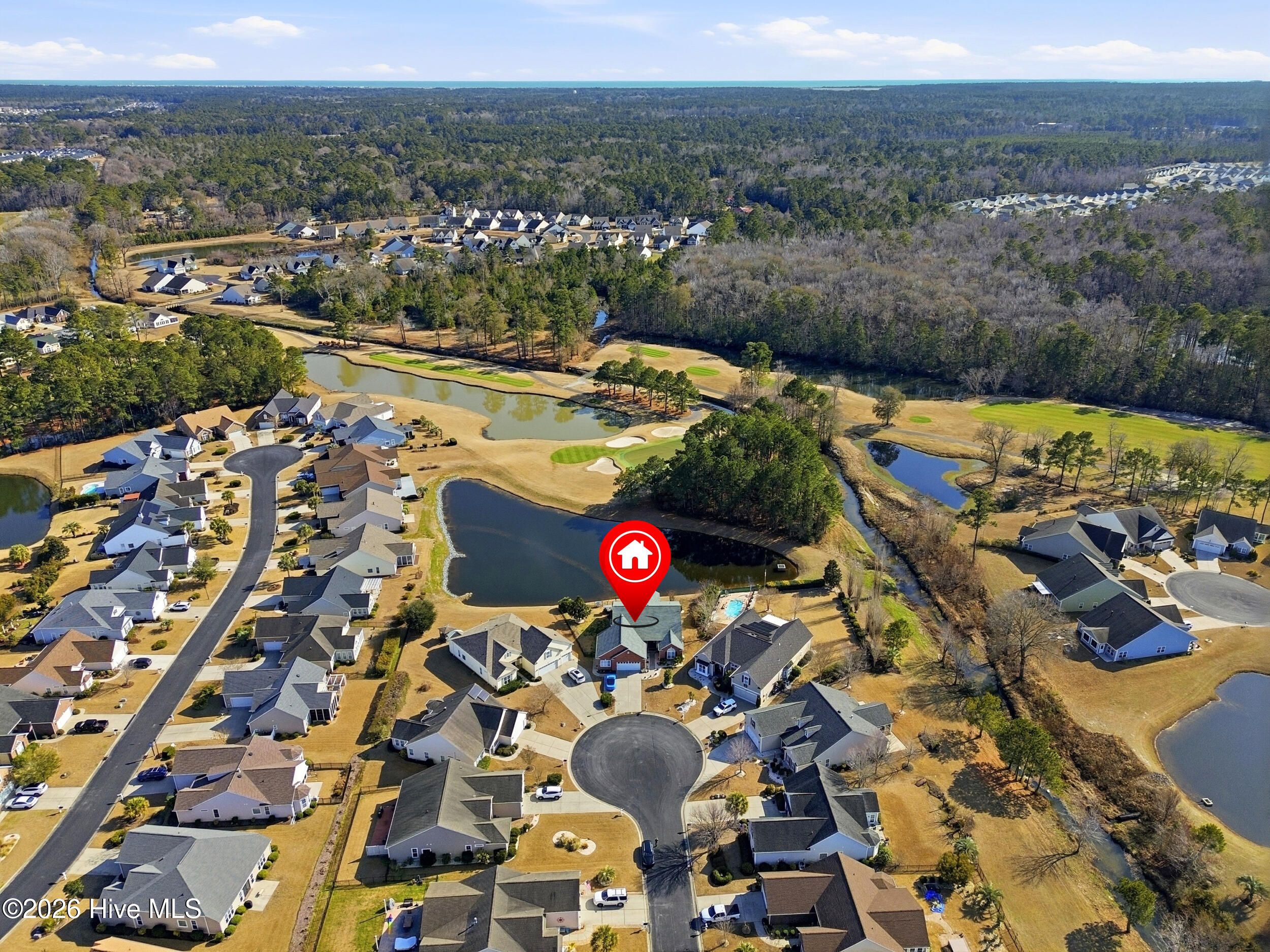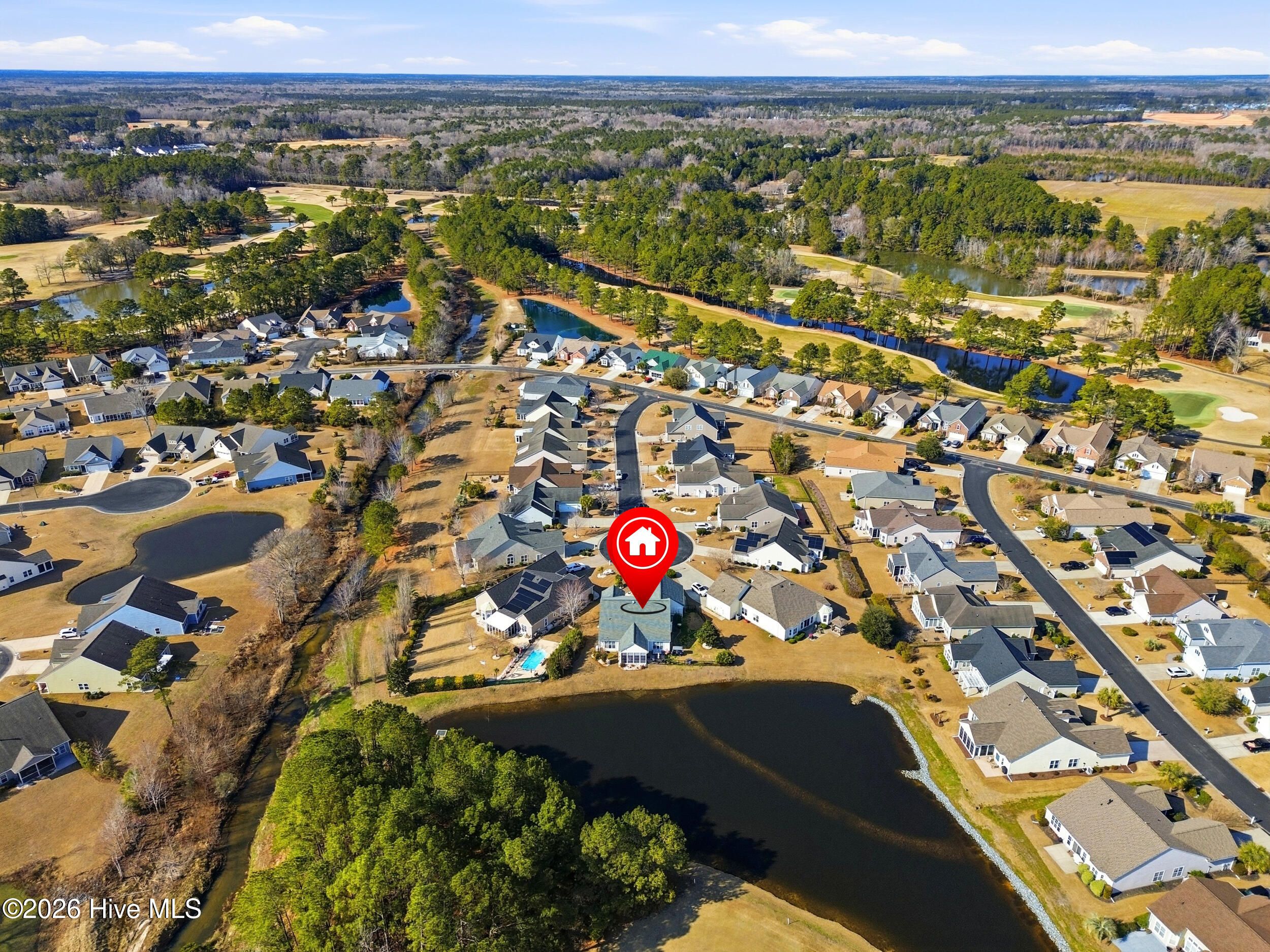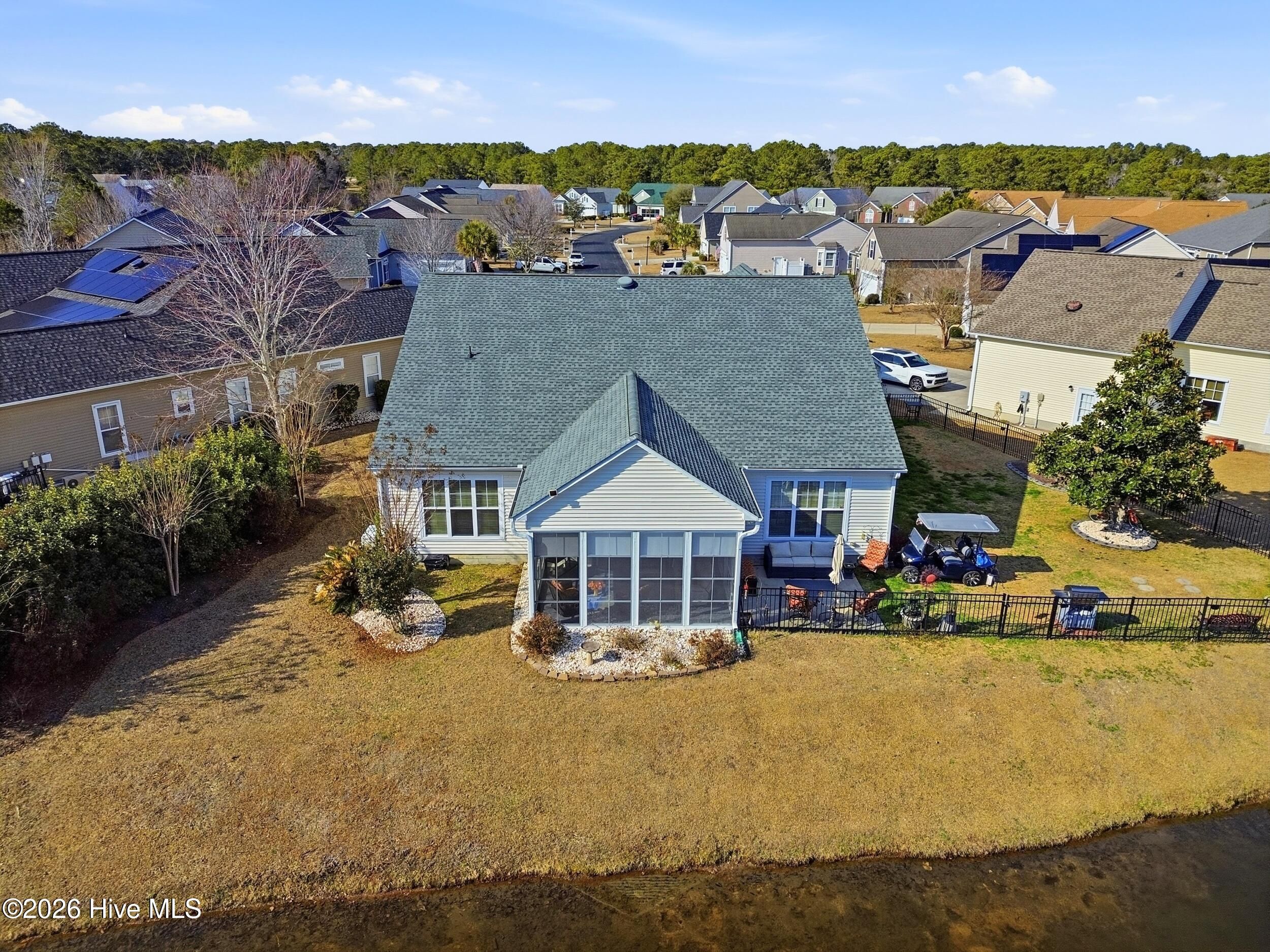 Come see this absolutely gorgeous WATERFRONT home in Meadowlands, offering spectacular Water and GOLF course views! A spacious enclosed sunroom with vinyl windows creates the perfect spot to enjoy morning coffee, read a book, or relax while taking in the serene surroundings. This popular -Newport floor plan-has been meticulously maintained & extensively upgraded. From the moment you enter, you'll love the high-volume ceilings, smooth-finish sheetrock, and abundant natural light. The home features 3 bedrooms, 2 full baths, plus a dedicated office/library that could easily serve as a 4th bedroom. The expanded & widened garage features a mini split, upgraded floors & storage racks, offering incredible space for a workshop, golf cart, motorcycles, kayaks, canoes, or other toys. Designed for a three-car layout, the cul-de-sac lot prevented installation of a third door, while still providing exceptional functionality & storage. Top-notch fixtures, fresh interior paint, & high-end waterproof luxury vinyl plank flooring enhance the home throughout. The spacious primary suite boasts a double tray ceiling & stunning pond & golf course views. The ensuite bath features a brand-new rain shower (Sept 2020), garden tub with remote-controlled shade, raised countertops, comfort-height commodes, & thoughtful upgrades. The roomy kitchen includes, 42'' cabinets, Corian-style solid surface countertops, a large pantry, island with pull-out shelving, & stainless appliances (range, refrigerator, dishwasher - 2020). Additional highlights include HVAC (approx. 2015), new roof (2023), irrigation system, & custom-organized closets. The yard is partially fenced & beautifully landscaped. The majority of the property is located in X Flood Zone, with only a small portion of the yard within the flood zone. Outstanding amenities, including a clubhouse, pool, fitness center, & recreation room. This incredible home with breathtaking views is truly special—& ready to become yours!