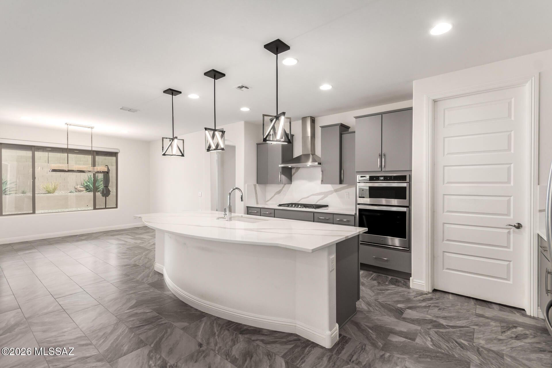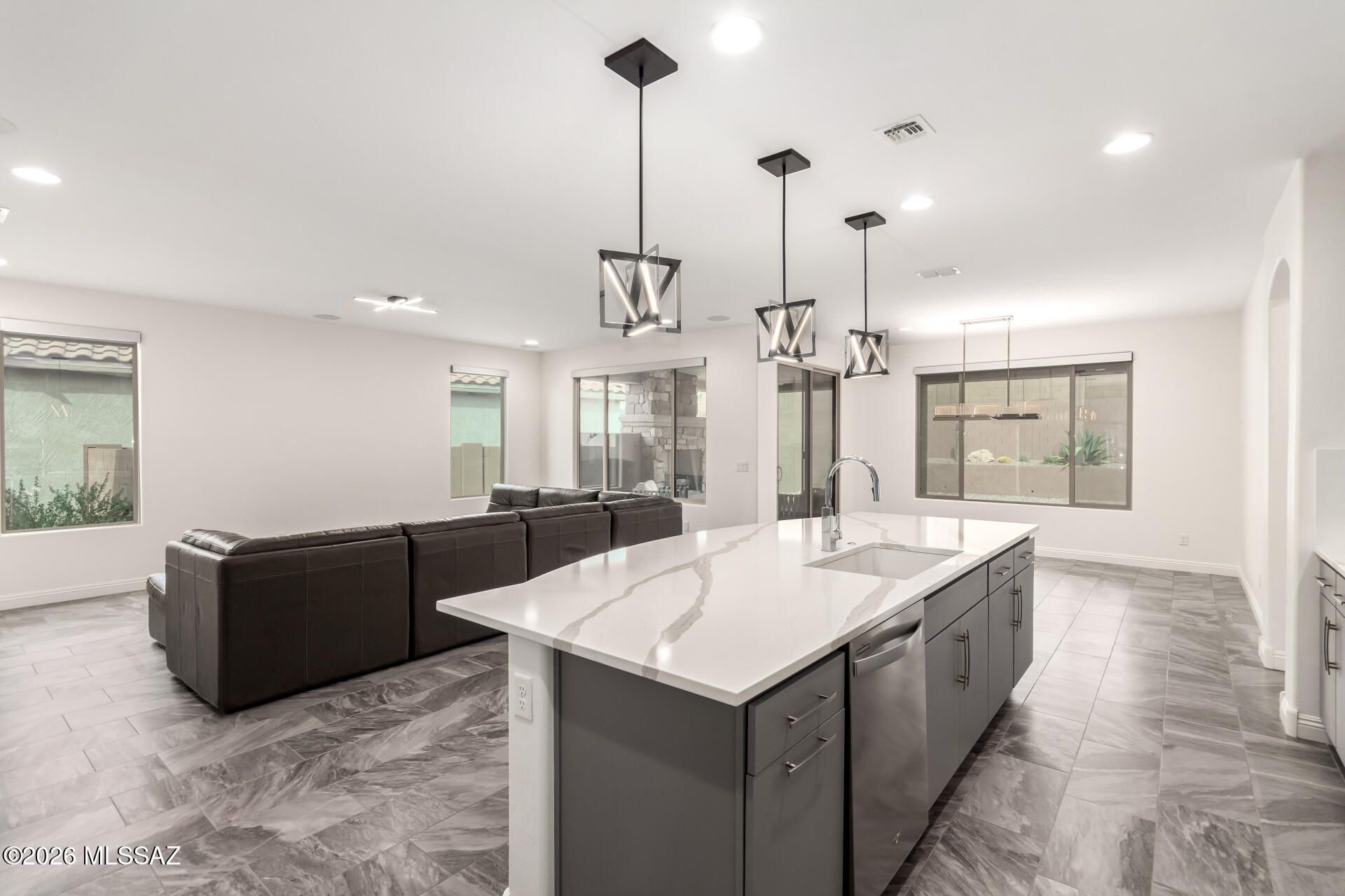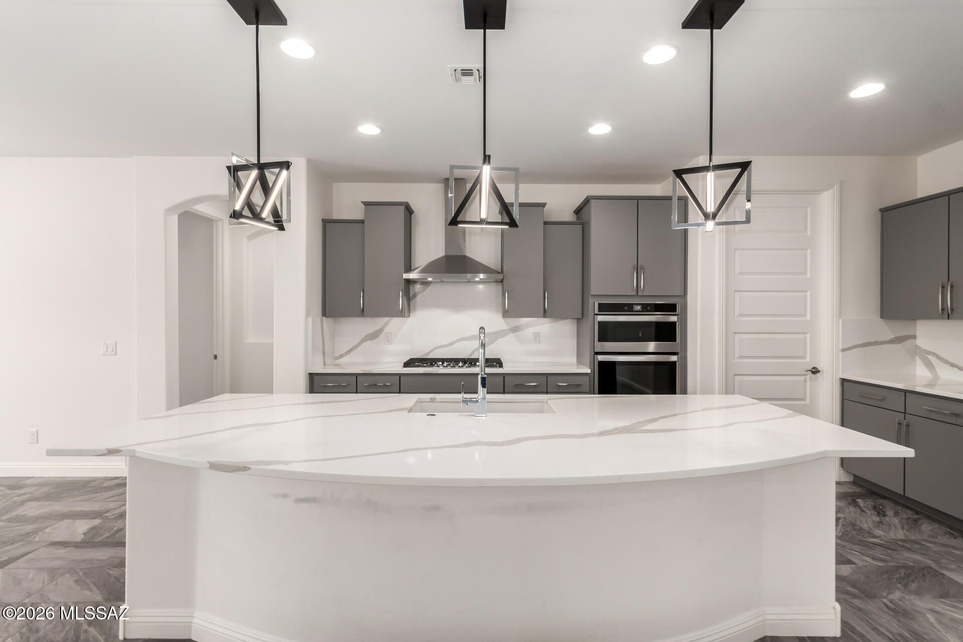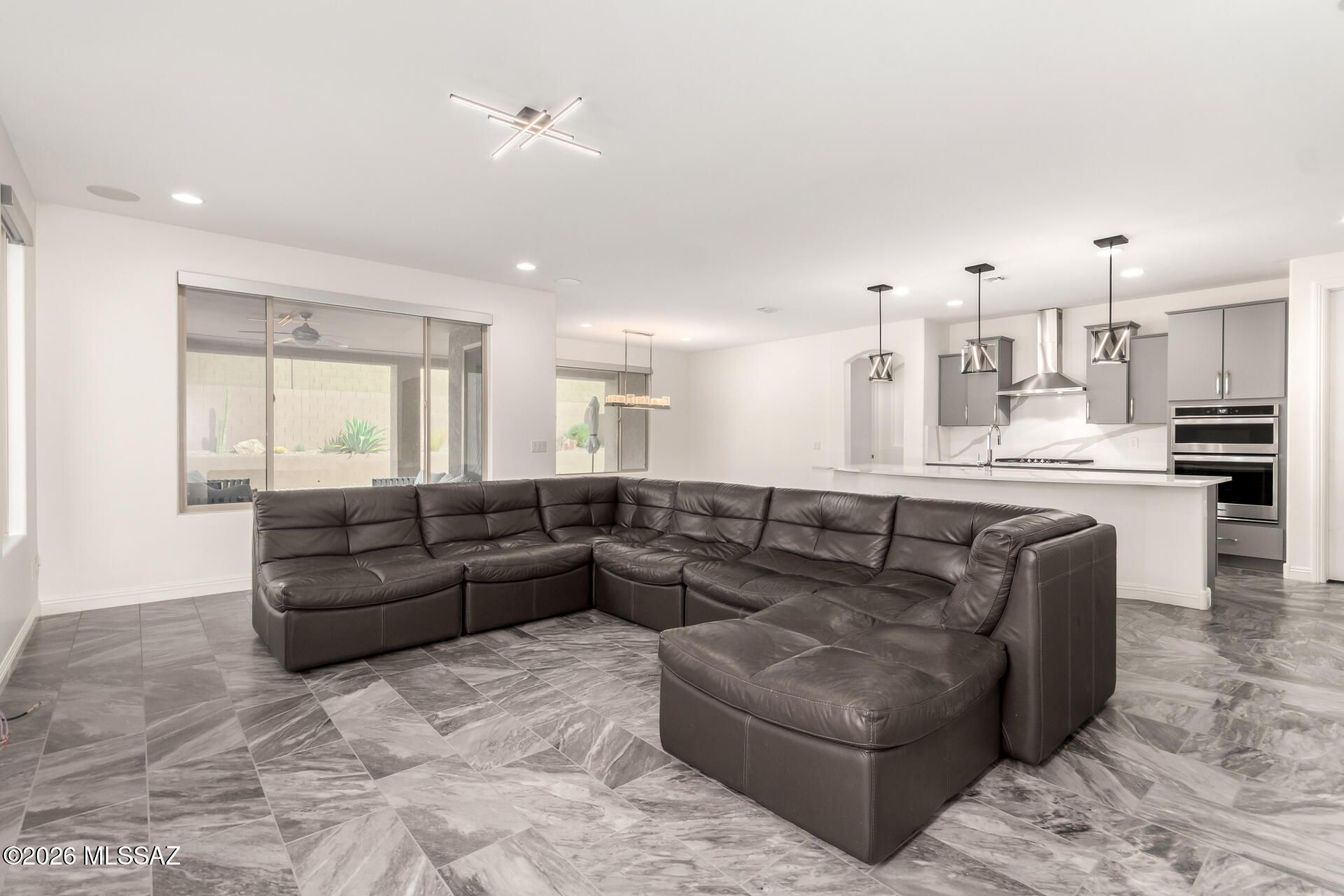 Gorgeous home in the 55+ Active Adult Community of Del Webb at Dove Mountain with beautiful views! Modern Comfort Meets Thoughtful Design on a Large Private Lot. Welcome to this beautifully upgraded 2,010 sq. ft. home offering 2 bedrooms + a dedicated/ flexible office and 2 full bathrooms. The home features quartz countertops and a matching backsplash, complemented by sleek flat-panel cabinetry and a hands-free kitchen faucet. Tile flooring throughout the entire house adds durability and a clean, contemporary look, while arched doorways provide architectural character and warmth. Both bedrooms include professional built-out closets, maximizing storage and organization. Step outside to enjoy a large lot with a private backyard. The standout feature is the outdoor stone