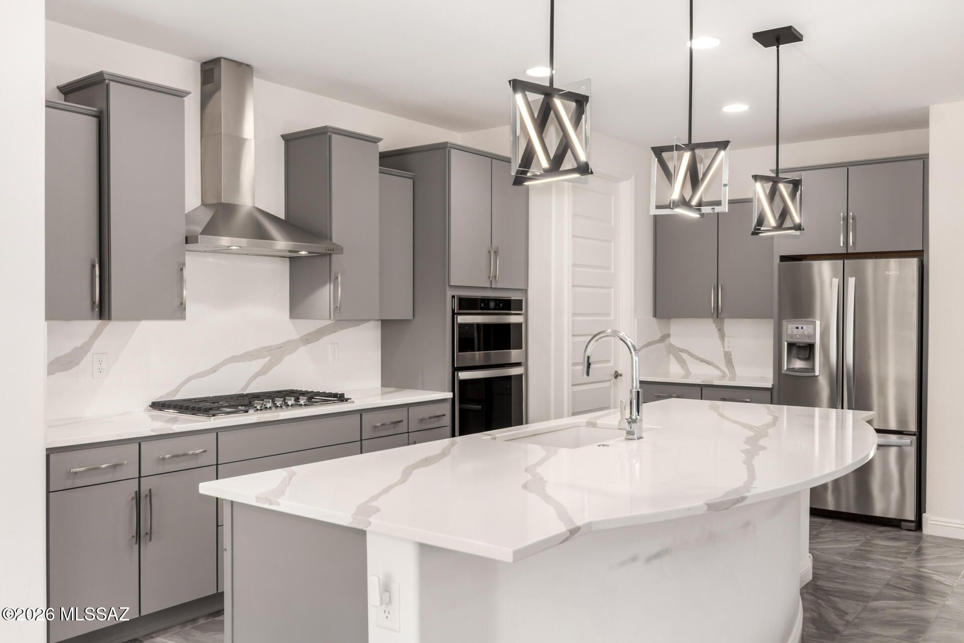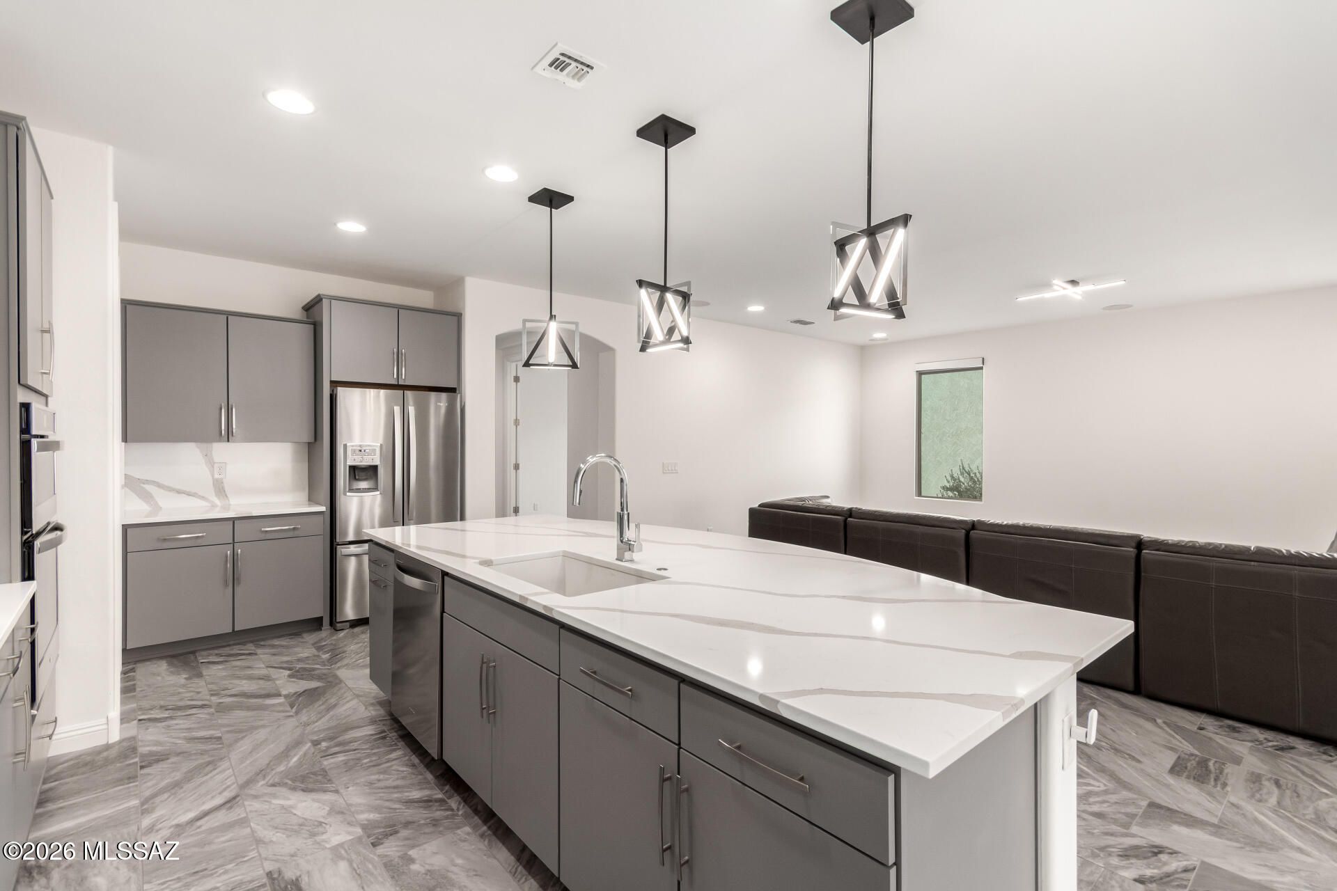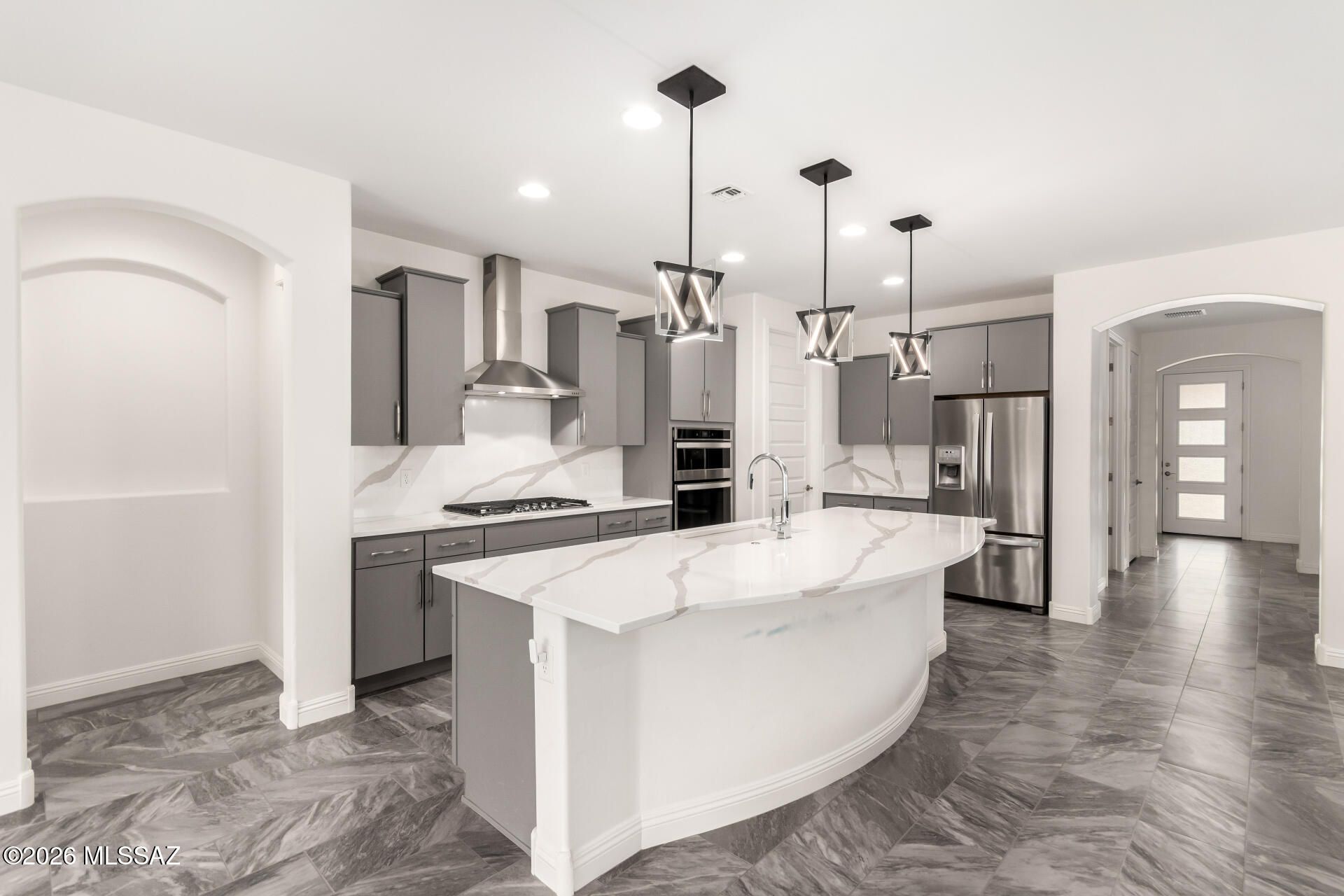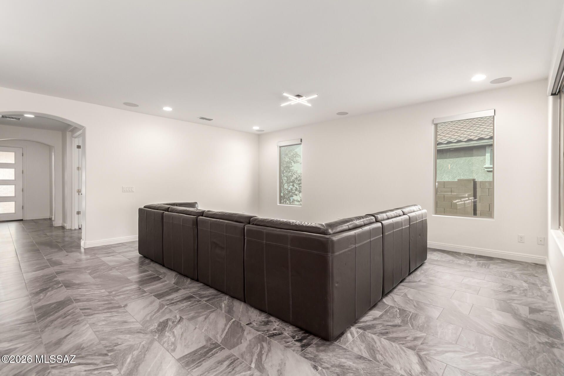 Gorgeous home in the 55+ Active Adult Community of Del Webb at Dove Mountain with beautiful views! Modern Comfort Meets Thoughtful Design on a Large Private Lot. Welcome to this beautifully upgraded 2,010 sq. ft. home offering 2 bedrooms + a dedicated/ flexible office and 2 full bathrooms. The home features quartz countertops and a matching backsplash, complemented by sleek flat-panel cabinetry and a hands-free kitchen faucet. Tile flooring throughout the entire house adds durability and a clean, contemporary look, while arched doorways provide architectural character and warmth. Both bedrooms include professional built-out closets, maximizing storage and organization. Step outside to enjoy a large lot with a private backyard. The standout feature is the outdoor stone