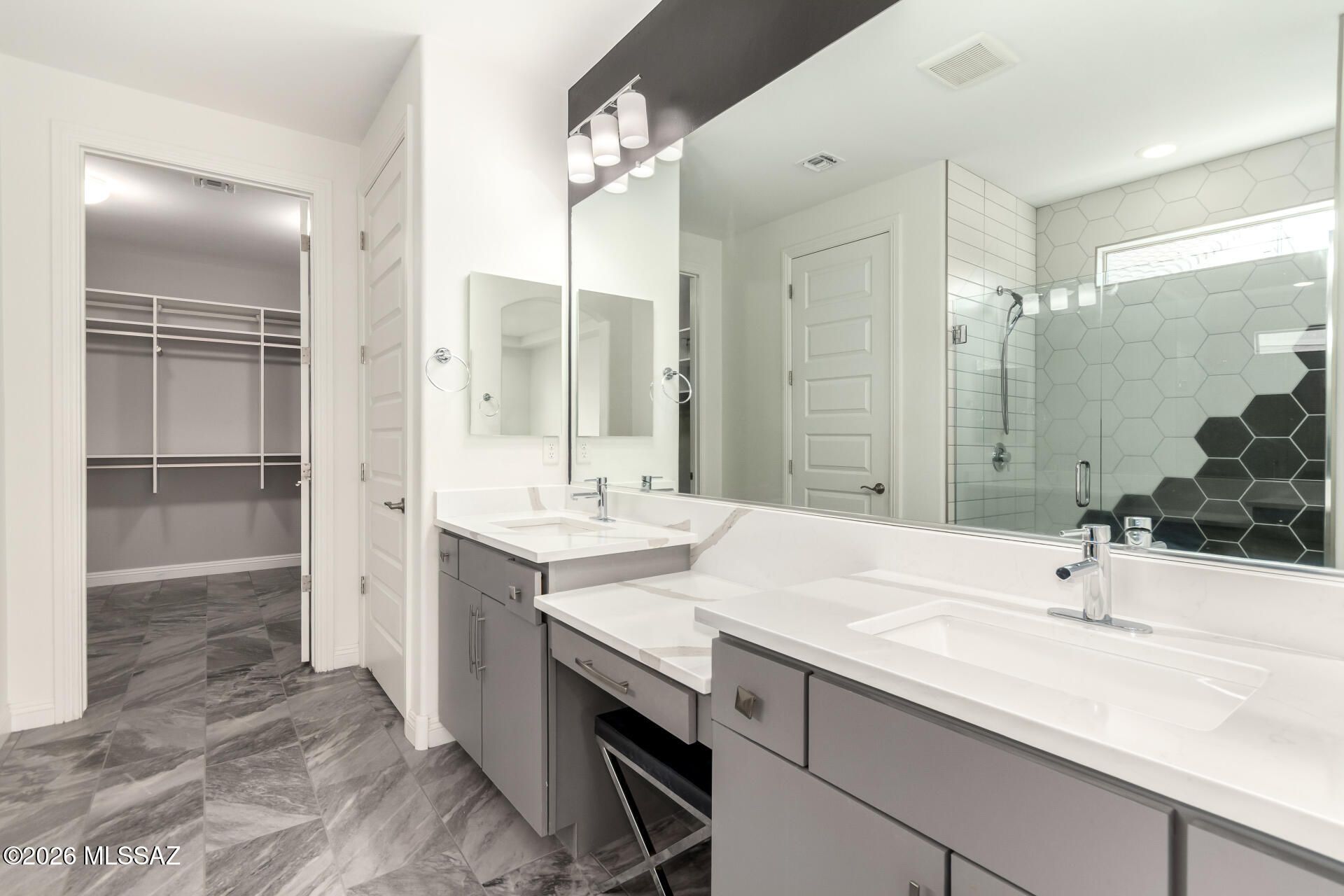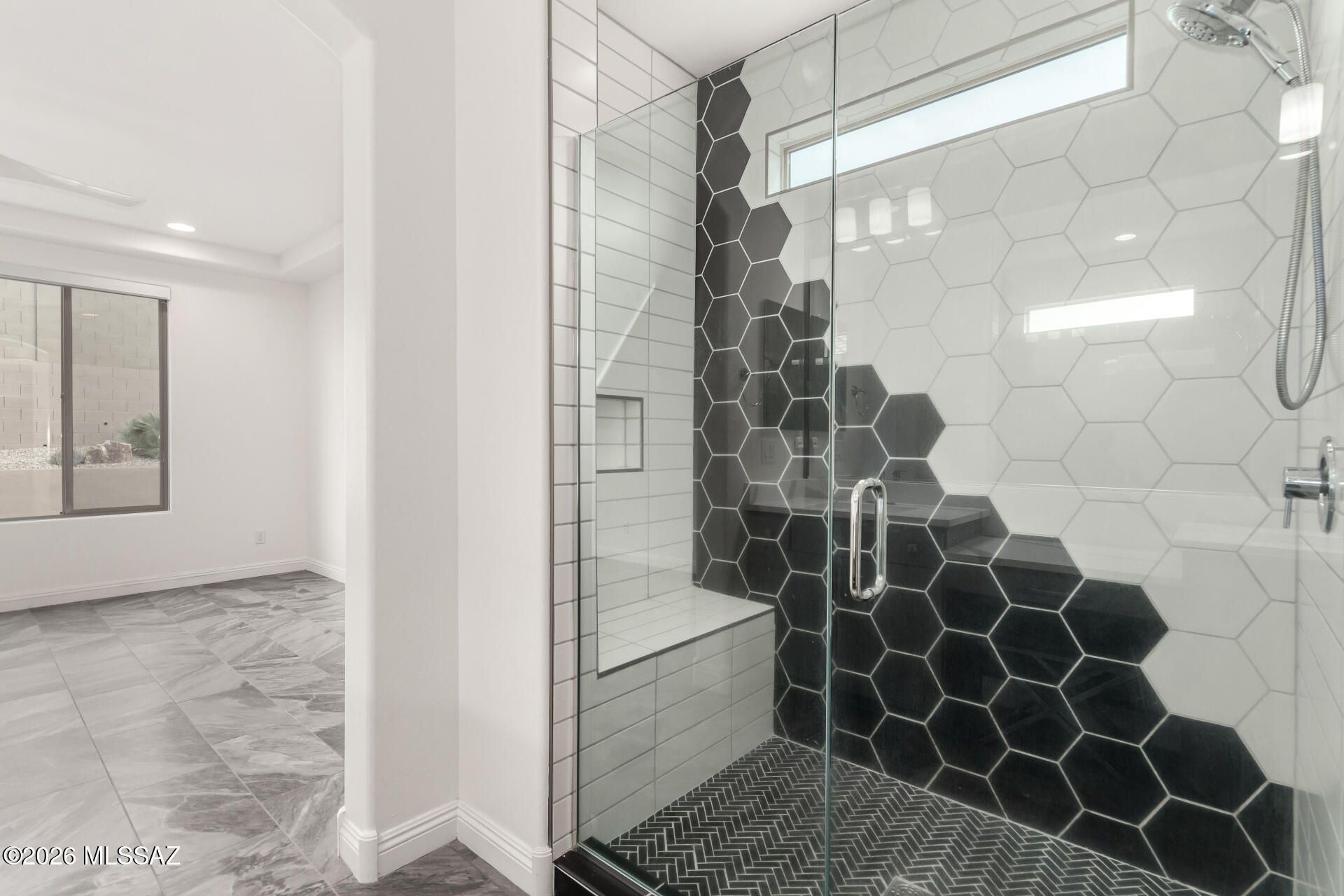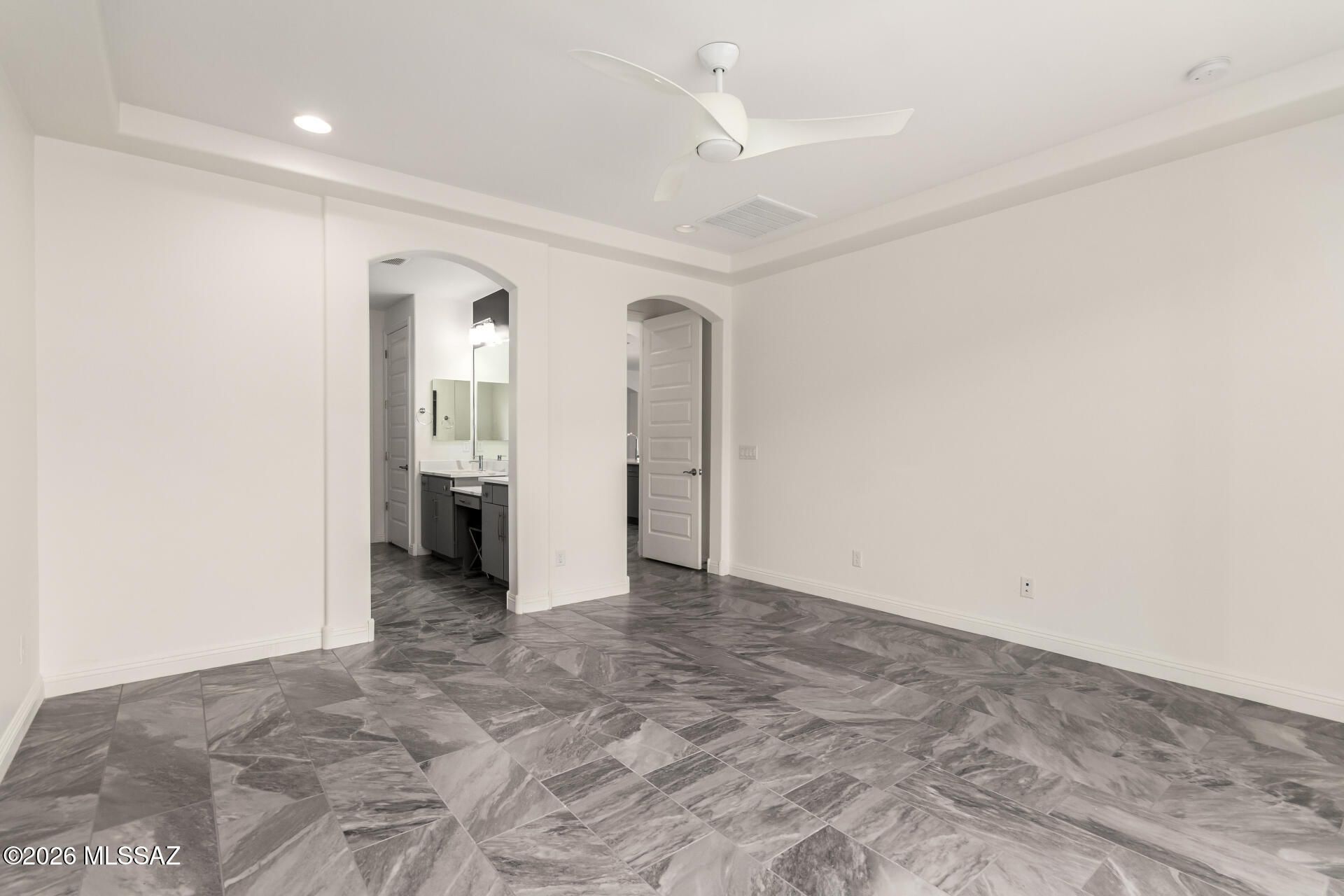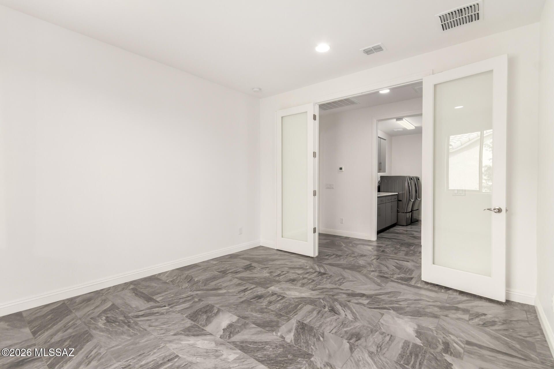 Gorgeous home in the 55+ Active Adult Community of Del Webb at Dove Mountain with beautiful views! Modern Comfort Meets Thoughtful Design on a Large Private Lot. Welcome to this beautifully upgraded 2,010 sq. ft. home offering 2 bedrooms + a dedicated/ flexible office and 2 full bathrooms. The home features quartz countertops and a matching backsplash, complemented by sleek flat-panel cabinetry and a hands-free kitchen faucet. Tile flooring throughout the entire house adds durability and a clean, contemporary look, while arched doorways provide architectural character and warmth. Both bedrooms include professional built-out closets, maximizing storage and organization. Step outside to enjoy a large lot with a private backyard. The standout feature is the outdoor stone
