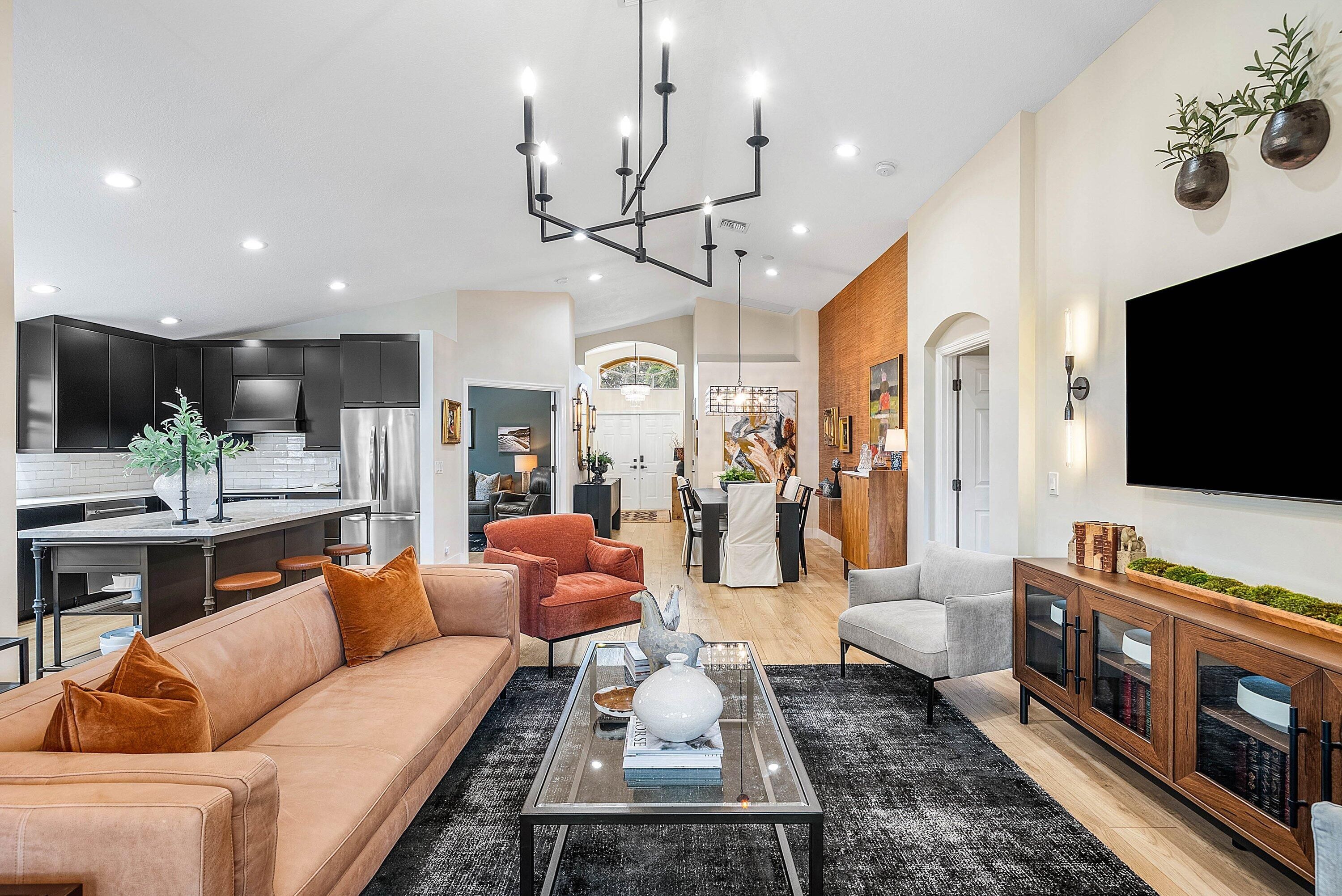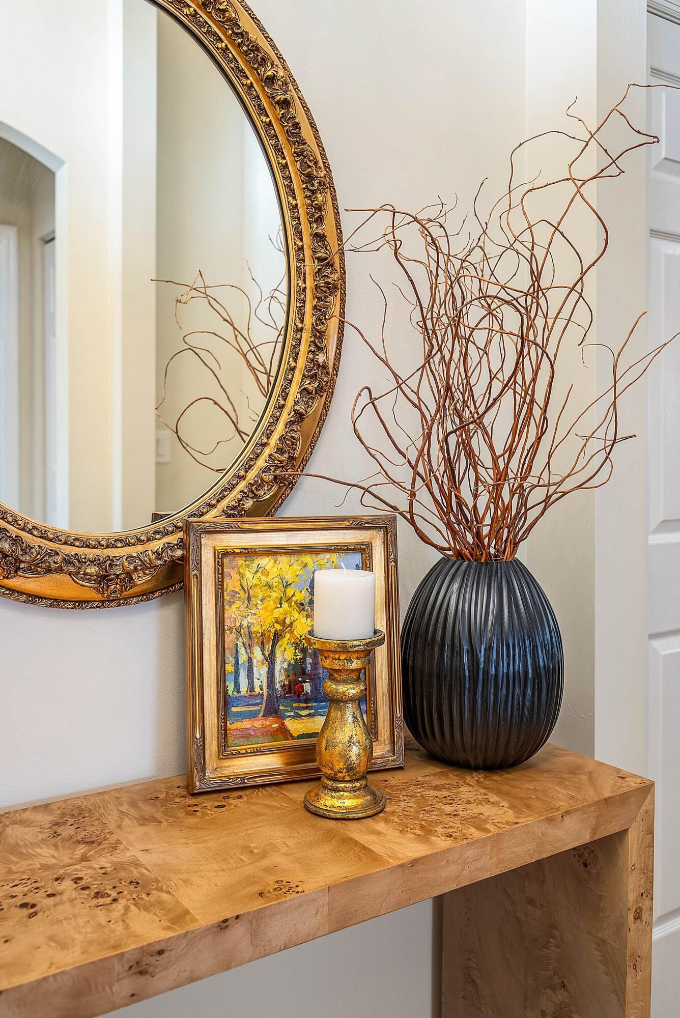 Welcome to 6847 Viale Elizabeth, an exceptionally renovated, magazine worthy single family home in Villa Borghese, an active 55+ community with a 24/7 manned guard gate. This home features 3 bedrooms or 2 bedrooms plus a den/home office and 2 baths, with modern design finishes and comfort. The entry sets the tone: wide plank wood like floors, designer lighting from Pottery Barn, Arhaus and RH, fresh paint and an expansive sightline that draws the eye directly to the private, oak tree lined backyard, with beautiful side easement . The kitchen is a masterpiece— a free standing marble and iron island, sleek black modern soft close cabinetry, induction stove top, KitchenAid SS appliances, all open concept. New AC in 2024 with 10 year warranty, private laundry with LG washer and dryer. The primary bedroom is oversized and features an en suite with roman tub and double sinks. Plantation shutters throughout, for an elegant touch. Further, new door and hinge hardware throughout! Every window on the exterior has accordion hurricane protection shutters. Enjoy this property this season relaxing on the private screened in lanai with TV and fan, and outdoor side space to add an herb garden or BBQ grille. This property is one of a kind! Monthly HOA fee includes AT&T Direct TV plus internet, landline, monitored ADT home security system, lawn maintenance, pressure wash roof and driveway. The community offers a beautiful and active clubhouse, full-time on-site management, a resort style pool, fitness center, billiards, library, bocce, pickleball and tennis courts.