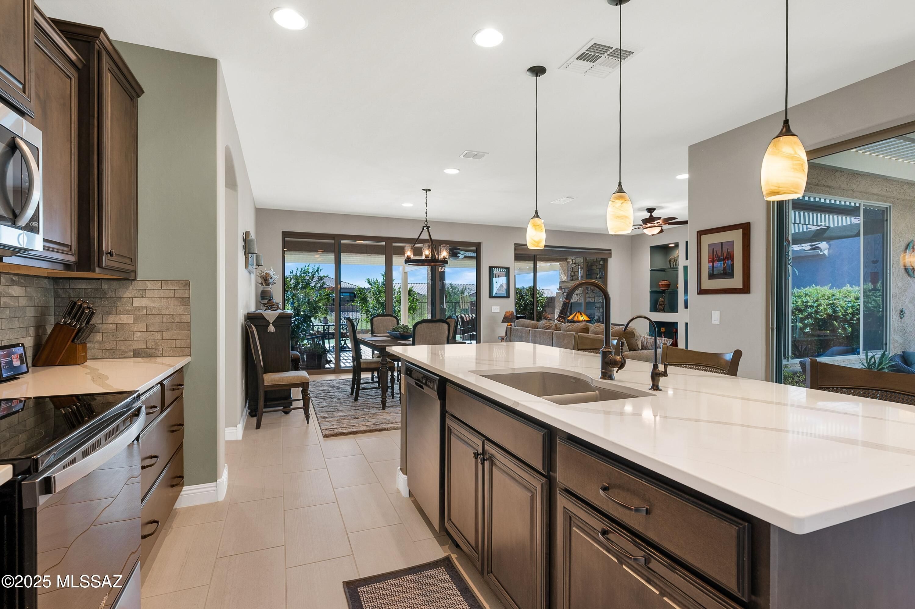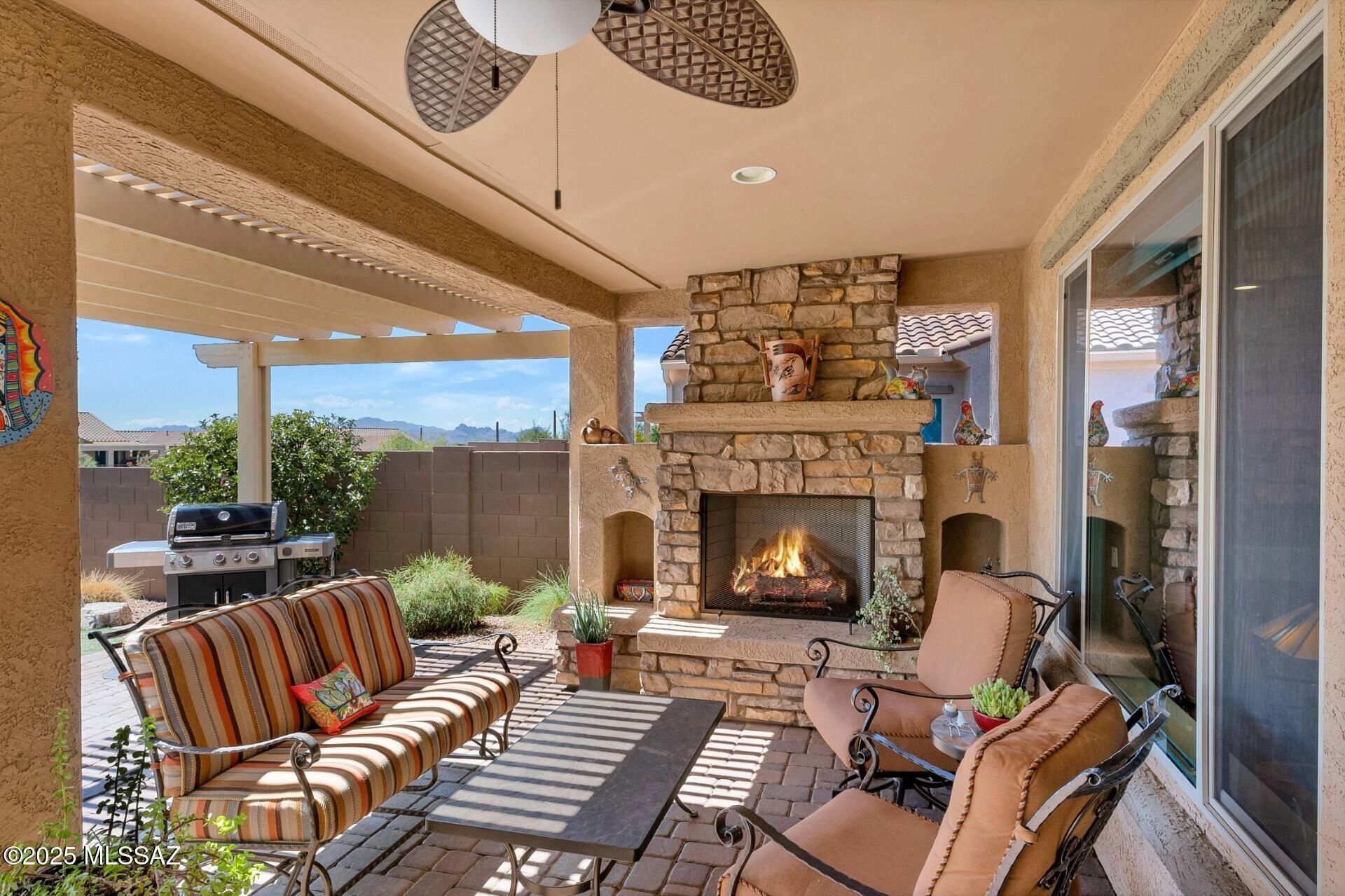 Welcome to this highly upgraded, popular Haven floorplan that includes 2 bedrooms plus a den and 2 baths. This greatroom floorplan offers two private outdoor spaces. Enjoy a charming courtyard off the kitchen and a professionally landscaped backyard with a paver patio, outdoor fireplace, extended ramada, and mountain and sunset views. The gourmet kitchen has quartz countertops, a custom backsplash, stainless steel appliances, a large island, and a walk-in pantry. The extended primary suite includes a bay window and a generous walk-in closet. The spacious primary bathroom features an upgraded oversized shower with a built-in seat, split vanities, and leathered granite countertops. The large laundry room has built in cabinetry for extra storage and a sink. The garage includes epoxy