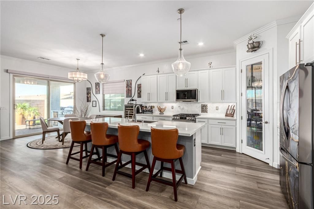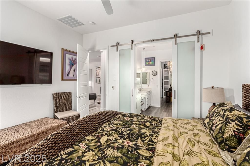 Welcome to this sought-after 55+ Community of Cadence! The stained glass front door leads you to this lovely home which blends comfort and functionality with a modern touch. Impressive open floor plan features wood-look tile flooring, abundant natural light, neutral tone. Beautiful kitchen boasts a walk-in pantry, ample cabinetry adorned with crown molding, tile backsplash, stainless steel appliances, recessed & pendant lighting, quartz counters, and a prep island with a breakfast bar. Discover the sizable primary retreat, offering direct outdoor access and a stylish barn door to the ensuite. Enjoy dual sinks, a make-up vanity, and a walk-in closet for effortless organization. The secondary bedrooms provide sliding door closets for convenience and practicality. Serene backyard includes a covered patio, built-in BBQ, entertain with plenty of seating around the fire table while enjoying stunning sunsets! Don't forget the putting green! What's not to like? Make it yours before it's gone!