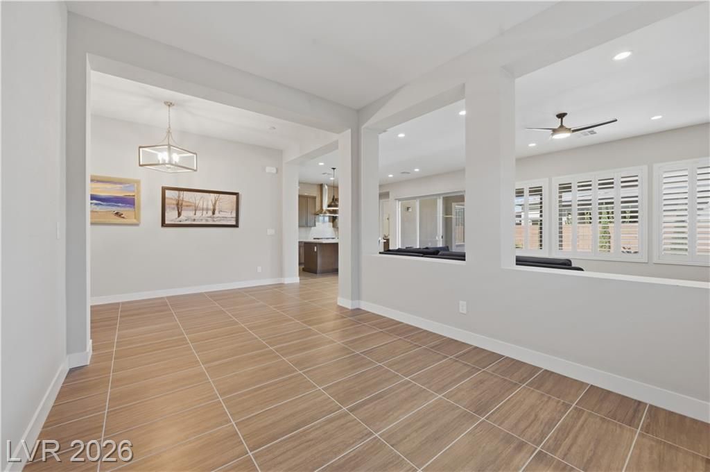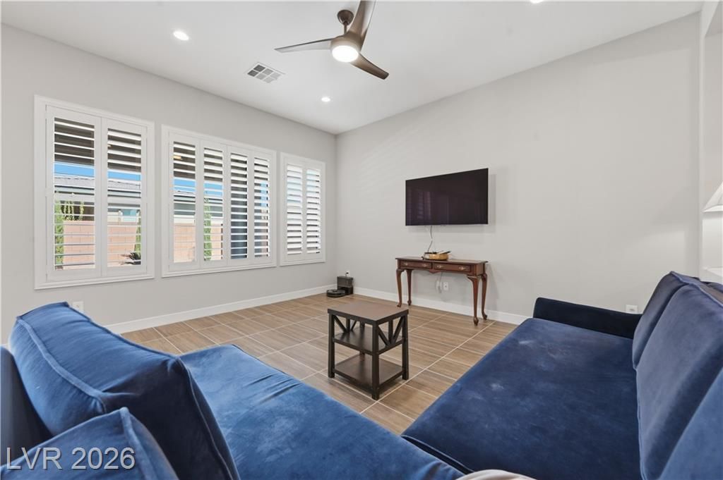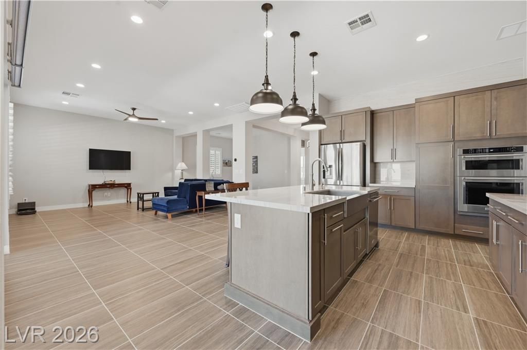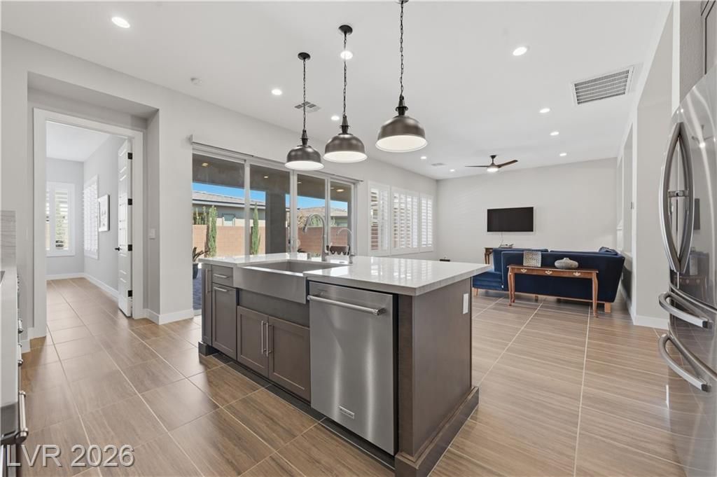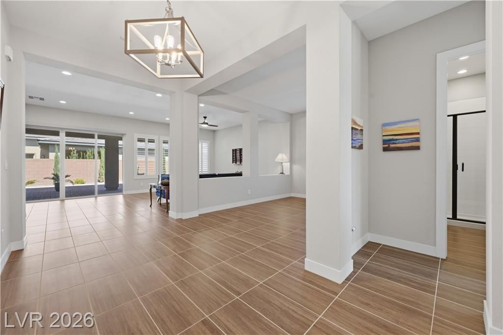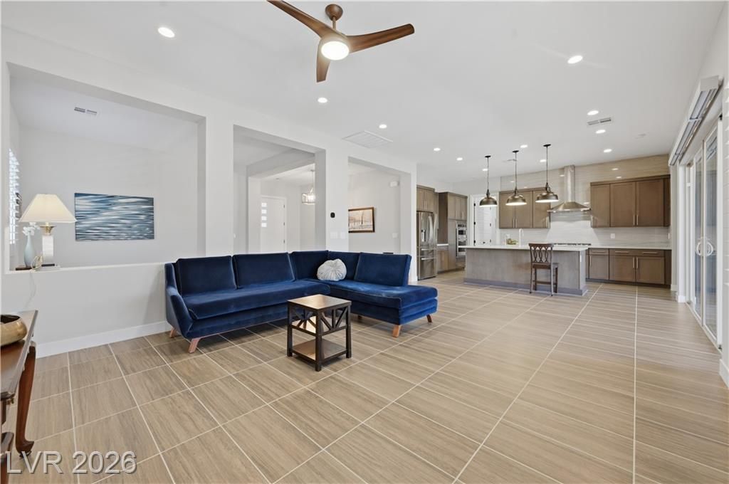 This beautifully designed 2-bedroom, 2-bath single-story home by Toll Brothers is located in the prestigious 55+ guard-gated Regency community. SID is paid off. Open-concept floor plan. Luxury modern tile flooring and plantation shutters throughout. Gourmet kitchen featuring stainless steel appliances, stone backsplash, island, and custom cabinetry. High-end rolling shutters on glass sliders open to a large covered patio with extended pavers. Primary bedroom with ceiling fan. Primary bathroom with dual sinks, a vanity area, and a walk-in closet. Second bedroom is privately separated from the primary suite. Laundry room with sink and cabinets. Soft water system and tankless water heater in the garage. Residents enjoy a resort-style lifestyle with access to a huge clubhouse featuring sparkling indoor and outdoor pools and spas, a fitness center, park, tennis courts, an active social calendar, and more.