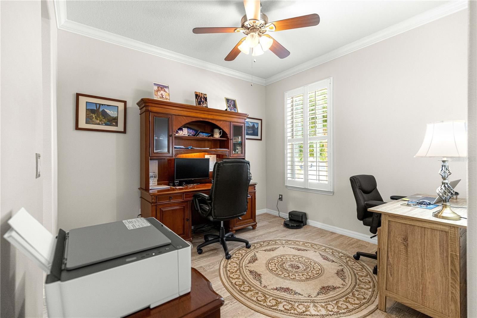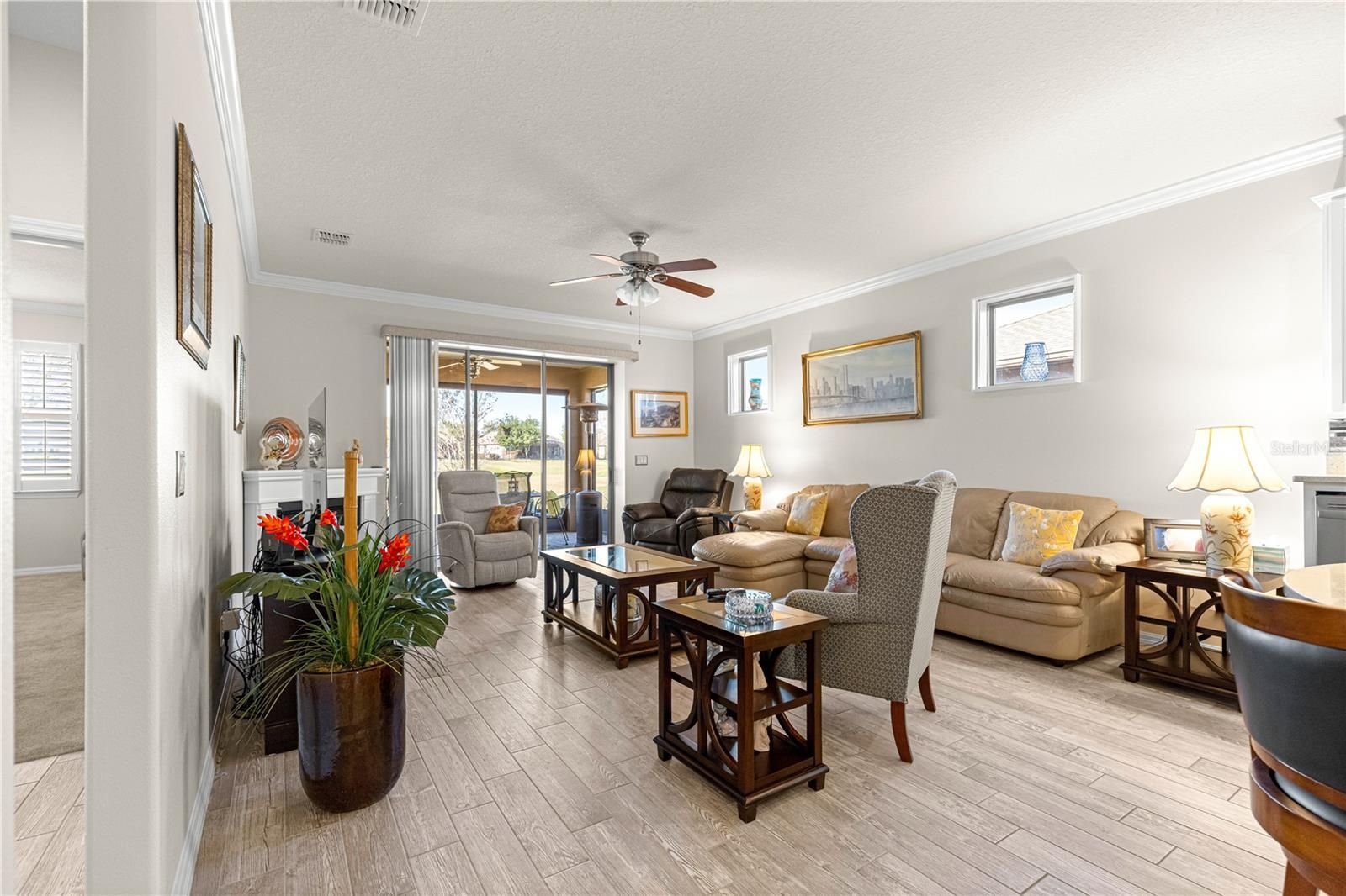 Wake up to breathtaking golf course views from this highly sought-after Martin Ray model, perfectly positioned on a premium lot overlooking the 6th hole tee box in the gated 55+ community of Stone Creek. This beautifully maintained 3-bedroom, 3-bath home with flex room and loft offers the ideal blend of luxury, comfort, storage, and functionality. Step inside through the new glass front door inset and experience bright neutral tones, abundant natural light, and elegant finishes throughout. The open-concept kitchen is a true showpiece, featuring quartz countertops, a large island with a striking stone accent base, custom-designed pantry, upgraded Kitchen Aid stainless steel appliances, cabinet pull-outs, and ample storage — perfect for entertaining. The spacious living area is anchored by an electric fireplace and flows seamlessly through glass sliders to the screened-in lanai, where you can relax and enjoy peaceful golf course views year-round. The renovated primary suite is a private retreat, offering a custom walk-in closet and a spa-inspired bathroom with a Roman-style step-in shower. Beautiful plank flooring, crown molding and Plantation shutters add timeless sophistication throughout the home. Upstairs, the versatile loft includes its own secondary AC zone controller for enhanced energy efficiency — this amazing space is ideal on so many levels - use it for guests, an adult child attending school, a hobby space for artists or crafters, or perhaps a man-cave theater area, plus it has a plethora of extra storage! Additional highlights include: extended garage with 4-foot bump-out, perfect for extra storage or a golf cart, recently repainted exterior and interior, decorative concrete curbing and river rock ground cover, the additional flex room and the premium golf court lot. Located in the resort-style, active adult community of Stone Creek, residents enjoy gated security and world-class amenities designed for vibrant 55+ living. This is more than a home — it’s a lifestyle! Schedule your private showing today and experience golf course living at its finest!