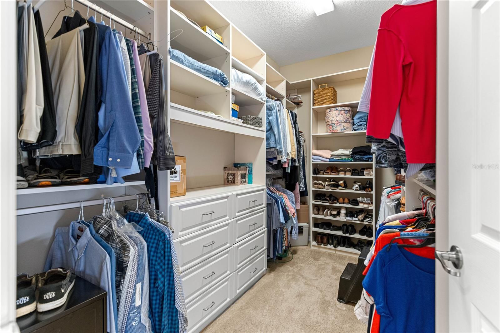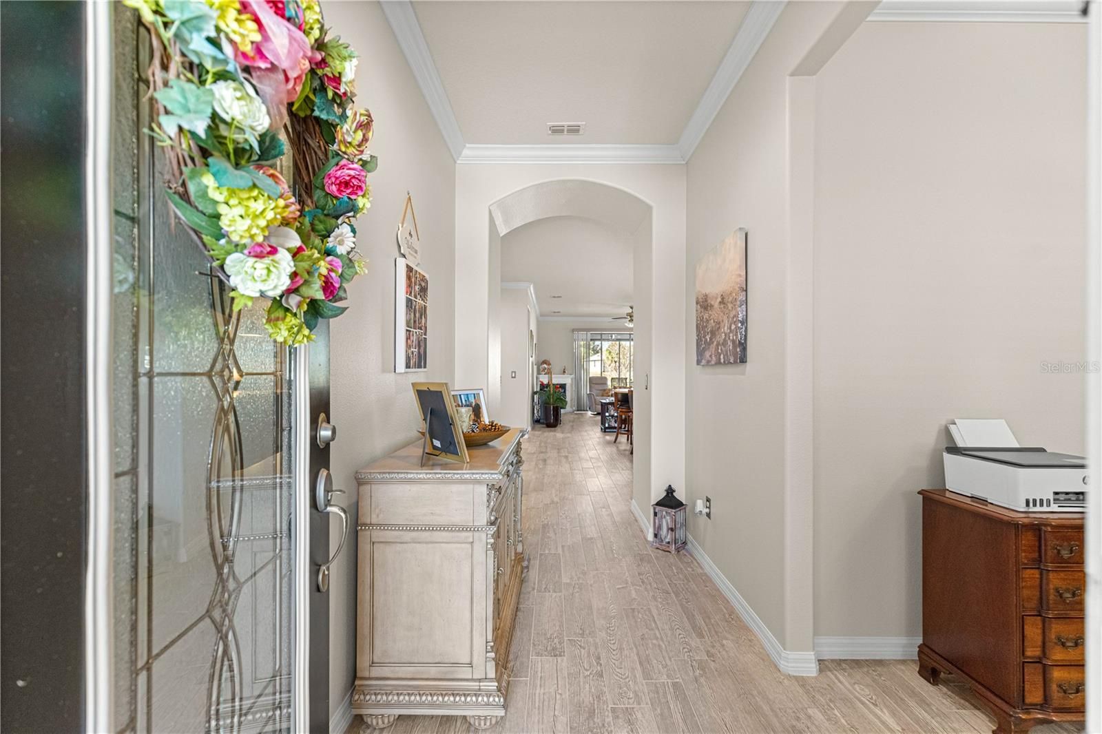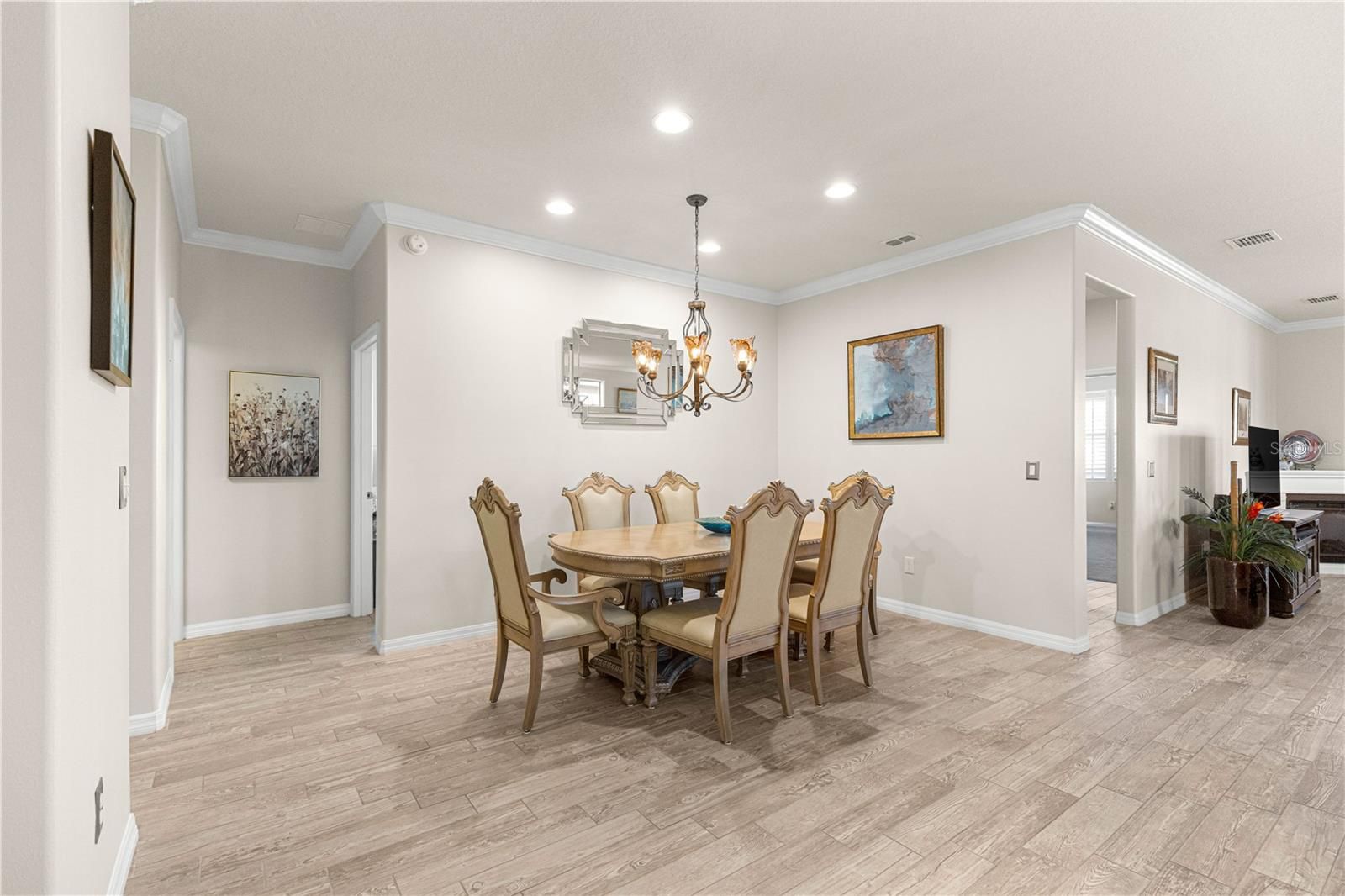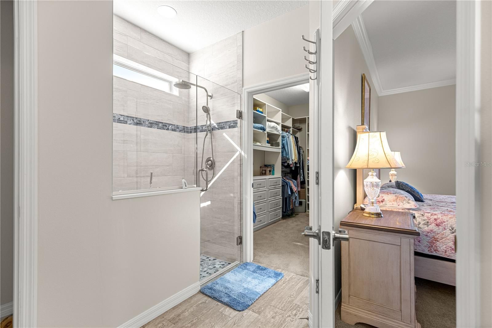 - Ceiling Fan(s), Crown Molding, Eat-in Kitchen, High Ceilings, Kitchen/Family Room Combo, Open Floorplan, Main Level Primary, Solid Surface Counters, Thermostat, Walk-In Closet(s), Window Treatments