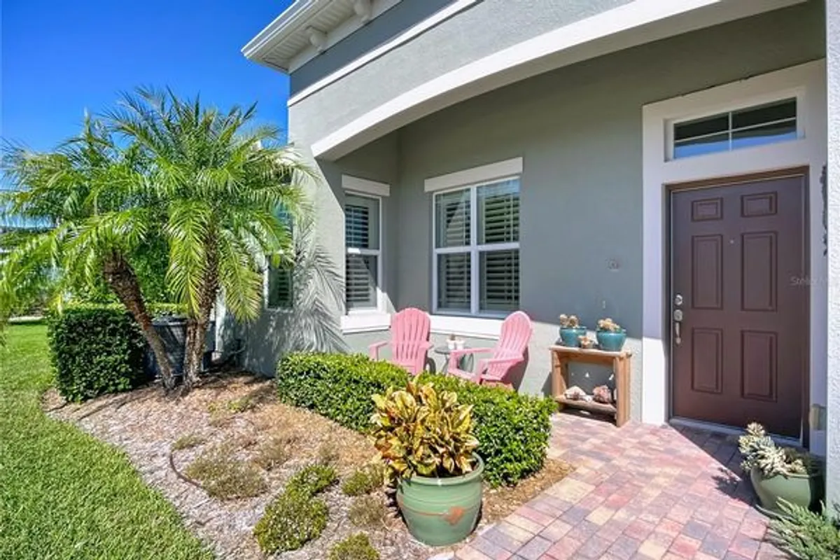 Welcome to Verona, Sun City Center Community Association’s newest and only gated community. UPSCALE VILLA with great curb appeal on a corner lot providing large front yard views. The HOA handles all yard work, exterior painting, routine roof replacement, and gate maintenance. This home features HURRICANE IMPACT WINDOWS and DOORS, and a HIP ROOF, which lowers the insurance rates. With an elevation of 75 feet, NO FLOOD INSURANCE is necessary. Upon entry is a large open floorplan featuring a spacious GOURMET KITCHEN with an abundance of solid wood cabinets, granite countertops, deep pan drawers, breakfast bar, newer stainless appliances, reverse osmosis water, recessed lighting, and a designer closet pantry. Dining Room/ Great Room features tray ceiling, plantation shutters and modern paint colors creating a bright and inviting atmosphere. Just off the living room is a screened lanai with privacy shades, paver flooring and a view of a small lake, home to sandhill cranes. The SPLIT FLOOR PLAN with an ensuite primary bedroom features a tray ceiling, walk-in closet, double sink vanity, easy step shower, and W.C. A versatile bonus room ideal for home office, music nook or craft room that flanks the 2nd bedroom and bath featuring a tub shower combination. There is also an interior laundry center too. The garage features a coated floor, utility sink, Culligan water softener, and pull-down ladder leading to a partially floored attic. Paver driveway and entry way. Verona residents enjoy their own private pool and party area as well as membership in the nearby Club Renaissance which offers 18-hole golf course, (membership optional) resort-style pool, 2 restaurants, a state-of-the-art fitness gym, saunas, steam rooms, and many spa services. This, in addition to all the clubs and recreation activities of Sun City Center named #1 Retirement Community in USA and where traveling by golf cart is often the most desired mode of transportation. This home is MOVE-IN READY and SELLERS ARE INCLUDING: *YAMAHA GOLF CART * $2,500 CARPET ALLOWANCE and 2026 CLUB RENAISSANCE DUES PAID FOR THE FIRST YEAR! HUGE VALUE! Hurry to see. SELLERS ARE SUPER MOTIVATED!