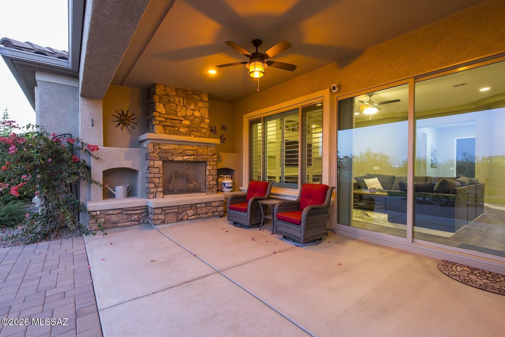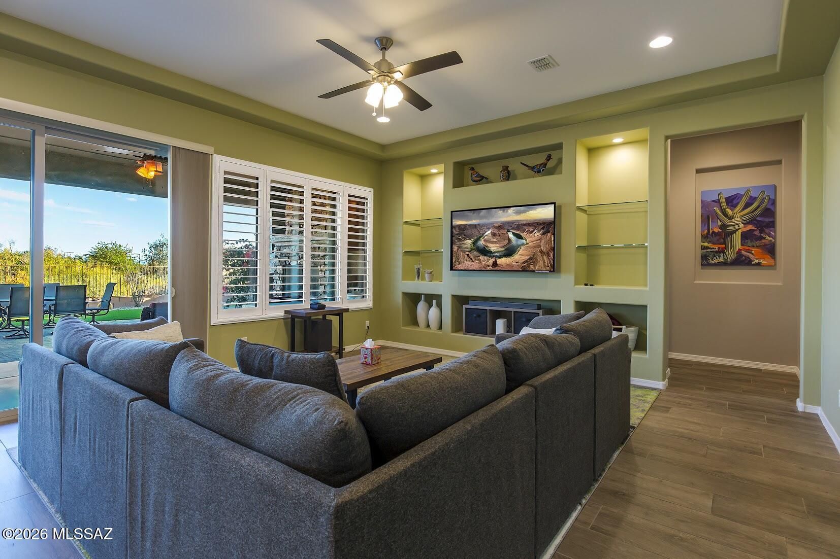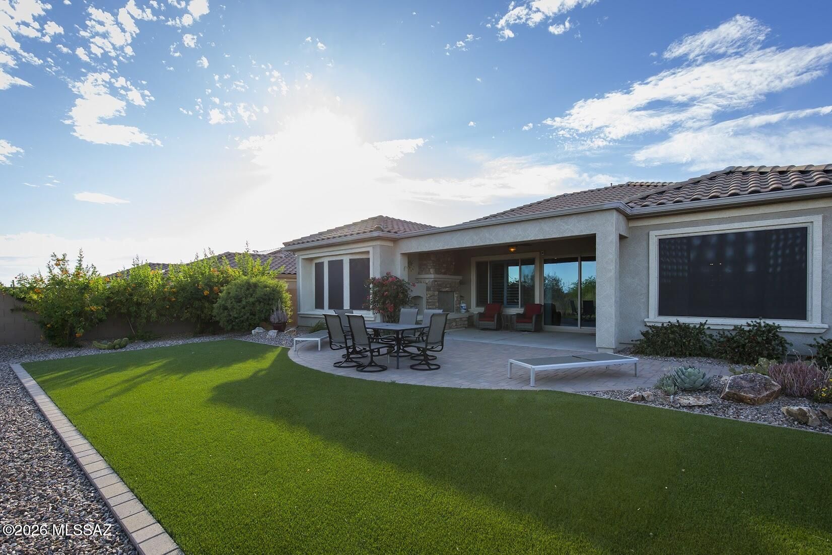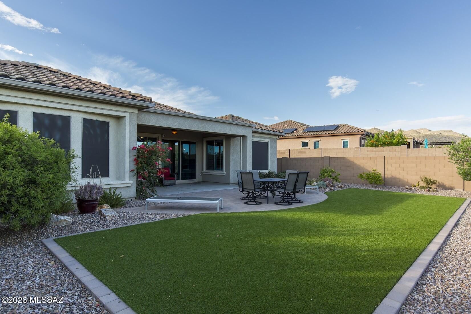 Aggressively priced & gently lived in! 2 bd + den ( easy to convert to 3 bd if needed) 2023 sq ft Pursuit Model in desirable Del Webb at Dove Mnt. Many upgraded features such as Plank flooring in main areas, Shutters on windows, Quartz countertops throughout, 10' ceilings & 8' doors, curved walls in Great rm. Gourmet kitchen w/center island, Pantry, breakfast bar, SS appliances! Premium Lot common area on 2 sides, Mountain Views. Spacious, 2+ car garage! Amazing location w/privacy, views, yet easy walk to the clubhouse. Walls of windows in great room overlooking the large covered patio with fireplace, colorful, but low care backyard w/extended pavers, decorative turf, plus flowering desert plantings! Lot adjacent to large common area with many saguaro's, gorgeous lush native Desert.