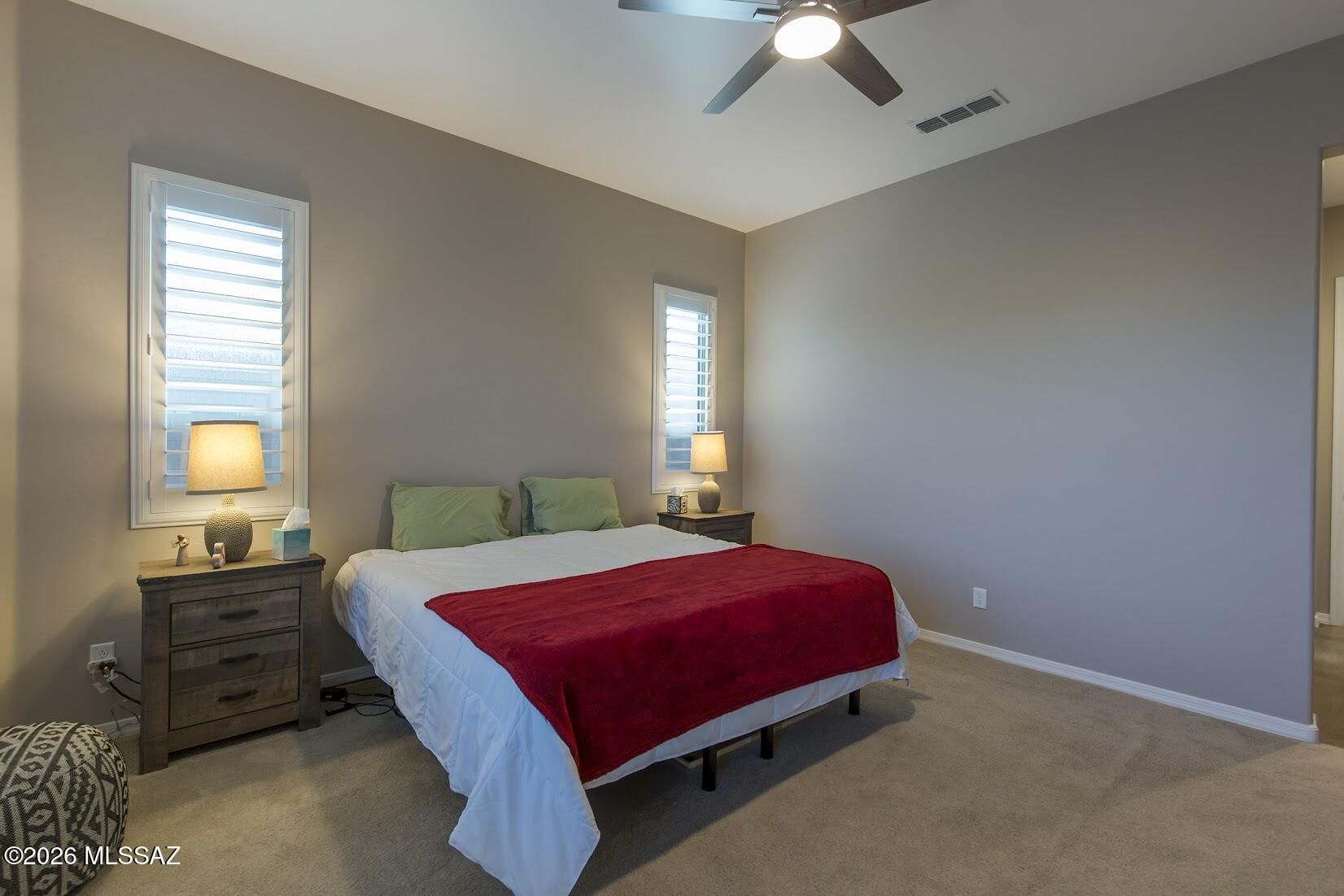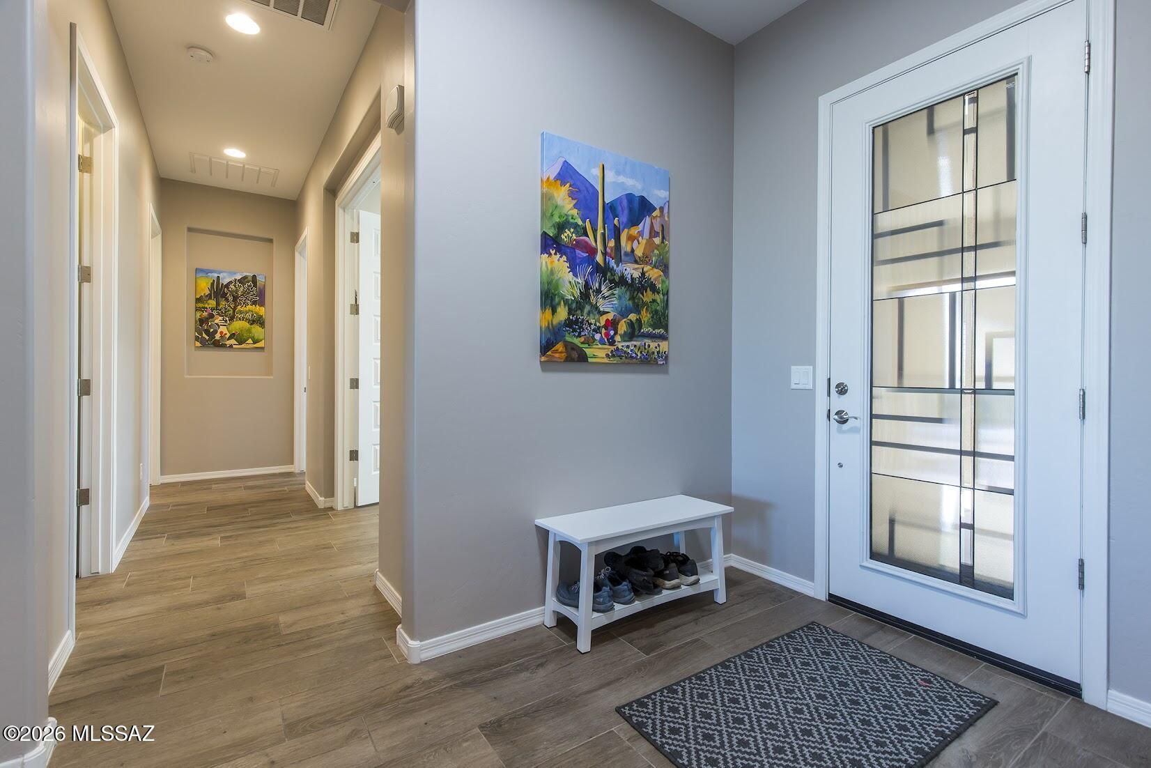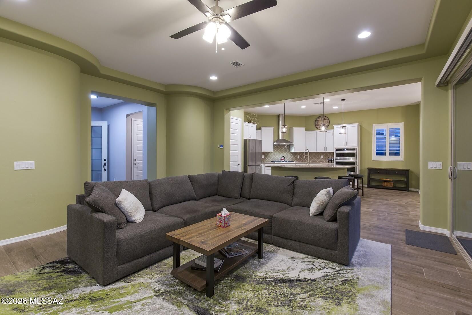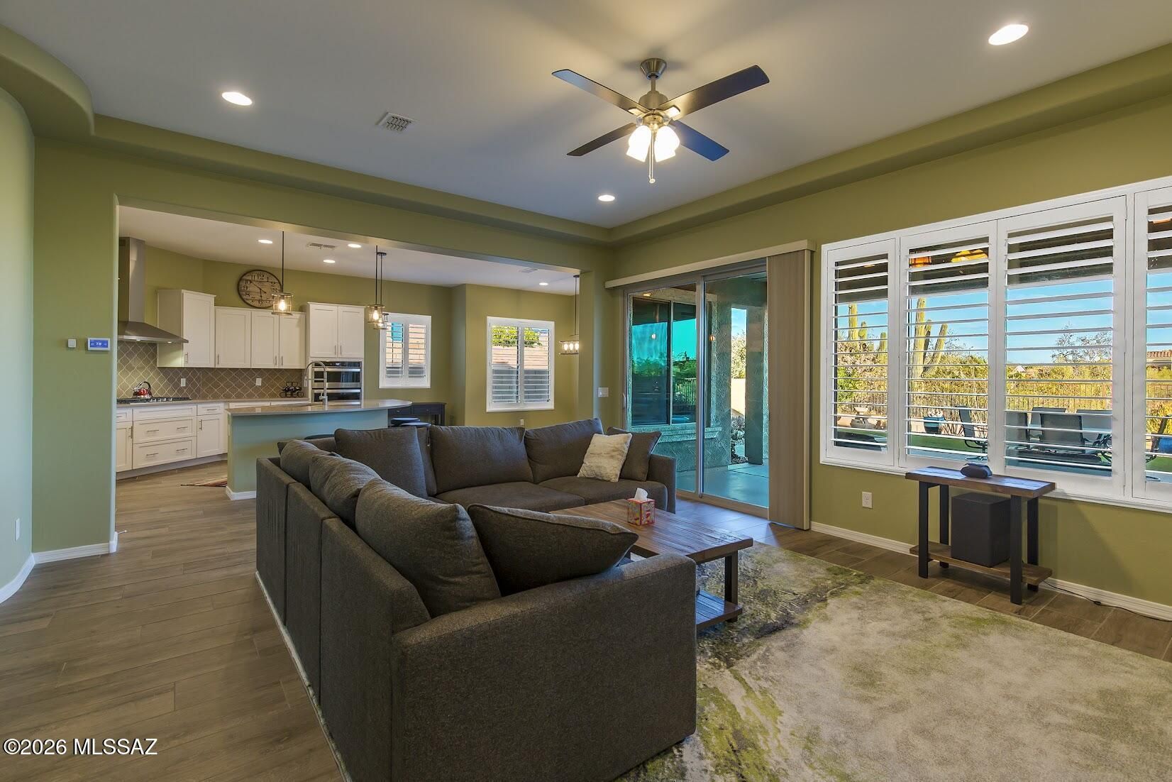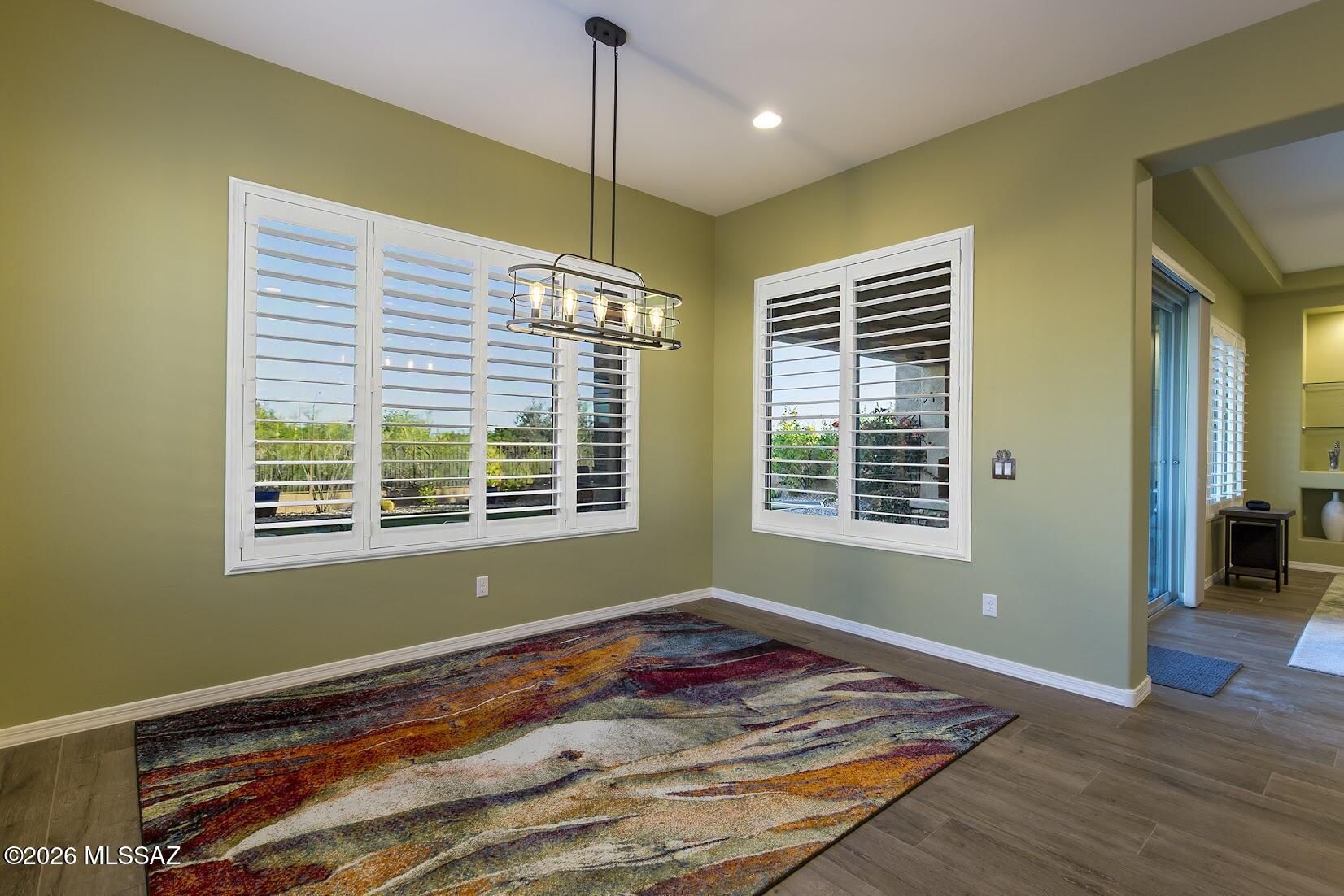 Aggressively priced & gently lived in! 2 bd + den ( easy to convert to 3 bd if needed) 2023 sq ft Pursuit Model in desirable Del Webb at Dove Mnt. Many upgraded features such as Plank flooring in main areas, Shutters on windows, Quartz countertops throughout, 10' ceilings & 8' doors, curved walls in Great rm. Gourmet kitchen w/center island, Pantry, breakfast bar, SS appliances! Premium Lot common area on 2 sides, Mountain Views. Spacious, 2+ car garage! Amazing location w/privacy, views, yet easy walk to the clubhouse. Walls of windows in great room overlooking the large covered patio with fireplace, colorful, but low care backyard w/extended pavers, decorative turf, plus flowering desert plantings! Lot adjacent to large common area with many saguaro's, gorgeous lush native Desert.