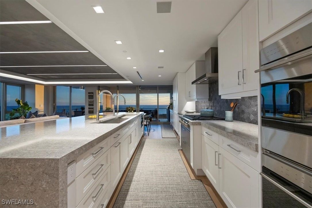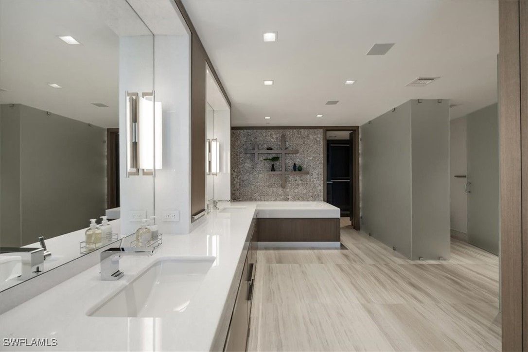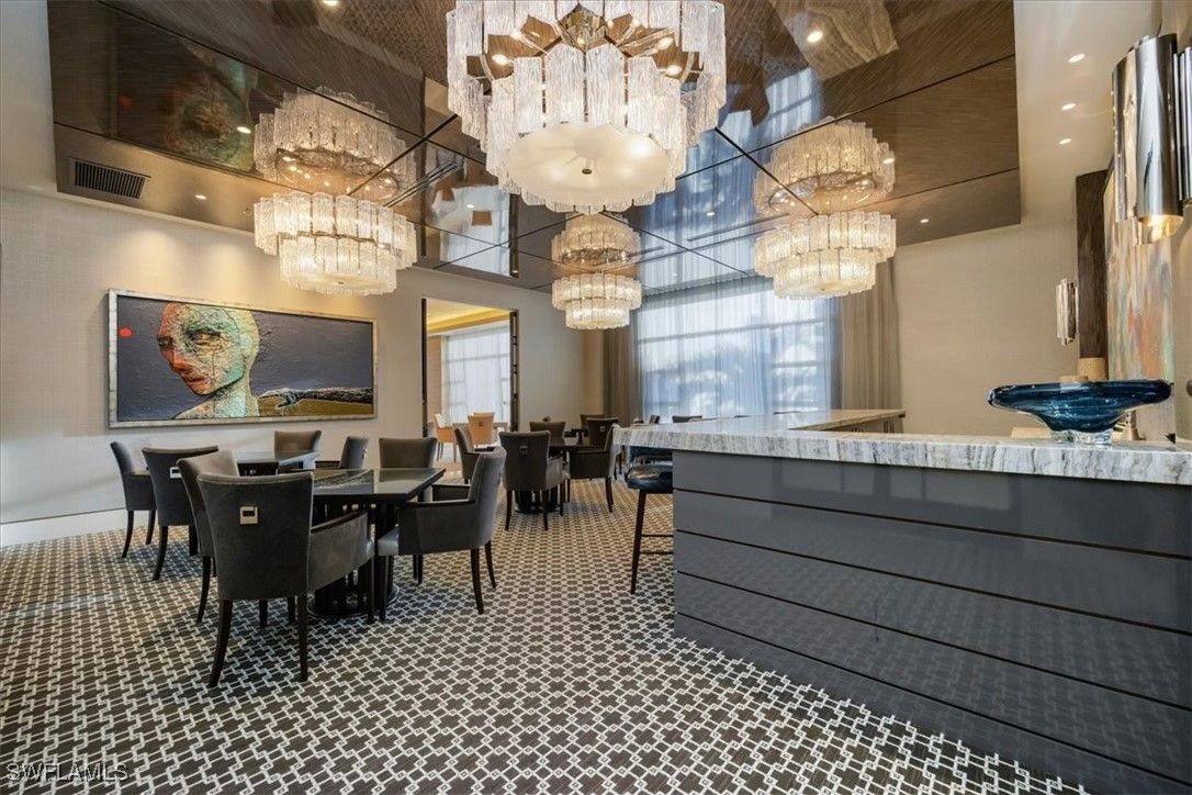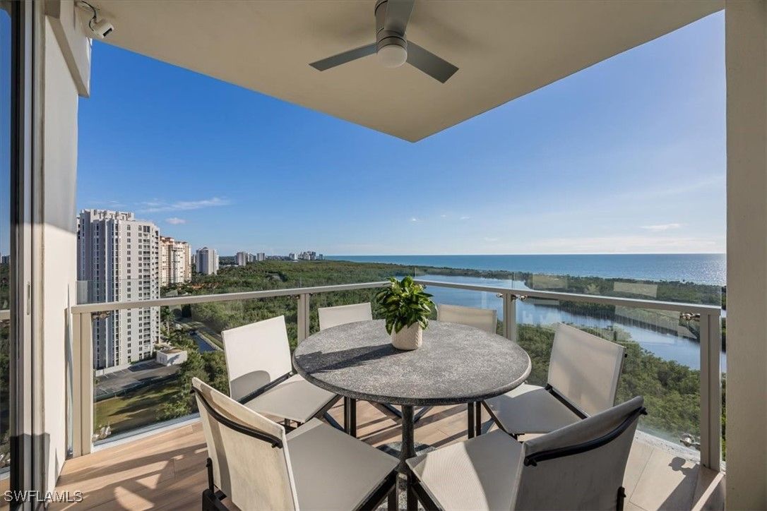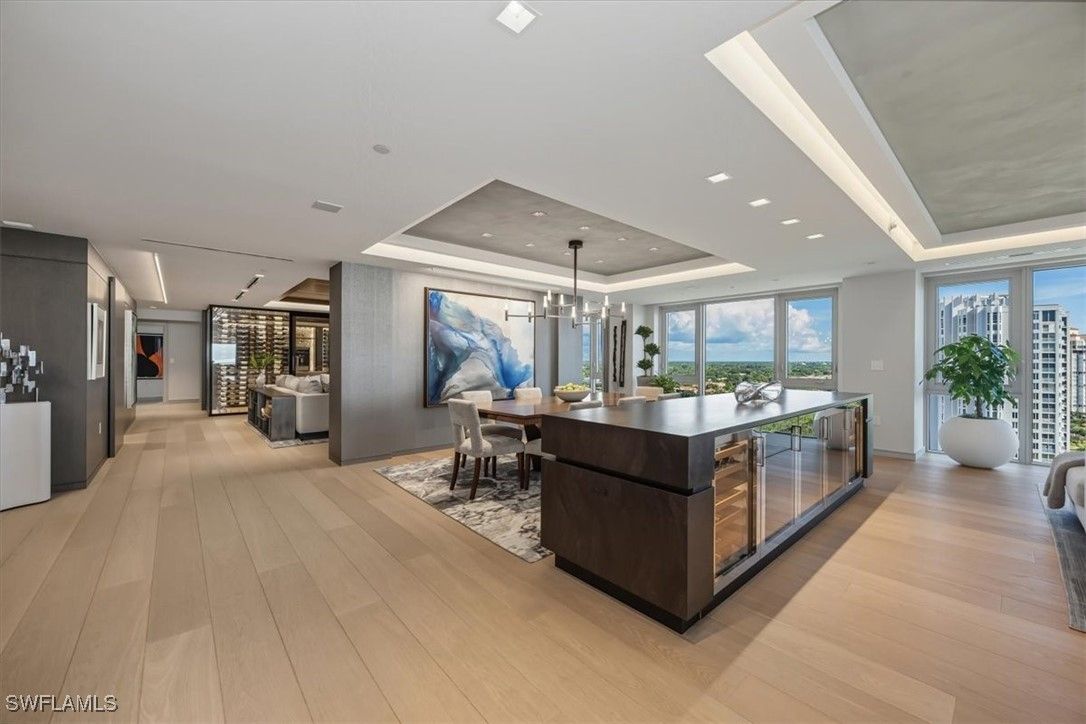 Welcome to 1701 Mystique, the crown jewel of Naples’ most prestigious high-rise, where custom craftsmanship and coastal sophistication meet on a grand scale. More than 5,500 square feet of reimagined living space capture sweeping views of the Gulf through floor-to-ceiling windows that flood the home with natural light. One of Naples’ rare condos offering a private three-car garage plus an additional deeded space — four coveted parking spots in total. Every element has been thoughtfully curated—from Legno Bastone flooring and Venetian plaster ceilings to bespoke millwork and hidden cabinetry that add architectural refinement throughout. The great room is anchored by a dramatic stone and hammered-metal fireplace wall and complemented by a dedicated wet-bar, lounge, and 392-bottle temperature-controlled wine room—an ideal setting for both entertaining and everyday living. The gourmet kitchen features Wolf and Sub-Zero appliances, gas cooking, quartz countertops, and a striking Black Panther Leather stone buffet that blends artistry and performance. A spacious lanai with hurricane shutters includes a lounge area, dining space, and built-in grill, seamlessly extending the kitchen and great room for effortless indoor-outdoor living. The primary suite is a serene retreat with breathtaking beach vistas, a spa-inspired bath, and custom-designed closets for both beauty and function. One of the four additional bedrooms serves as a private office with 180-degree golf course views, and a hidden closet concealed behind a wall of built-in cabinetry. Smart-home comforts include remote-controlled drapes and blackout blinds in all bedrooms, dual dryers, and private elevator access. Mystique offers a lifestyle beyond compare with 24-hour concierge and staff, a resort-style pool, private spa suites, theater, fitness and wellness center, billiards and social rooms, guest suites, and tennis courts—all within Pelican Bay’s exclusive beachfront community, featuring two private beachfront restaurants and proximity to Naples’ finest shopping, dining, and cultural destinations. This is more than a home—it is a statement of design, exclusivity, and modern coastal living at its highest level.