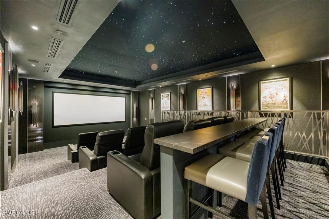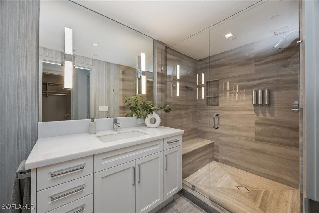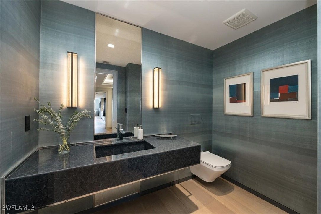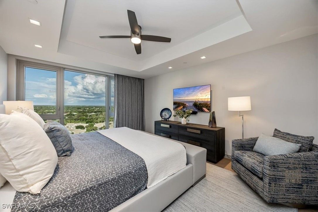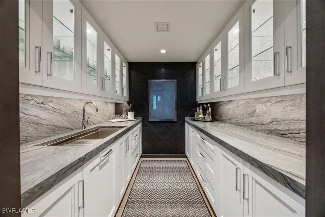 Welcome to 1701 Mystique, the crown jewel of Naples’ most prestigious high-rise, where custom craftsmanship and coastal sophistication meet on a grand scale. More than 5,500 square feet of reimagined living space capture sweeping views of the Gulf through floor-to-ceiling windows that flood the home with natural light. One of Naples’ rare condos offering a private three-car garage plus an additional deeded space — four coveted parking spots in total. Every element has been thoughtfully curated—from Legno Bastone flooring and Venetian plaster ceilings to bespoke millwork and hidden cabinetry that add architectural refinement throughout. The great room is anchored by a dramatic stone and hammered-metal fireplace wall and complemented by a dedicated wet-bar, lounge, and 392-bottle temperature-controlled wine room—an ideal setting for both entertaining and everyday living. The gourmet kitchen features Wolf and Sub-Zero appliances, gas cooking, quartz countertops, and a striking Black Panther Leather stone buffet that blends artistry and performance. A spacious lanai with hurricane shutters includes a lounge area, dining space, and built-in grill, seamlessly extending the kitchen and great room for effortless indoor-outdoor living. The primary suite is a serene retreat with breathtaking beach vistas, a spa-inspired bath, and custom-designed closets for both beauty and function. One of the four additional bedrooms serves as a private office with 180-degree golf course views, and a hidden closet concealed behind a wall of built-in cabinetry. Smart-home comforts include remote-controlled drapes and blackout blinds in all bedrooms, dual dryers, and private elevator access. Mystique offers a lifestyle beyond compare with 24-hour concierge and staff, a resort-style pool, private spa suites, theater, fitness and wellness center, billiards and social rooms, guest suites, and tennis courts—all within Pelican Bay’s exclusive beachfront community, featuring two private beachfront restaurants and proximity to Naples’ finest shopping, dining, and cultural destinations. This is more than a home—it is a statement of design, exclusivity, and modern coastal living at its highest level.