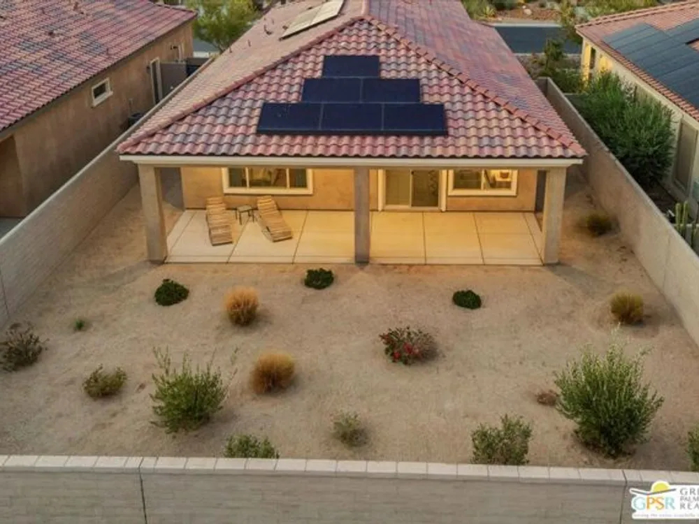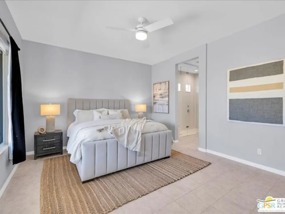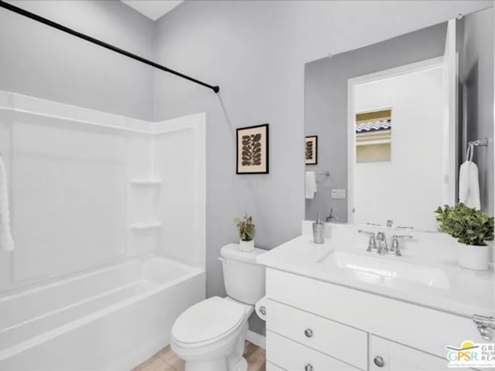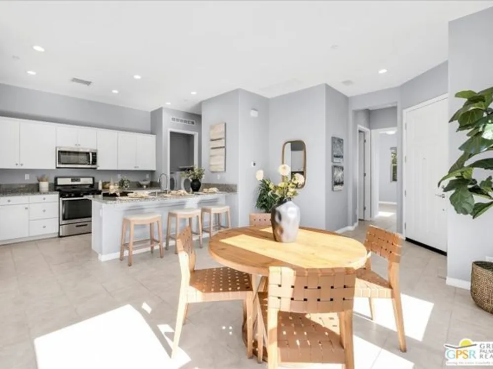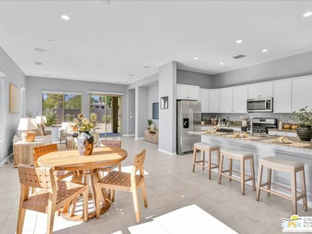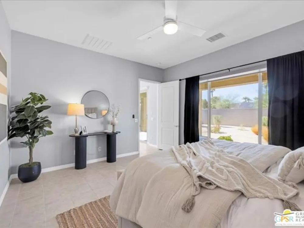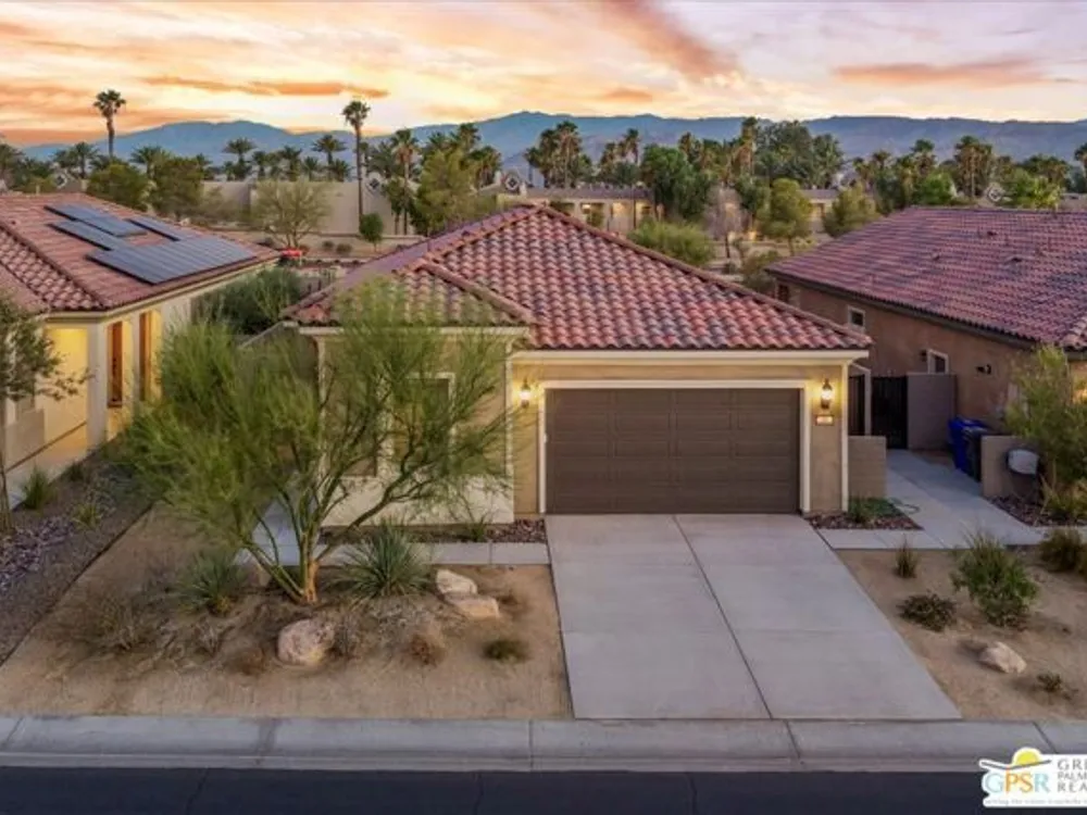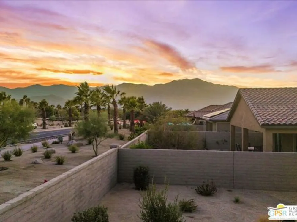 Exceptional Opportunity to get into the highly sought-after 55+ community of Del Webb Rancho Mirage! This desirable Phase 2, Plan One, GETAWAY floor plan offers the perfect blend of comfort, style, and function with two bedrooms, two bathrooms, and a beautifully designed open-concept layout. Step inside to find upgraded tile flooring and custom window treatments throughout. The kitchen is a true highlight, featuring upgraded 42" upper cabinets, natural GRANITE COUNTERTOPS, brushed nickel hardware and fixtures, a Whirlpool appliance package, and a spacious peninsula with ample seating - perfect for entertaining. A generous walk-in pantry adds to the home's smart storage design. The primary suite is a relaxing retreat, complete with a ceiling fan, a spa-inspired ensuite bathroom with an upgraded glass-enclosed RAIN SHOWER, dual sinks, quartz countertops, and a large walk-in closet. The guest bedroom is thoughtfully positioned on the opposite end of the home, offering ideal privacy for you and your visitors, along with a nearby full guest bath. Enjoy movie nights or relaxing evenings in the great room, which features ample dining and living space, an entertainment niche, and built-in 5.1 SURROUND SOUND with subwoofer output. Step outside to a full-width covered patio with built-in speakers and enjoy beautiful MOUNTAIN VIEWS from this large pool sized yard. Additional upgrades include leased SOLAR ($82.40/month), a dedicated laundry room with Whirlpool washer and dryer, and built-in high-speed outlets in the primary suite, great room, and guest bedroom. Located within the gates of Del Webb Rancho Mirage, residents enjoy world-class amenities: a stunning clubhouse, resort-style pool and spa, fitness center, bar, tennis, pickleball, and a full calendar of social events. This home is more than just a smart investment - it's a gateway to the lifestyle you've been dreaming of.