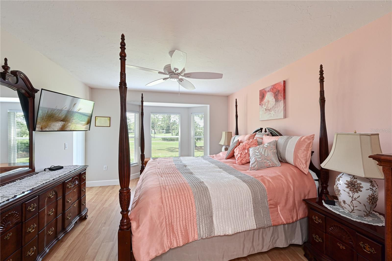 - Ceiling Fan(s), Living/Dining Room, Open Floorplan, Main Level Primary, Solid-Wood Cabinets, Split Bedrooms, Stone Counters, Walk-In Closet(s), Window Treatments