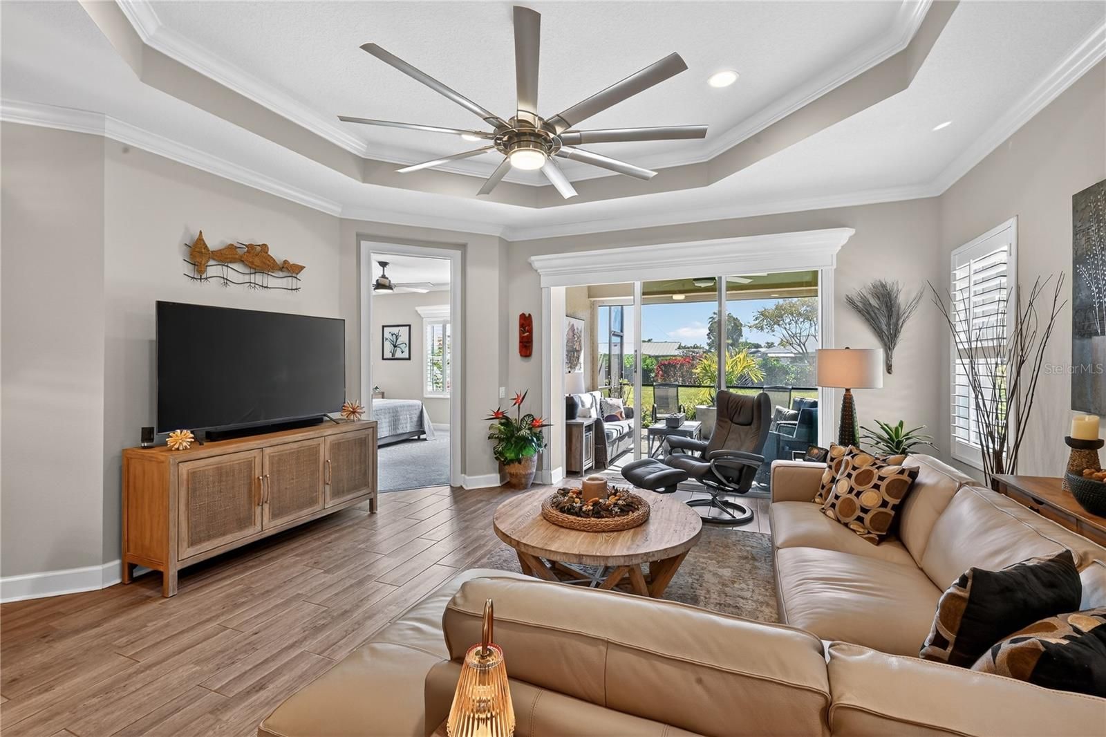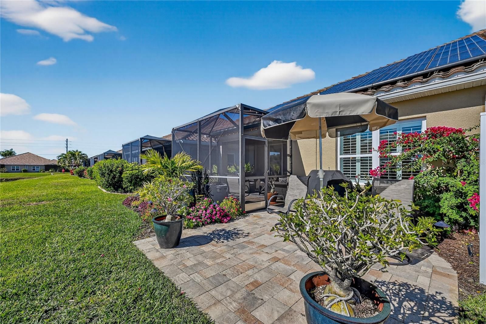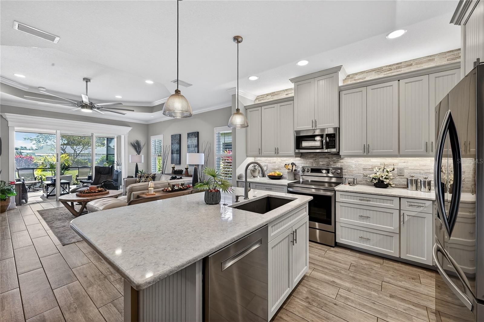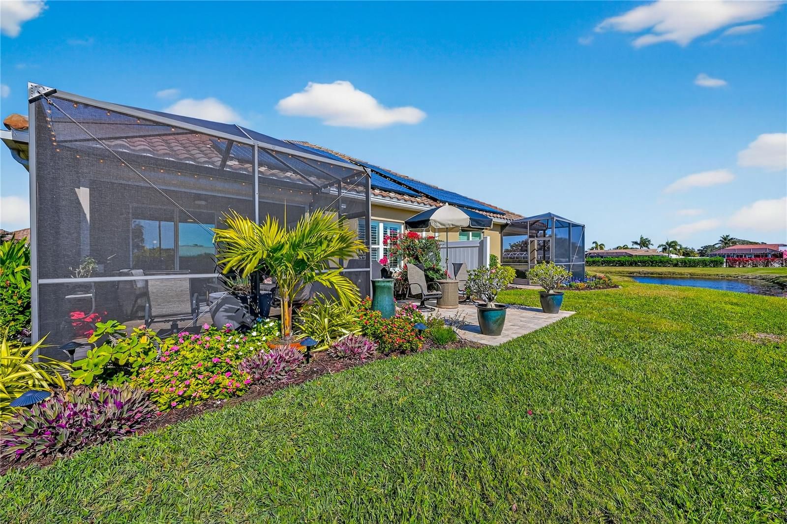 Welcome to Mirabella, a gated 55+ community celebrated for its award-winning LEED Platinum design, where energy efficiency, comfort, and peace of mind come together. This upgraded 2 bedroom 2 bathroom home with a den offers 1,524 square feet of bright, inviting living space built to exceptional standards. Southern exposure fills the home with natural light, enhancing its open feel while supporting consistent indoor comfort year-round. High-end porcelain tile flooring runs throughout, complemented by custom paint and a thoughtfully designed lighting package. The kitchen features brand-new stainless appliances, a spacious island, custom pantry cabinetry, and soft-close drawers and cabinets designed for everyday ease. The primary suite offers a calm retreat with an upgraded bathroom, while the flexible den adapts easily to your lifestyle. A custom-upgraded laundry room adds storage and organization, continuing the home’s polished feel. This home also features a fully solar powered home and the solar is paid off. Newly replaced window coverings with Plantation shutters. The extra-large extended lanai provides an ideal space for relaxing or entertaining, framed by professionally designed landscaping and protected by remote-controlled hurricane-rated Kevlar screens. With fully paid solar power, homeowners enjoy lower utility costs and long-term efficiency. This home also features a complete water filtration system. Located in Flood Zone X(no flood insurance needed) and within one of the highest elevation areas in Manatee County, flood insurance is not required—offering added confidence and savings. The HOA covers internet, cable, exterior maintenance, and painting, and provides access to outstanding amenities including pickleball courts, a beautiful pool, a luxurious hot spa, a modern fitness center, an expansive dog park, and an active 55 plus community room. Close to beaches, shopping, dining, and medical facilities, this home offers a welcoming, energy-smart Florida lifestyle. Whether you are a snowbird or year-round come see why Mirabella is the right community for you.