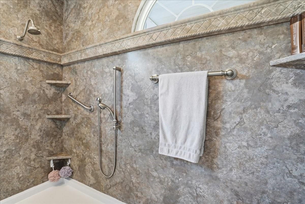 - Ceiling Fan(s), Eat-in Kitchen, Living/Dining Room, Main Level Primary, Solid Surface Counters, Thermostat, Walk-In Closet(s), Window Treatments