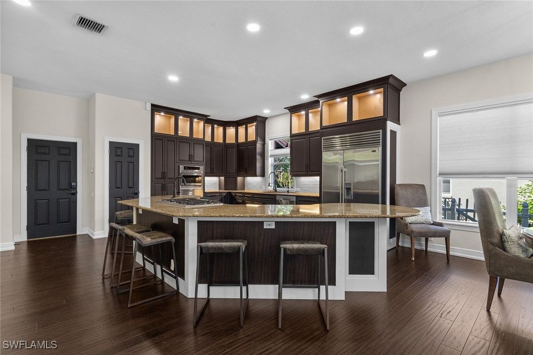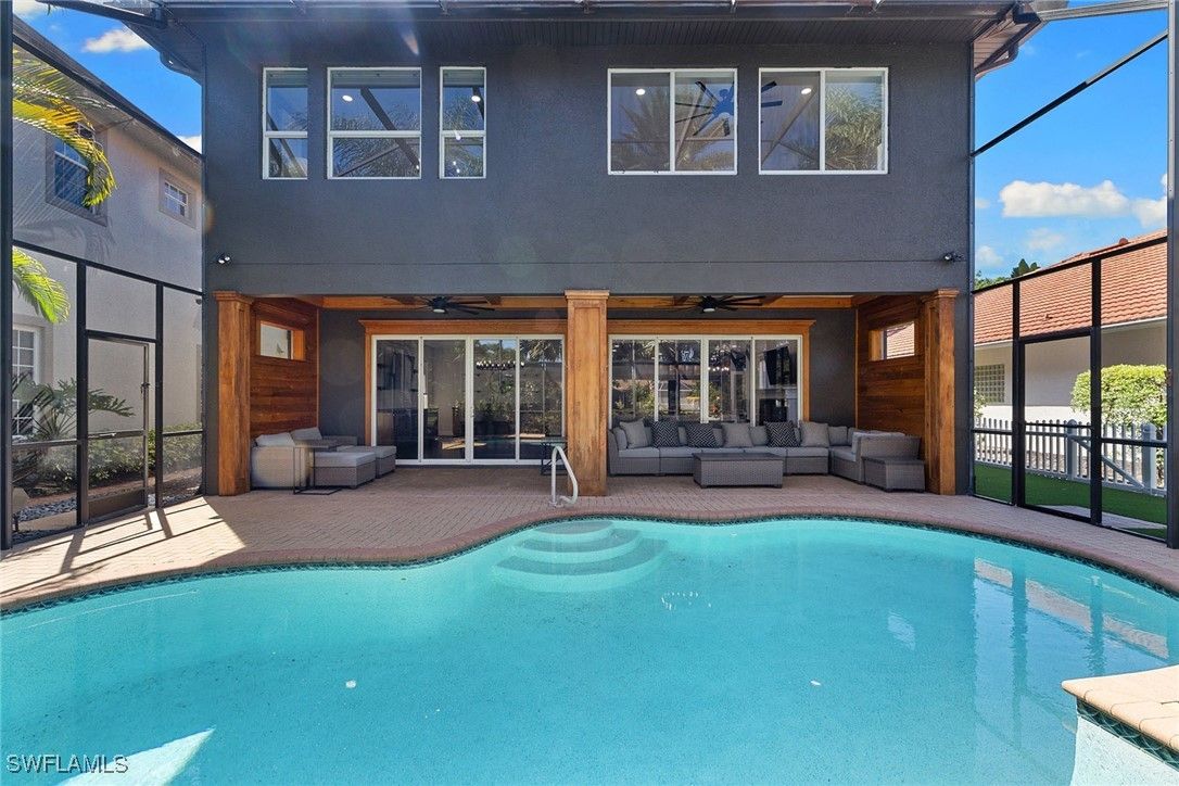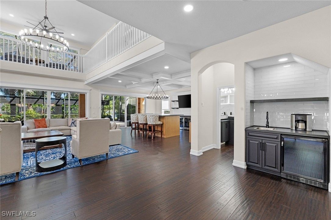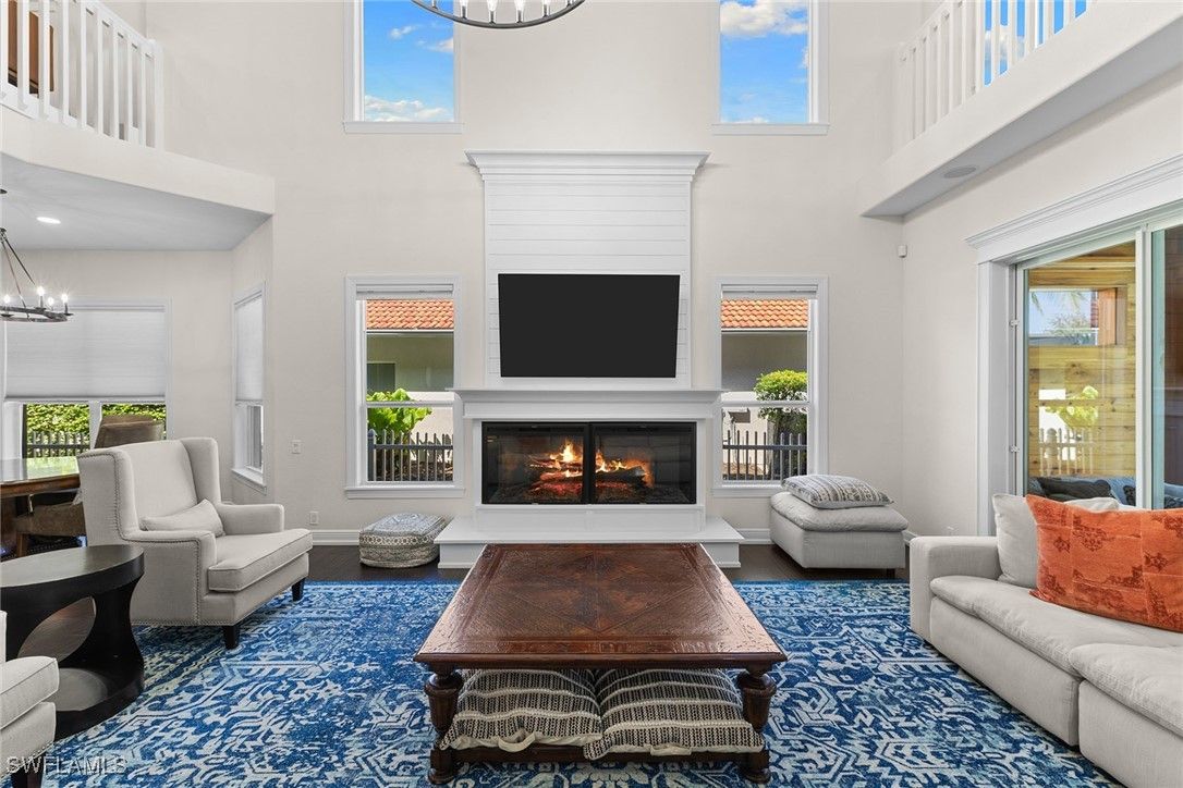 This recently renovated furnished residence in the sought-after Lely Resort offers 3,100 square feet of elegant living space with four bedrooms and three full baths. Designed for both daily comfort and sophisticated entertaining, the home features an expansive kitchen anchored by a 20-foot island, granite countertops, custom cabinetry, a gas cooktop, high-end stainless steel appliances and a coffee bar with a beverage cooler. A second gathering room provides an additional 8-by-5-foot island, a built-in ice maker, a wine cooler and a secondary dishwasher, creating a seamless setting for hosting. Throughout the home, wood flooring, recessed lighting and two fireplaces add warmth and style. The first-floor bedroom provides convenience and privacy for guests, while the upstairs suites include a spacious primary retreat with a spa-inspired bath. The outdoor living space is enhanced by a soaring screened lanai with paver decking, tongue-and-groove accents, ceiling fans, and privacy screens. Overlooking the peaceful lake, the heated pool offers a tranquil backdrop for relaxation. Other key updates include impact windows and doors, a whole-home generator, a buried propane gas tank, a whole-home water filtration system, custom garage cabinet organization and much more! Residents may also take advantage of optional membership at the award-winning Players Club and Spa, which includes resort-style pools, a fitness center, dining venues, tennis, pickleball, and more. Lely Resort also offers three championship golf courses. The home is minutes from the beaches of Naples and Marco Island as well as the cultural and dining attractions of Fifth Avenue South.