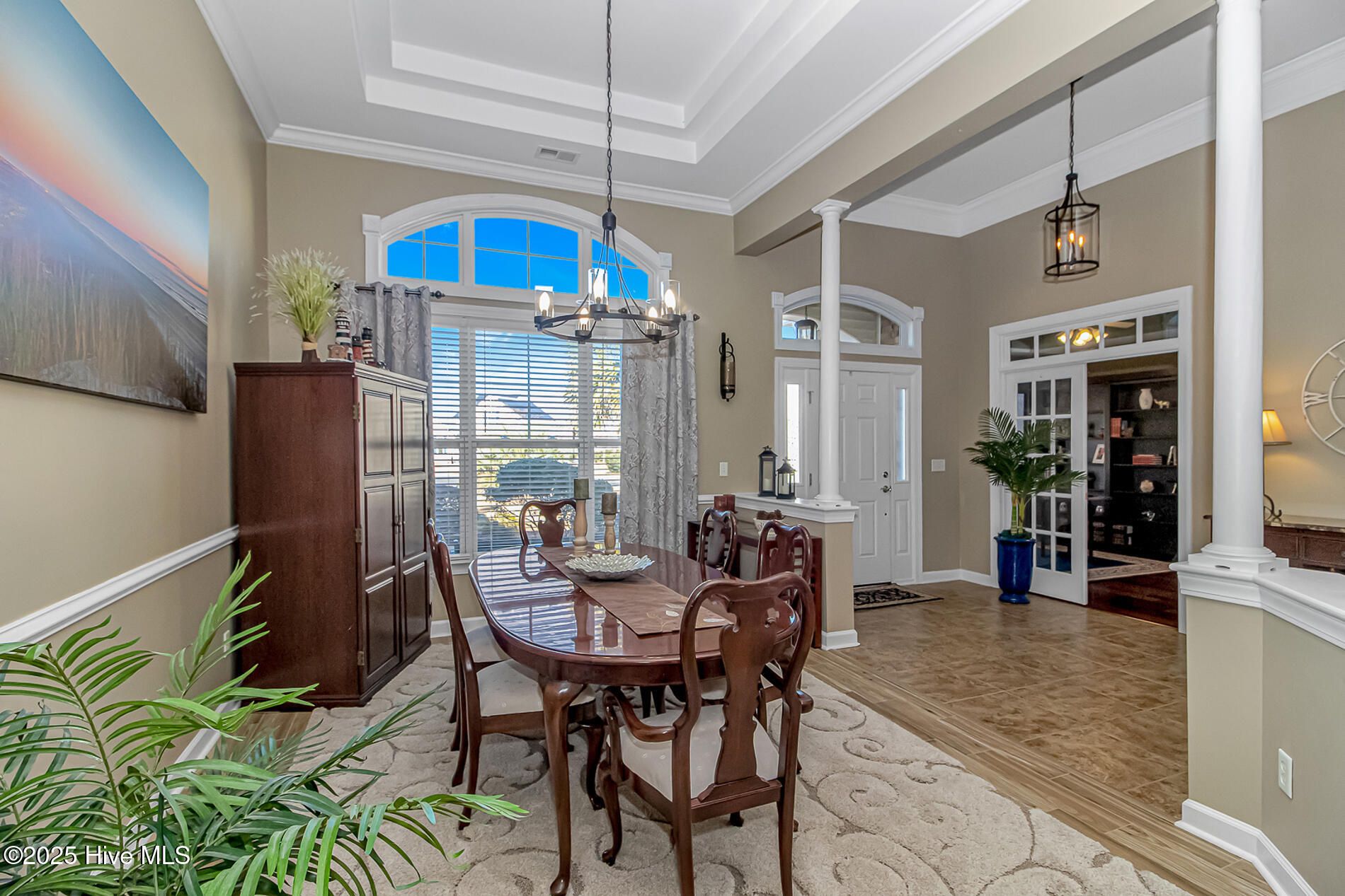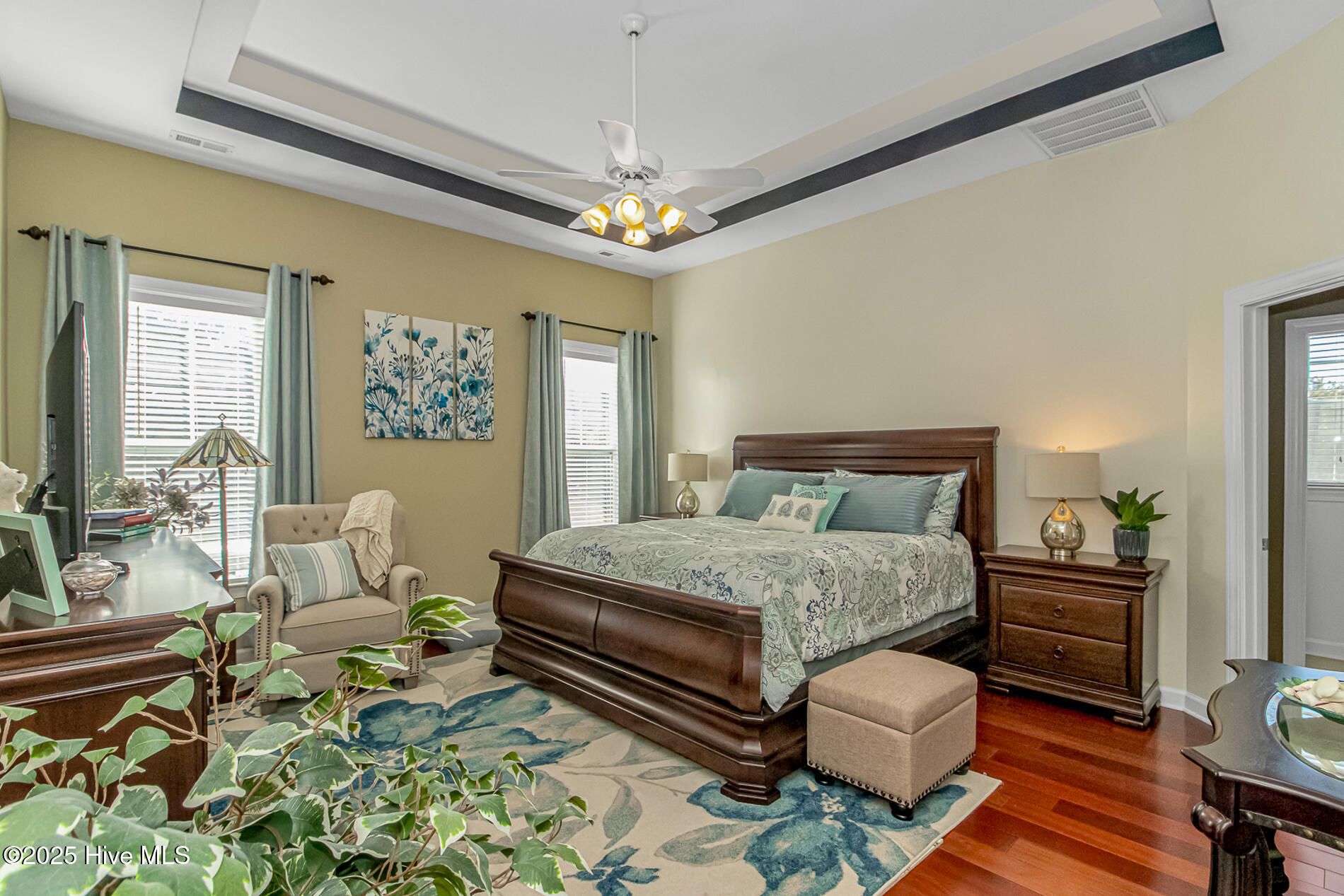 If you've been looking for a true luxury home in a highly desire golf course community, look no further. This stunning property is located in the highly desired Meadowlands Golf Course. Sitting on a private water lot in a cul-de-sac, this home leaves no stone unturned. When you enter the home, you'll immediately notice the high ceilings and open concept. To your right, there is a formal dining area with tray ceiling. To the left, there is a private office with beautiful wood flooring and tray ceiling. This office has a built in Murphy Bed and does have a closet. So this could easily be a 5th bedroom if you need additional bedroom space. What is great about this home, is that every single bedroom has its own private bathroom and there is also a half bath for guests. There are two bedrooms on the left side of the home and the Primary Bedroom is on the right side of the home, split off from the others for privacy. The living room is huge and the high ceilings make it feel even larger. Each area of the home has its own zoned air conditioning, so there are 4 thermostats throughout the home for temperature customization. Off the living room, there is a huge Carolina Room for more entertaining space. The Primary Bedroom is also massive and has a tray ceiling and gorgeous wood floors. The Primary Bathroom has dual sinks with granite counters, a big walk in closet, a secondary closet, tile floors and a custom tile shower. Off of the Carolina Room, there is an enclosed patio overlooking the water. The patio has an EZ Breeze system installed so you can keep it warm or open the windows and let the air in through the screens. The kitchen is located off the living area and has a breakfast bar, stainless steel appliances, granite counters, pantry, eat in kitchen area and plenty of cabinet and counter space. There is a laundry room off of the kitchen that leads out to the garage. The 4th bedroom is upstairs and has its own bathroom as well as tons of storage. Schedule a showing!