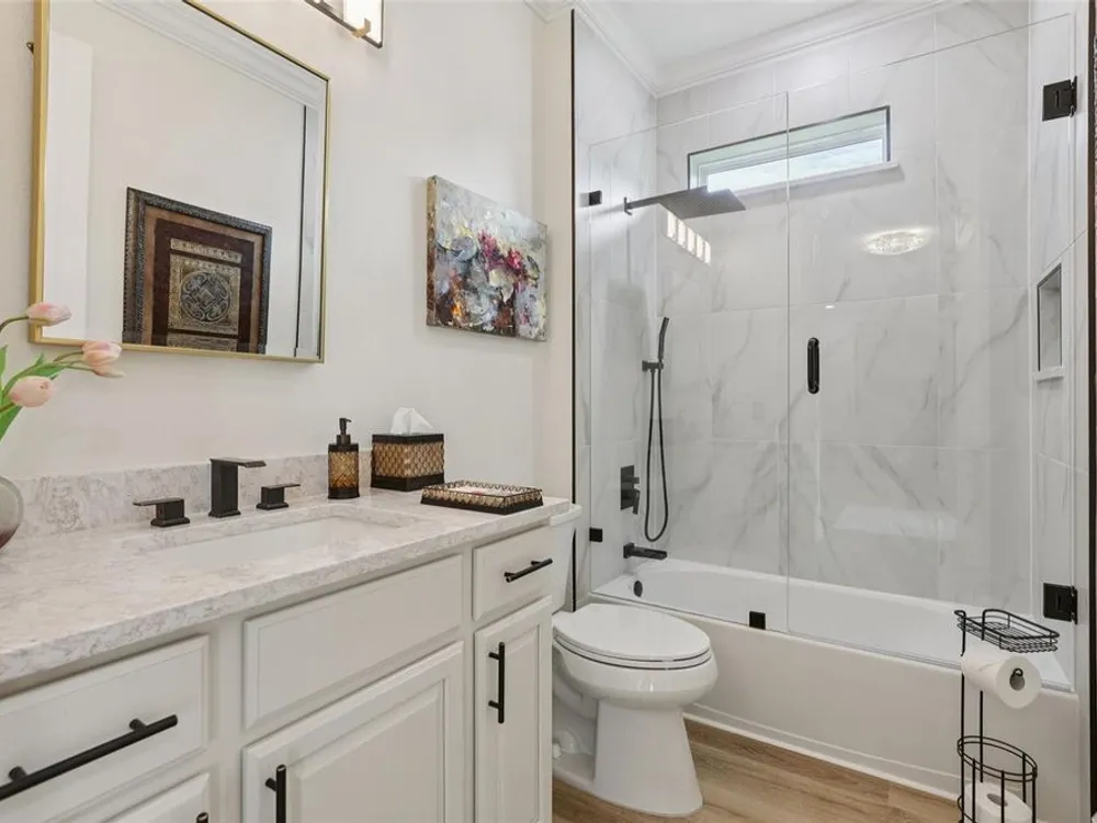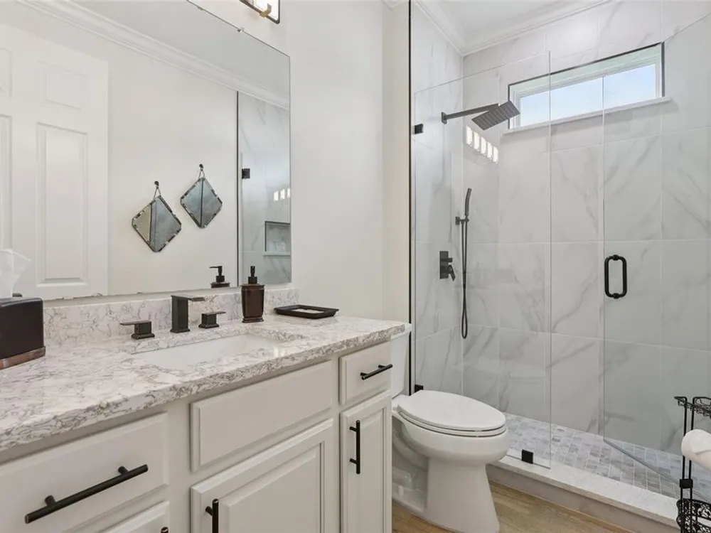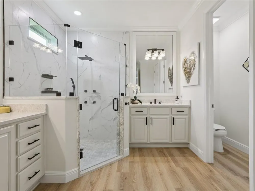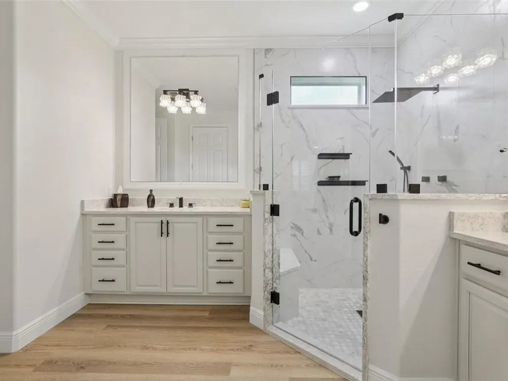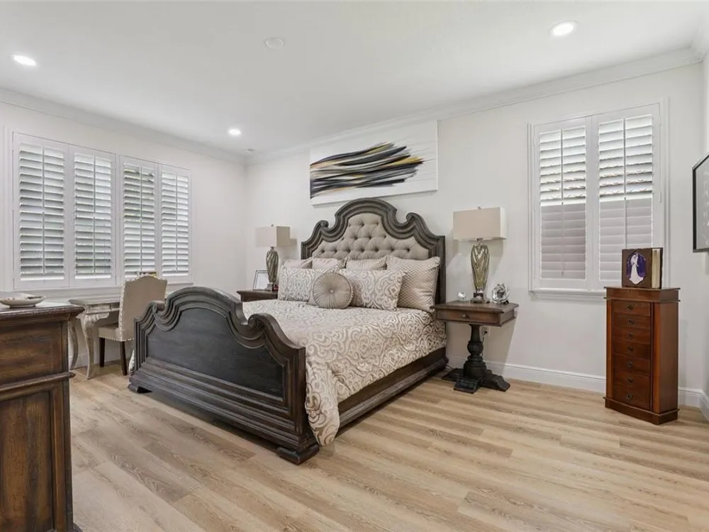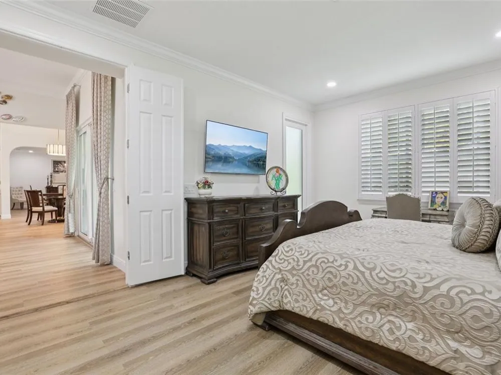 - Built-in Features, Crown Molding, Eat-in Kitchen, High Ceilings, Kitchen/Family Room Combo, Living/Dining Room, Open Floorplan, Main Level Primary, Split Bedrooms, Stone Counters, Thermostat, Walk-In Closet(s), Window Treatments