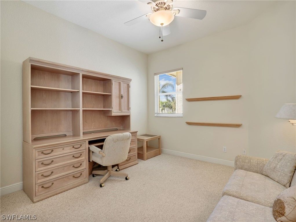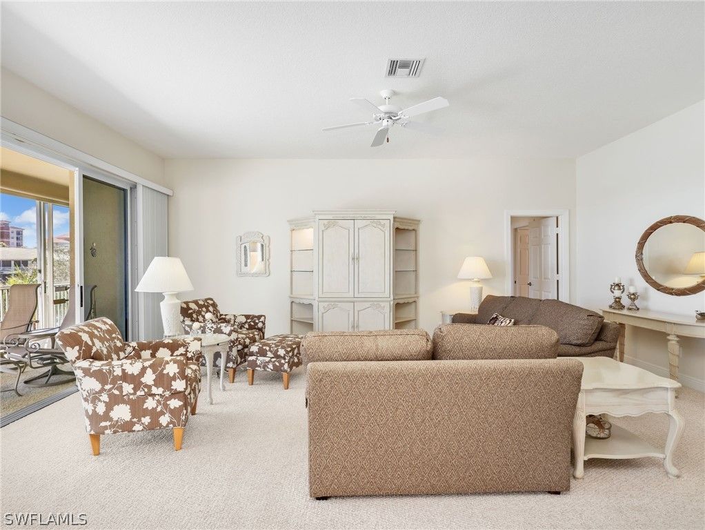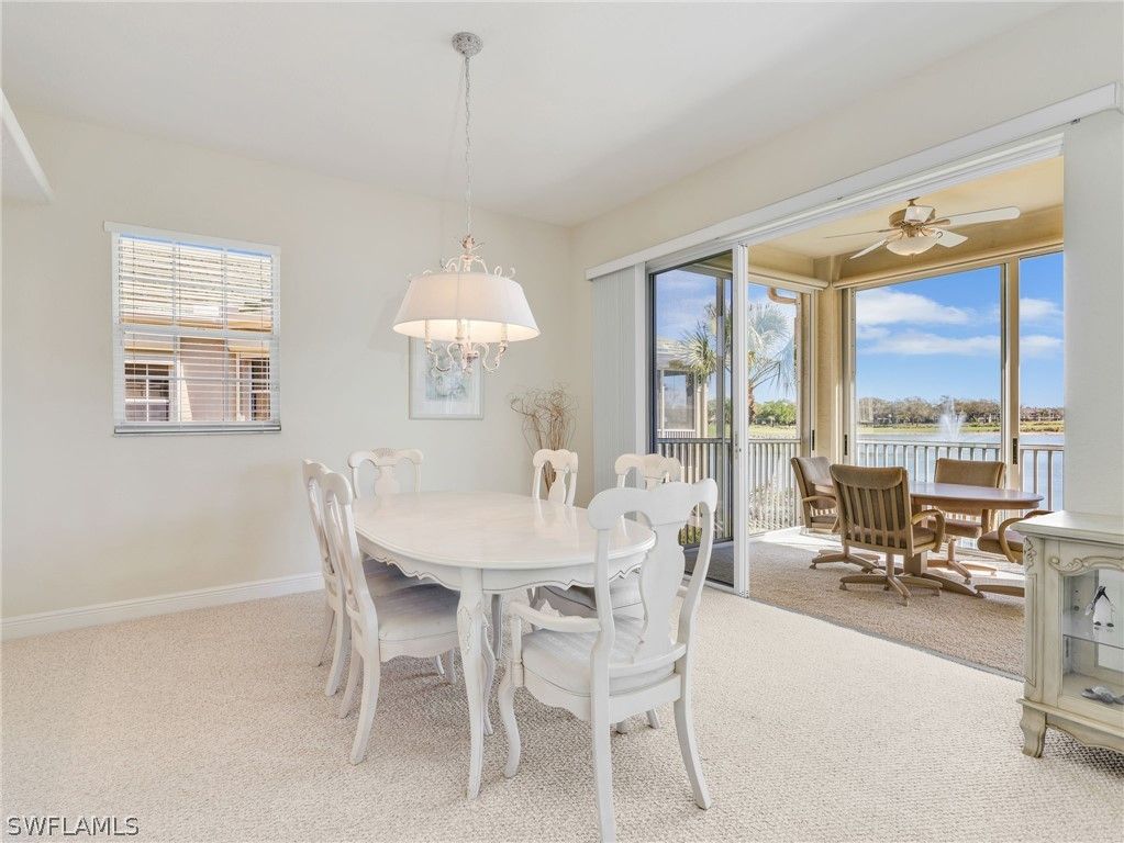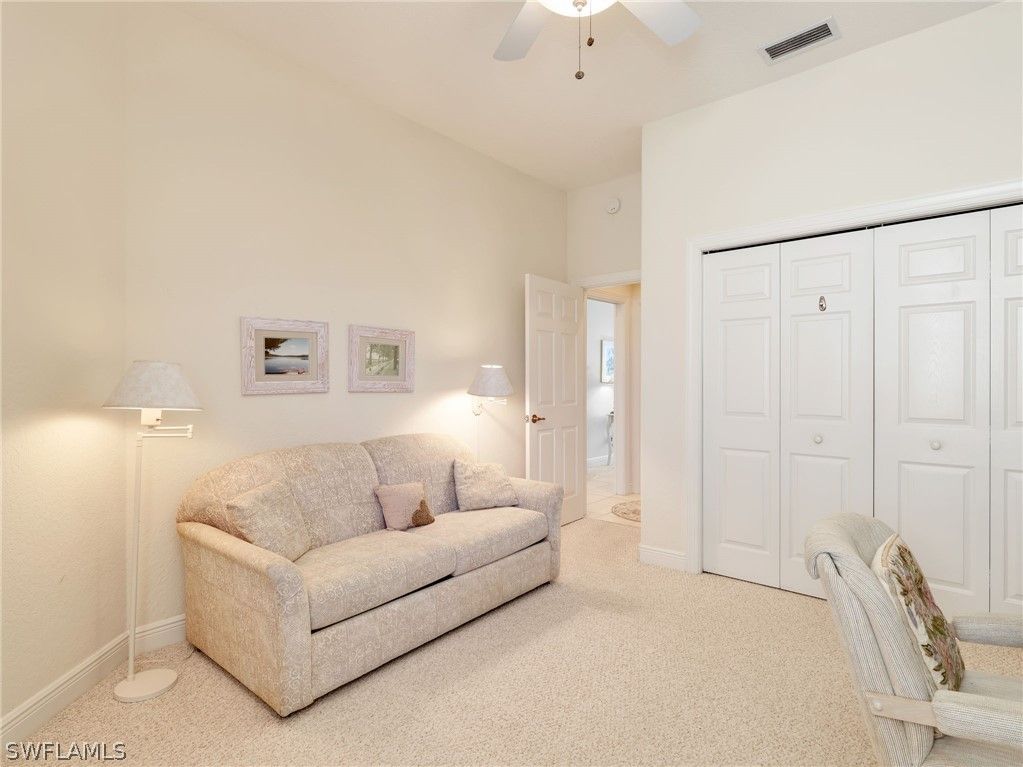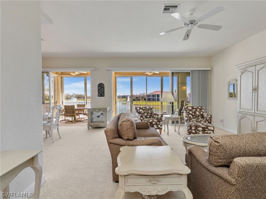 Located in Vintage Reserve within the prestigious The Vineyards, this spacious top-floor coach home with private elevator, offers a rare combination of privacy—with no residence above—and an exceptional floor plan enhanced by volume ceilings, ready for its next chapter. Washed in natural sunlight, this 3-bedroom plus Den, 3-bath residence features a thoughtful layout that includes a family room, formal dining area, and a large eat-in kitchen—providing flexibility and separation of space rarely found in coach homes. Walls of sliding glass doors open to a screened lanai that runs the full length of the residence. The lanai itself is equipped with sliding glass panels that can be closed to block the screens when desired, allowing for year-round enjoyment while maintaining comfort and flexibility regardless of season or temperature. Tranquil lake views are accented by a water fountain feature, with golf course vistas beyond—offering a calming backdrop throughout the day. The primary suite enjoys private lanai access, where the gentle sound of trickling water creates a peaceful, resort-like ambiance in the evenings. The ensuite bath features dual sinks, a soaking tub, and a separate shower. One guest bedroom includes an ensuite bath, while the third bedroom has its own dedicated bath—ideal for hosting family or guests. Additional highlights include a 2-car garage and a neutral palette throughout, providing an excellent foundation for personalization. This coach home offers great bones and a fantastic layout, making it an ideal opportunity for a buyer to enhance and update to their own taste and style. Vintage Reserve residents enjoy their own community pool and clubhouse with a full kitchen. Ideally located just a stone’s throw from the Gulf beaches and moments from Mercato, along with on-site dining and shopping, this home places everyday conveniences within easy reach. With its prime location, generous layout, and abundant natural light, this top-floor coach home presents a rare opportunity to create something truly special in one of Naples’ most desirable communities.