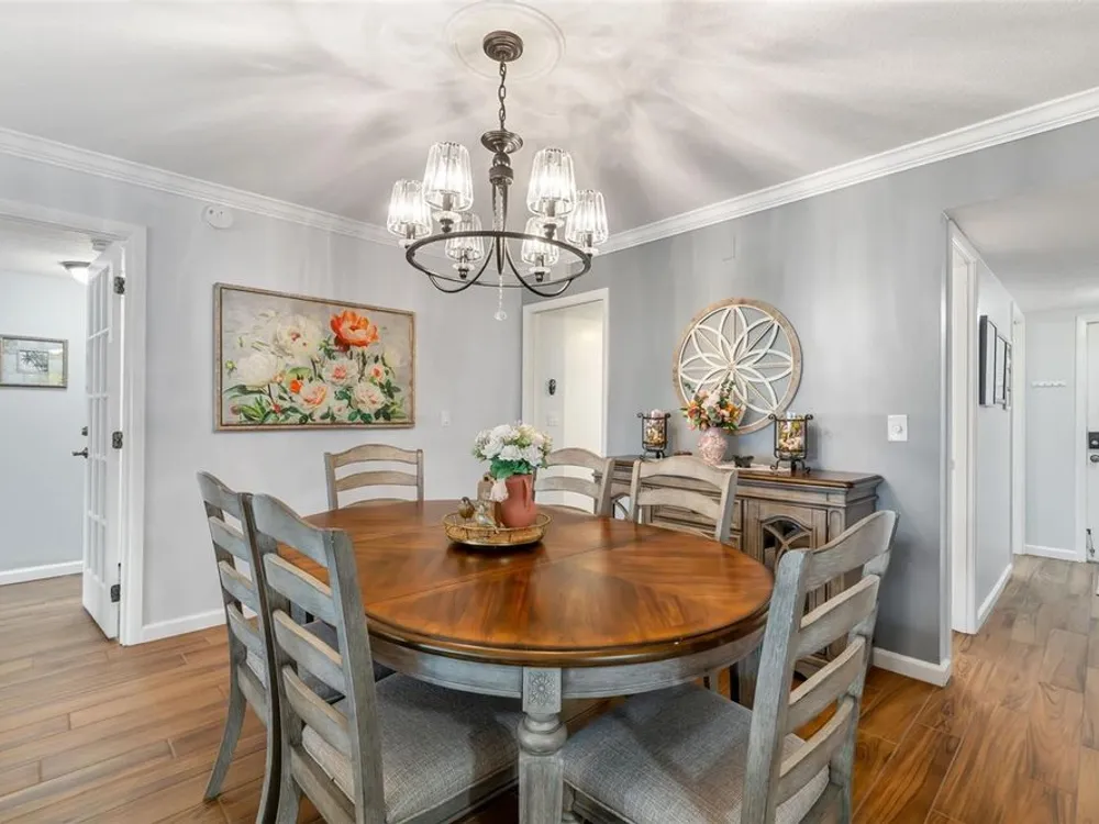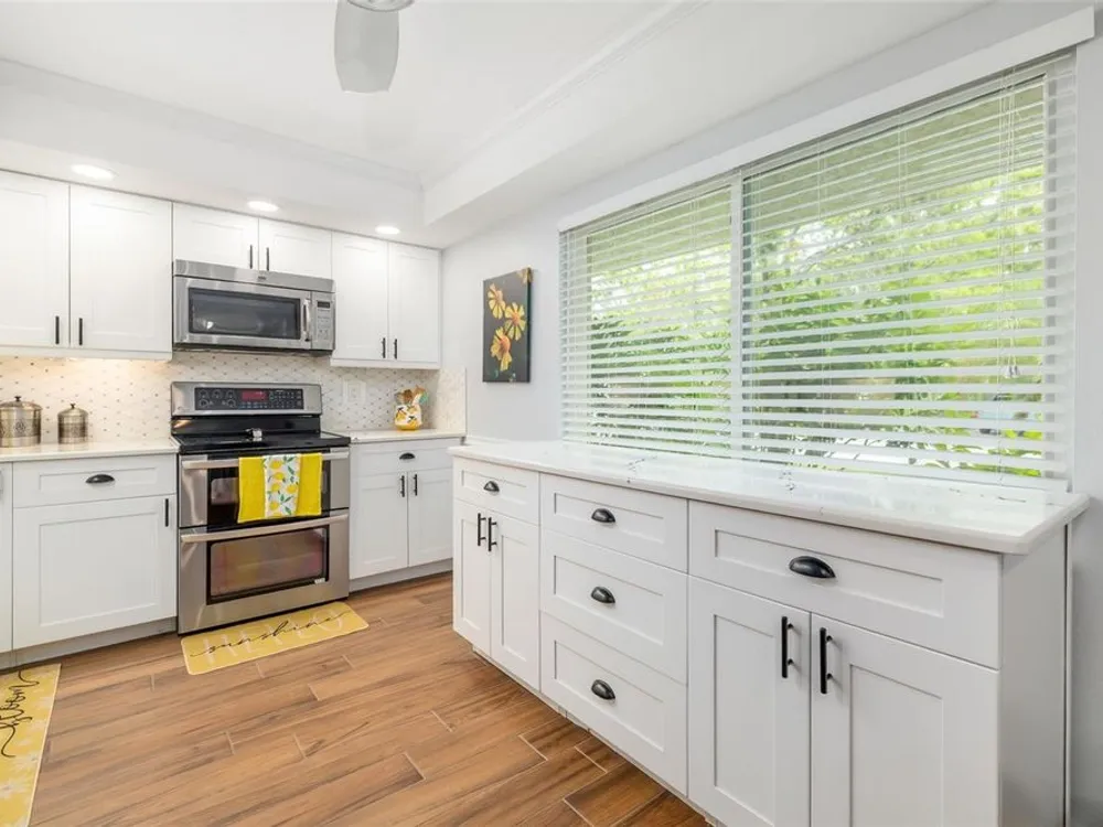 - Ceiling Fan(s), Crown Molding, Eat-in Kitchen, Living/Dining Room, Main Level Primary, Solid-Wood Cabinets, Split Bedrooms, Stone Counters, Thermostat, Walk-In Closet(s), Window Treatments