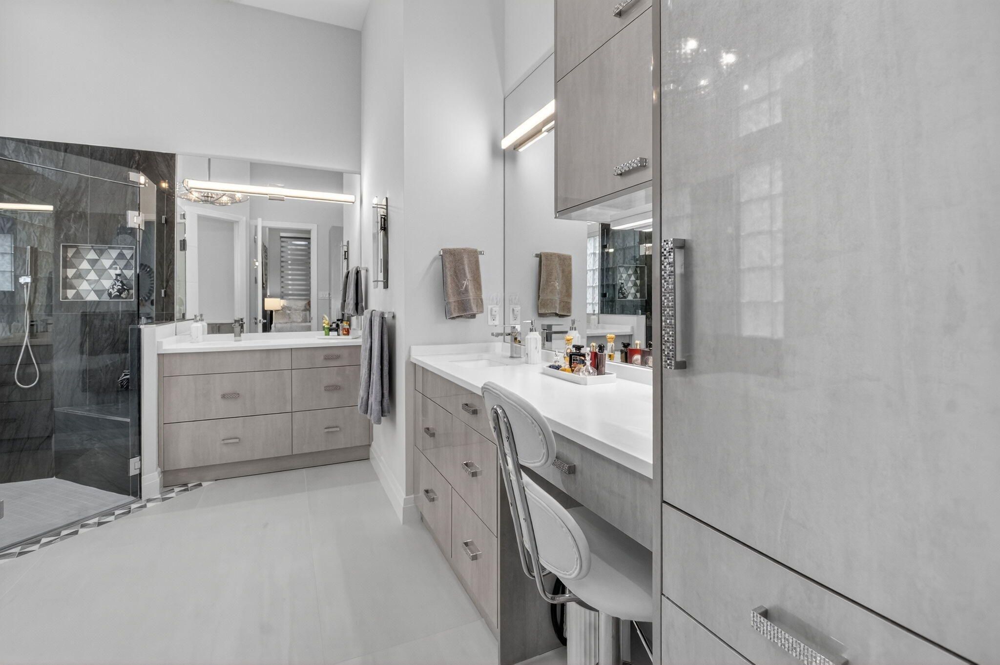 Step into luxury with this beautifully updated home featuring designer details and exceptional craftsmanship at every turn. The open-concept layout boasts 12' ceilings and porcelain 24x48-inch tile flooring throughout, creating an elegant and spacious feel. The gourmet kitchen is a chef's dream with quartz countertops, a striking porcelain island, GE Cafe appliances with Bluetooth capability and a granite composite sink with a Kohler touch free faucet.. You will find amazing storage space in the kitchen with pull out shelves in the pantries.Relax in the spa-inspired primary suite offering a separate raised soaking tub and walk in shower with raised floor, and enjoy the convenience of a large custom-fitted bedroom closet providing abundant storage.