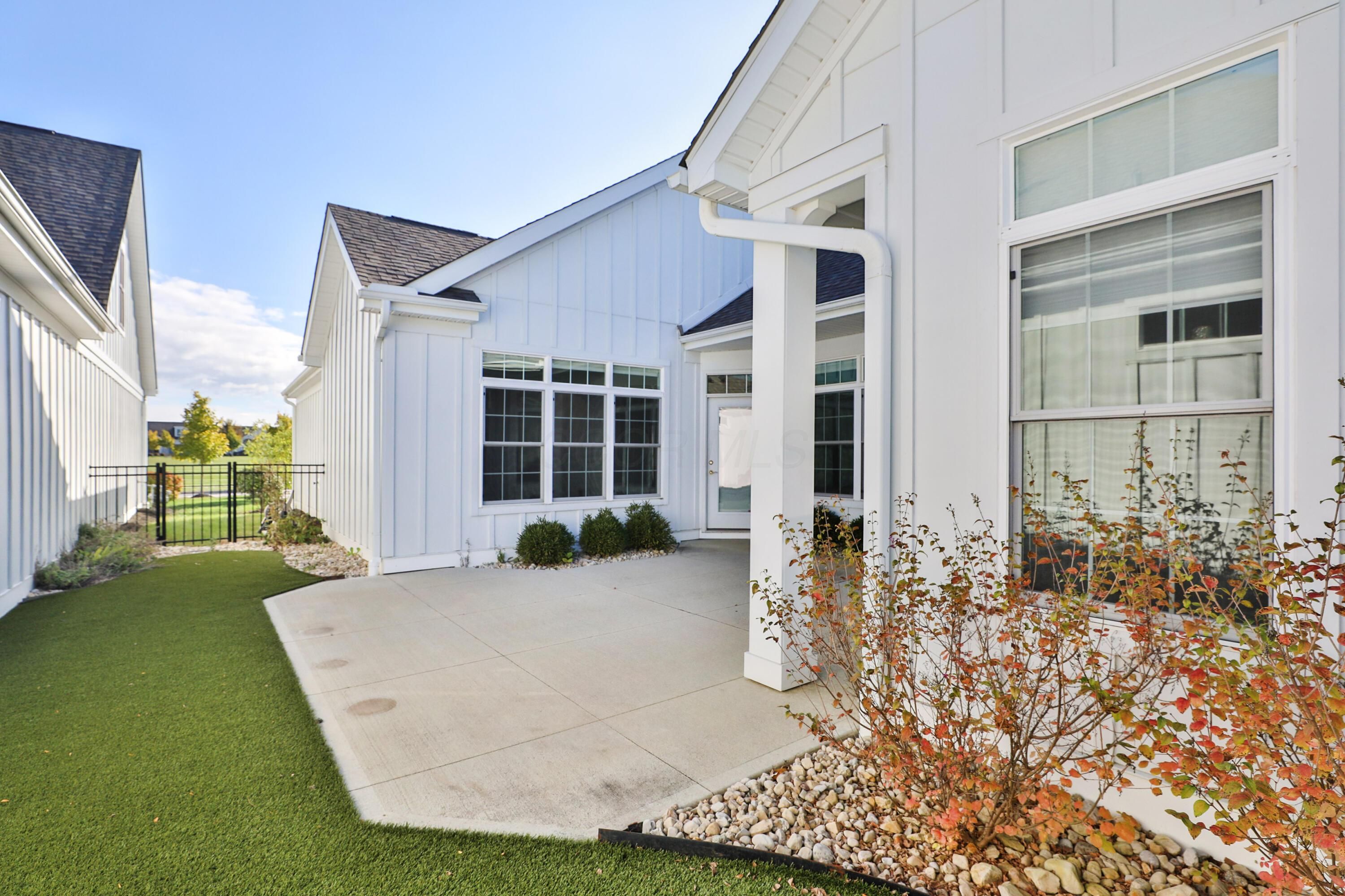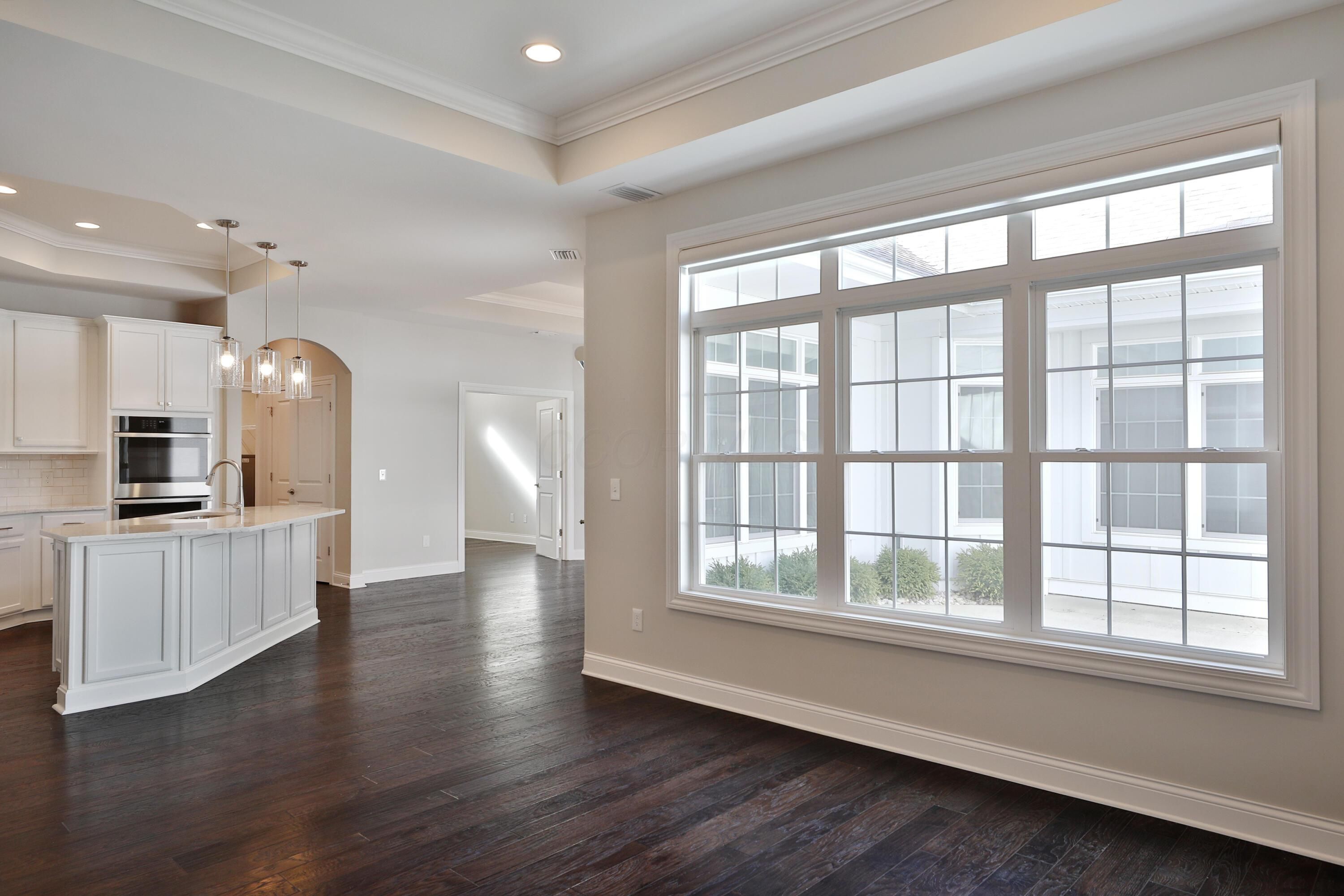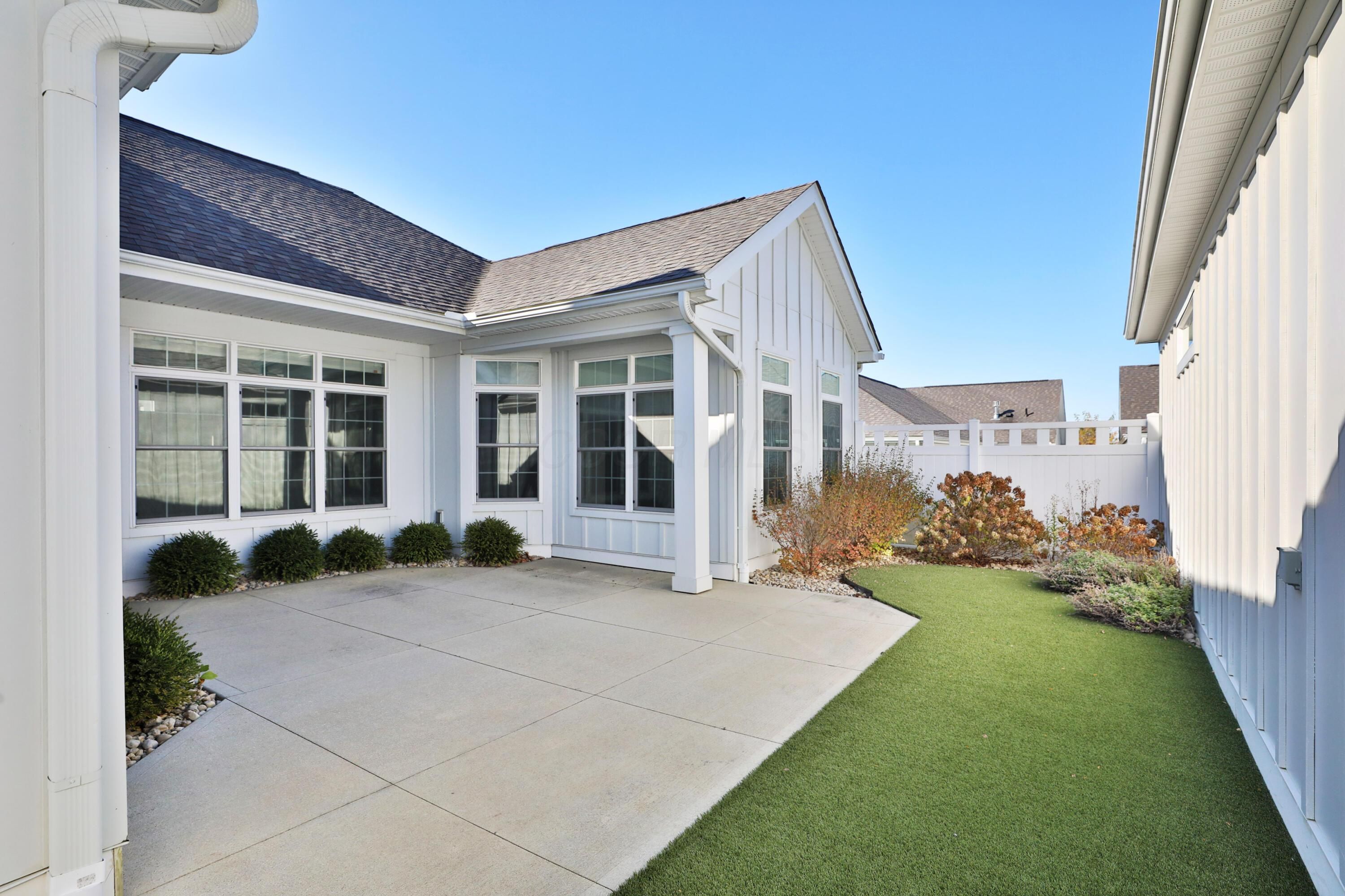 Bright, Airy & Open RANCH..this lovely patio home is situated in Courtyards at New Albany, a 55+ community. Overlooks green space & garden, walking paths, pickleball courts, pool & more. Inviting and relaxing. The home features 2 bedrooms (owner suite has attached sitting space), 2 full bathrooms, ample kitchen with large island and double ovens that opens to family room and dining space. ONE floor living boasts flexible office, utility room, laundry, two-car attached garage, and fenced patio area complete with turf grass. Neutral interior with engineered hardwood floors, added closet systems in all closets, Hunter Douglas remote blinds in main living area, and garage pull-down for storage. A truly lovely neighborhood close to downtown New Albany!