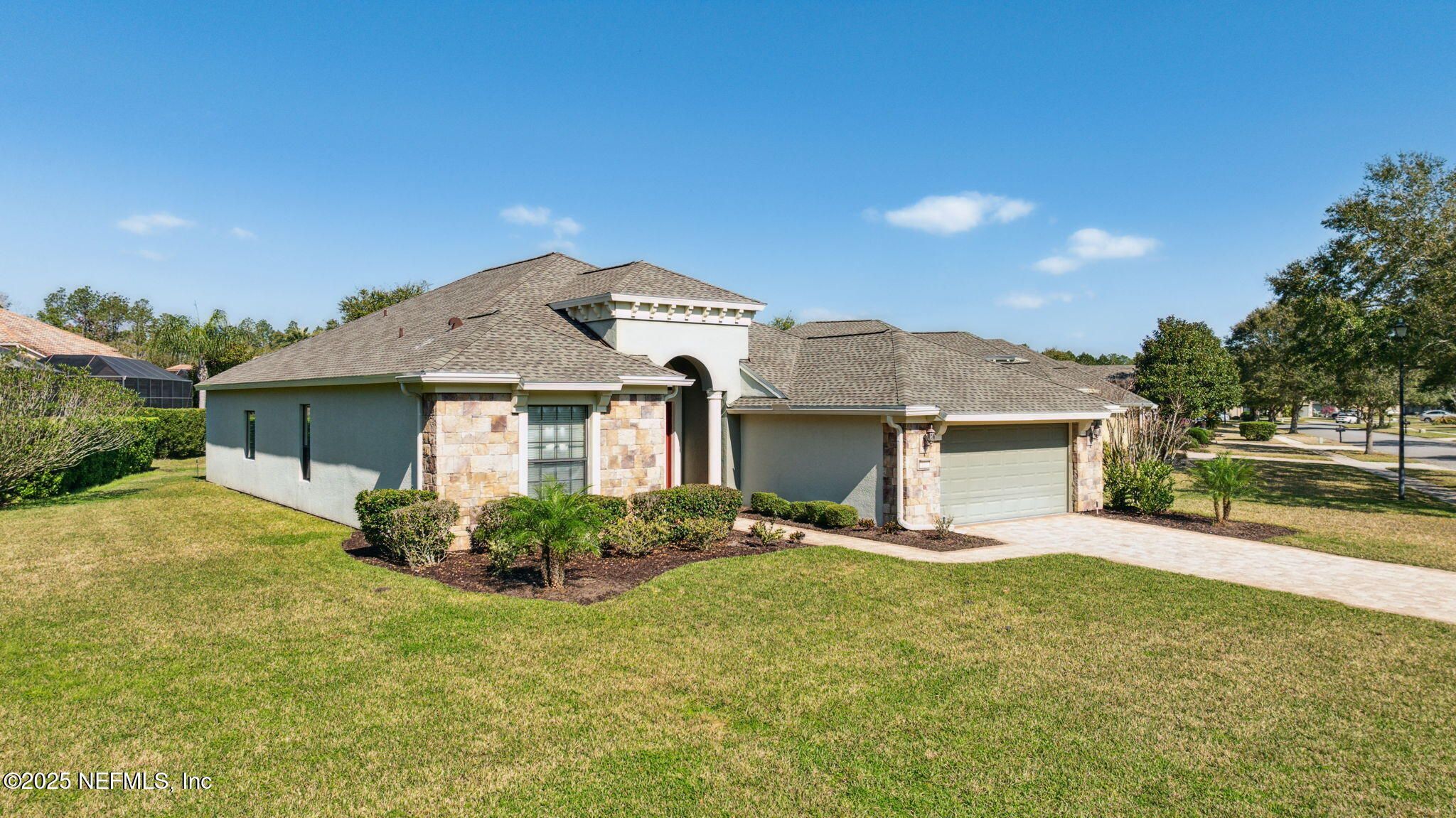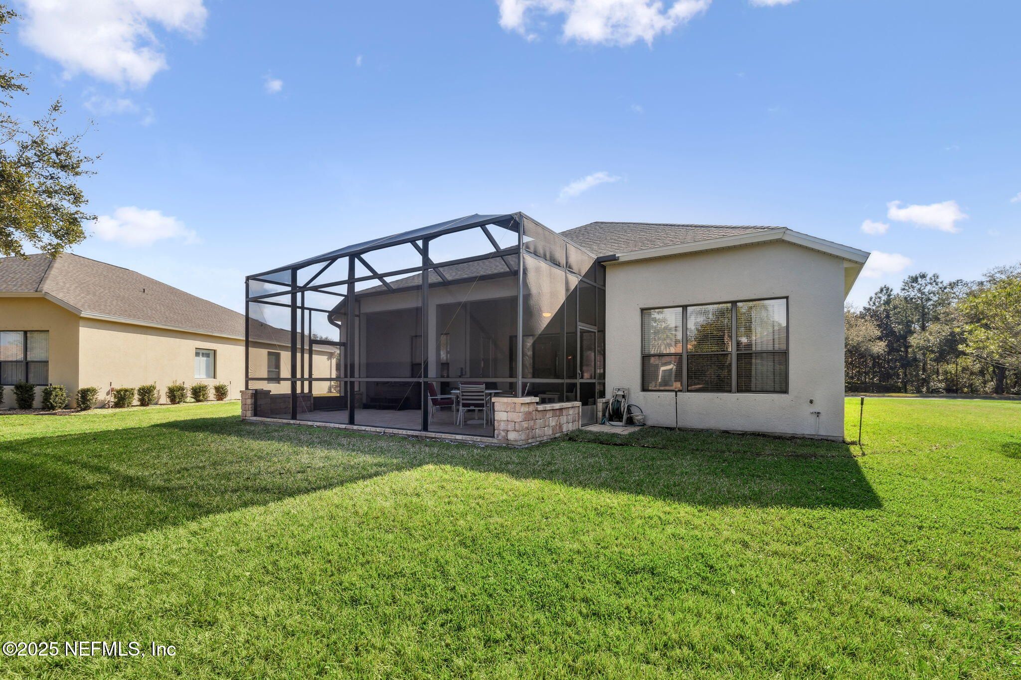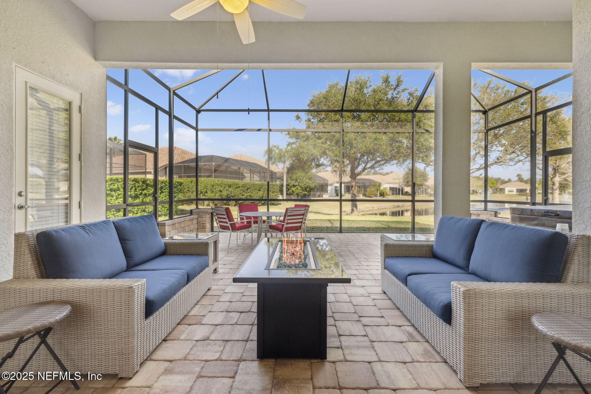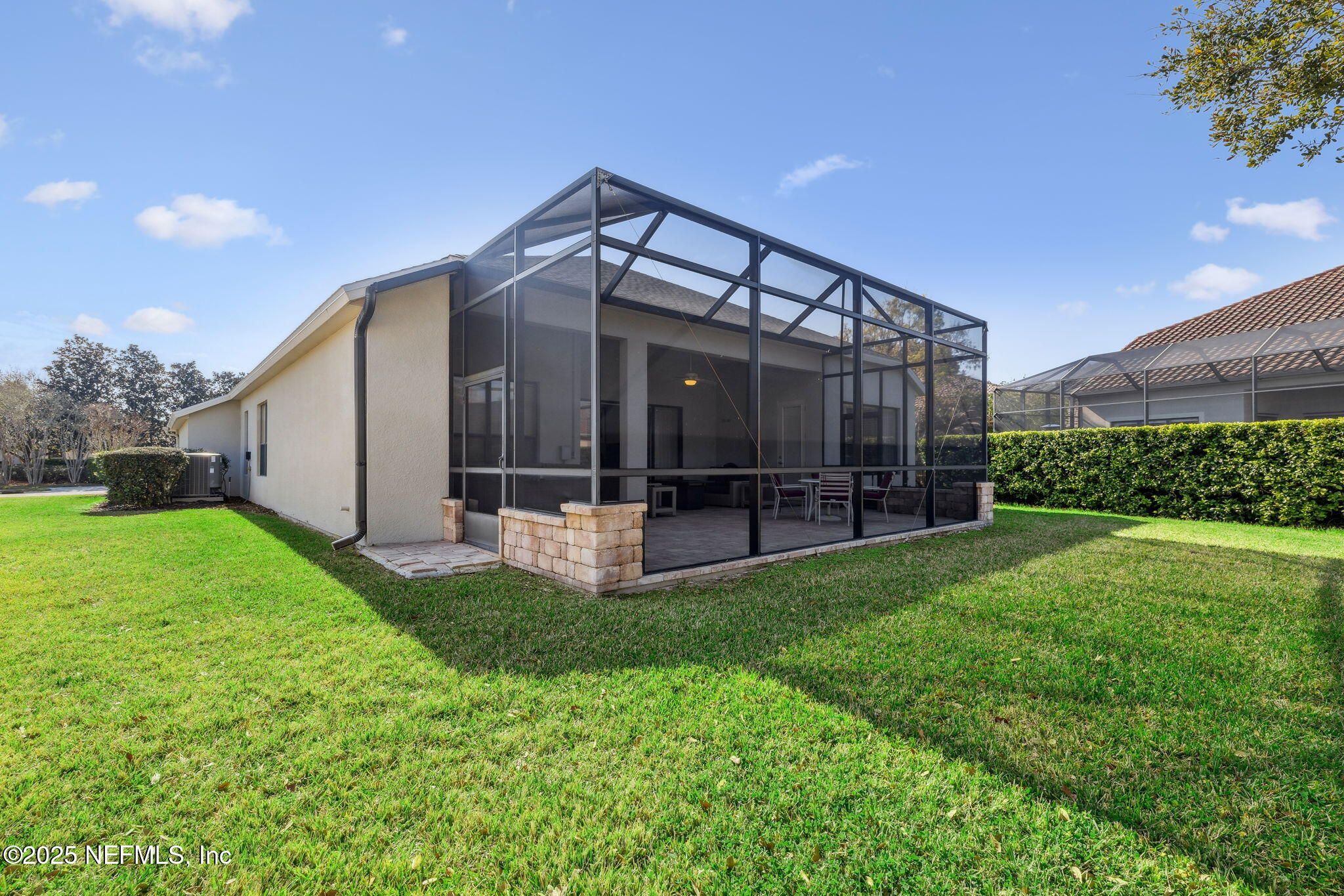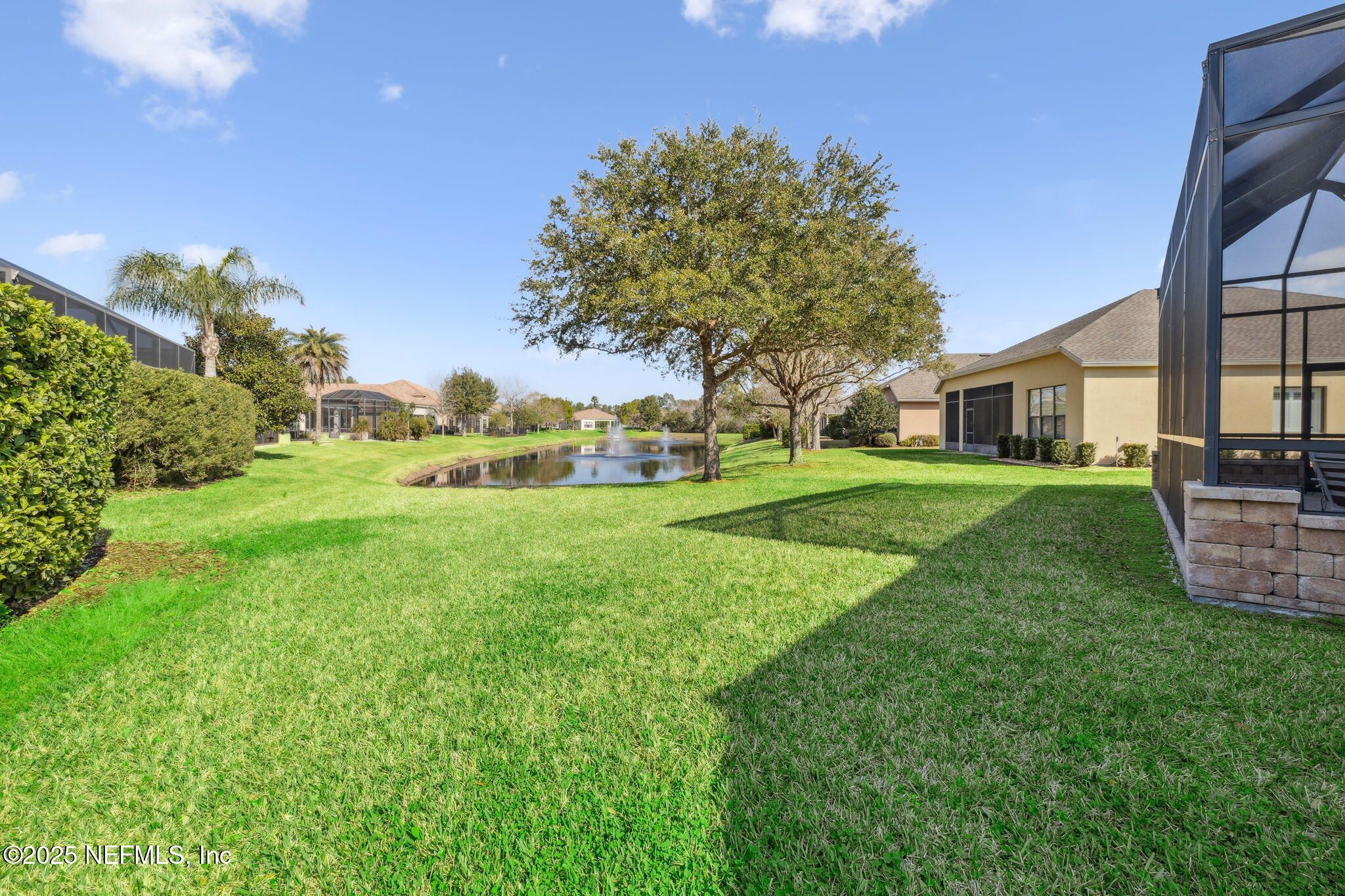 Welcome to resort-style living in the prestigious Riverwood at Del Webb gated community of Nocatee. Gracious living & comfort come together beautifully in this thoughtfully designed home, featuring three spacious bedrooms, two-bathrooms, plus additional office/den. This home sits gracefully on an oversized corner lot, offering both privacy & serene views of a fountain-adorned pond from the expanded pavered lanai. With convenient covered hot tub on spacious lanai and golf cart included, you truly have it all for a great retirement home. Step inside to discover elegant hardwood floors flowing throughout the main living areas and primary suite, providing stable footing and timeless beauty. The spacious, renovated open-concept kitchen seamlessly connects to the great room and breakfast nook, perfect for both daily living and making entertaining a breeze. The formal dining room, adorned with refined moldings, provides an elegant setting for family gatherings and holiday celebrations. The meticulously designed screened lanai features a covered therapeutic hot tub - ideal for gentle exercise and relaxation year-round, while enjoying peaceful pond views. This well-established 55+ community of Riverwood at Del Webb delivers exceptional recreation amenities and resident clubs, as well as access to all of Nocatee's premier facilities, making it easy to maintain an active and social lifestyle at your own pace. Golf cart transportation throughout the community ensures easy, stress-free access to activities and neighbors, perfect for those seeking a more relaxed pace of life. The home's solid concrete-block construction and new roof provide lasting durability and safety, while its convenient location offers peace of mind with world-class healthcare at Mayo Clinic, beautiful beaches, and convenient shopping and dining options just minutes away. This home perfectly balances comfort and elegance with convenience and accessibility. Whether you're hosting bridge club in your elegant dining room or enjoying a quiet sunset on the lanai, this residence offers the perfect setting for your retirement years.