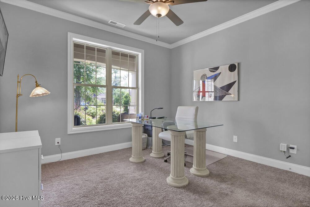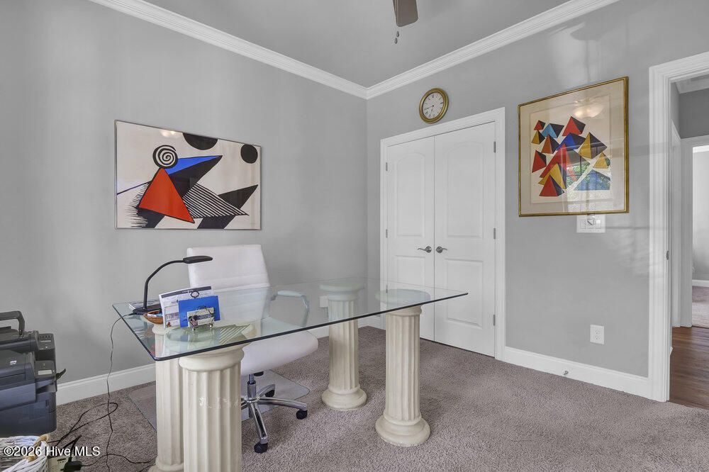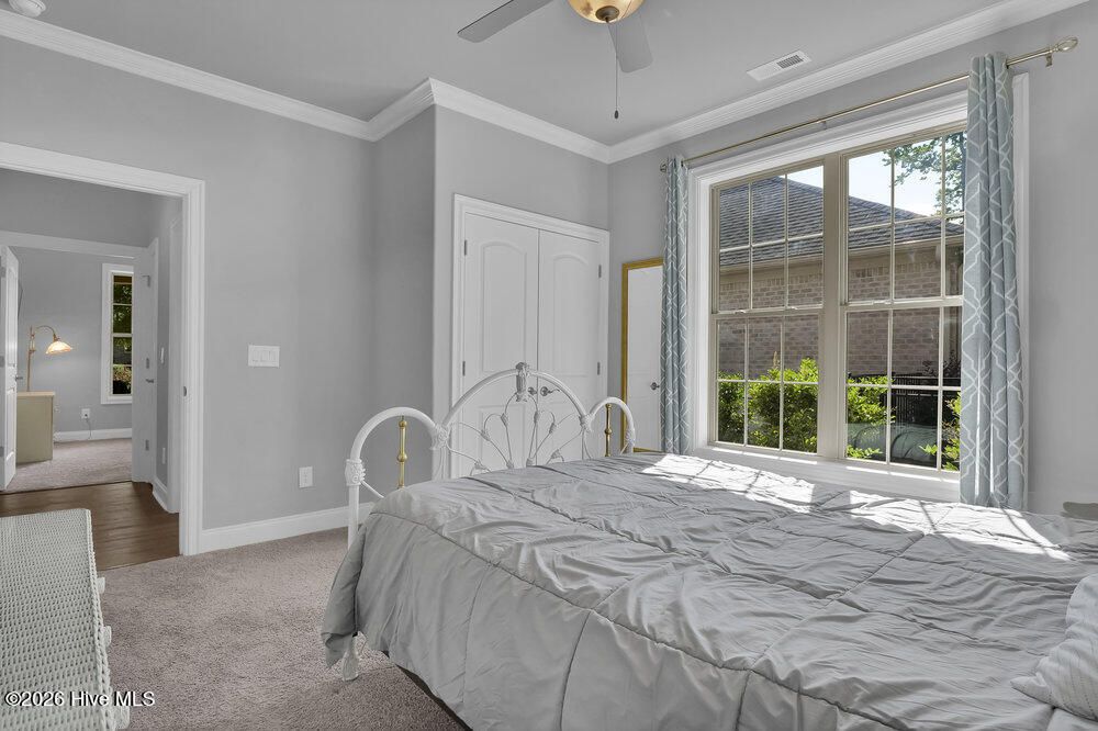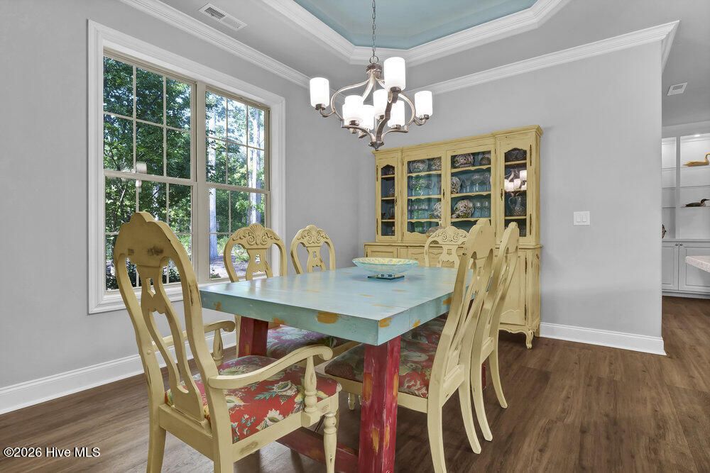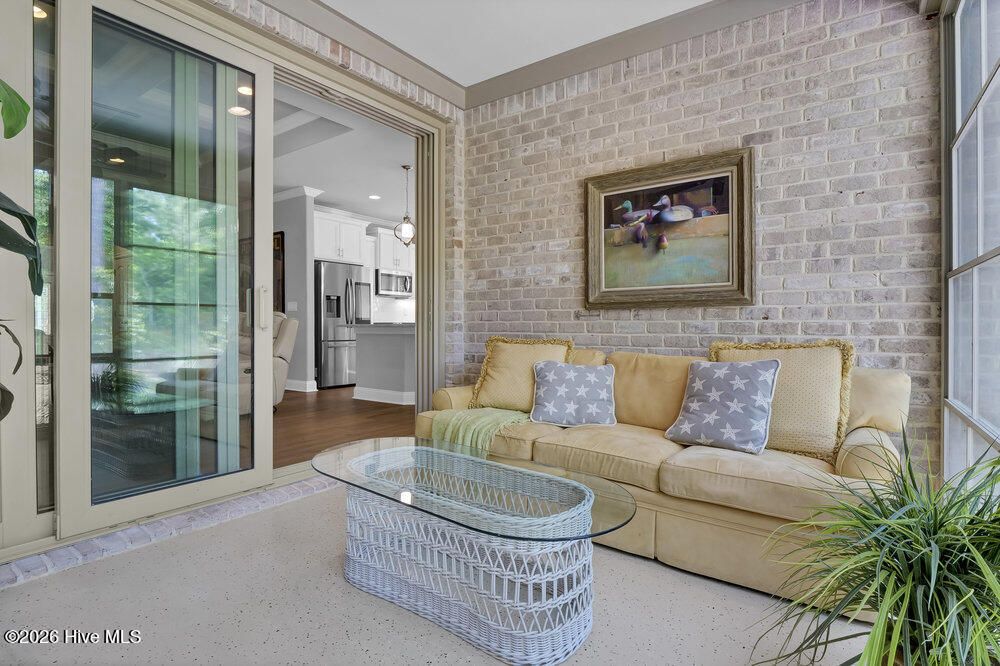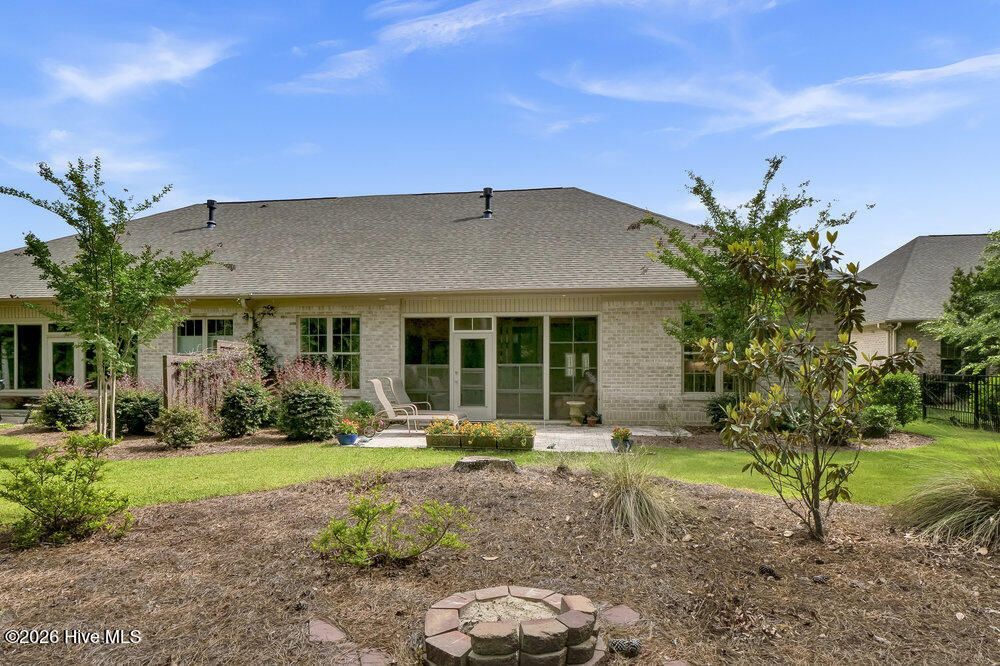 Welcome to this refined 4 BR, 3 Bath brick home in the gated community of River Bluffs. This mostly one-level home comprises 3 BRs and 2 full baths on the 1st floor and a spacious 4th BR or den and full bath complete the 2nd floor. A discerning buyer will appreciate the fine interior that includes a gourmet kitchen boasting a sumptuous center island and breakfast bar with quartz counters, tiled backsplash and under-mount lighting. Upgraded stainless steel appliances include a wi-fi connected Samsung refrigerator with an in-door screen, a dishwasher, microwave, a gas range/oven and cabinets with pull-out drawers. The kitchen is open to the dining room boasting a tray ceiling and garden views. An open and inviting living room features a coffered ceiling, a gas-log fireplace flanked by elegant bookshelves and cabinets. Sliding doors from the living room lead to the cozy 3-season sunroom (unheated) overlooking the rear yard. The primary suite is a tranquil retreat with a beautiful tray ceiling, a sitting area and dual closets. An ensuite primary bathroom features an extended vanity area with dual sinks and quartz counters, a linen closet and a walk-in, tiled shower. Unwind outside on the expansive covered front porch or dine al fresco on the paved rear patio with garden and nature views. Other features include a laundry room and an attached 2-car garage with a climate-controlled storage room. Enjoy a carefree lifestyle as the HOA dues cover lawn maintenance, exterior maintenance on the home and insurance. River Bluffs, located on the Cape Fear River, is an exceptional community that offers a water-oriented and active lifestyle with a community marina, boat slips, a boat/kayak launch, a half mile riverwalk, a riverfront pavilion and riverfront parks. Other amenities include a community pool, tennis, pickleball and basketball courts, a dog park, a fitness center, mail station, a community garden, numerous parks and trails, boat and RV storage and The Riverside Kitchen & Bar - a full-service restaurant with indoor and outdoor dining. Boat slips in the community marina are available for purchase at an additional cost depending on the size desired. River Bluffs is ideally located just 10 minutes from all the cultural activities, shops and restaurants in Historic downtown Wilmington and close to I-40.