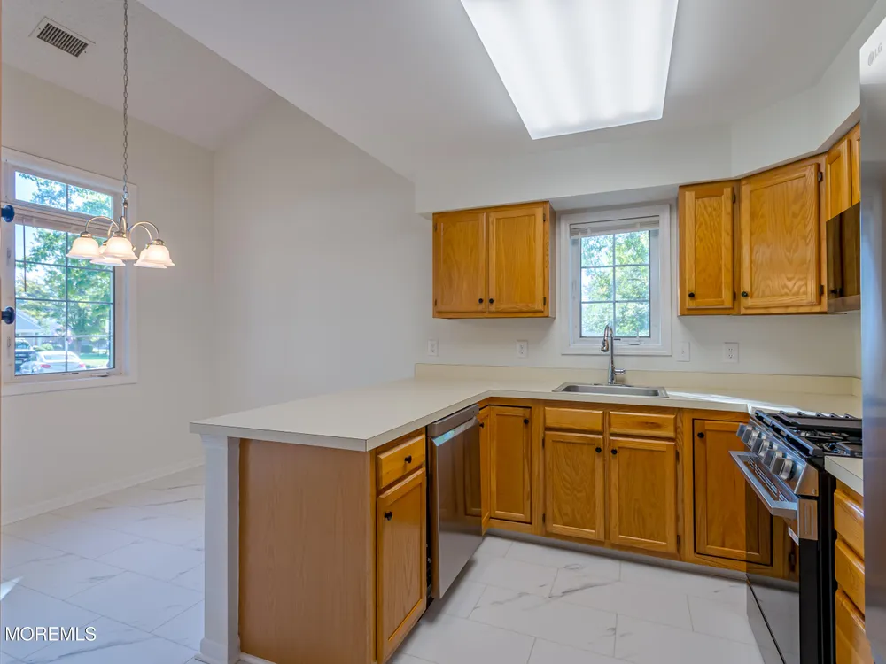 Discover your new lifestyle of easy living at Greenbriar at Whittingham! This freshly painted, immaculate home with an attached garage, is perfectly positioned in one of the area's most vibrant active adult communities. The charming front porch offers a warm welcome and offers just the right space for a cozy seating arrangement. Inside, the foyer invites you into a bright and cheerful open layout! Elegant engineered hardwood flooring flows seamlessly throughout the foyer, living and dining rooms while a thoughtfully positioned butler's pantry between the two spaces offers added convenienceperfect for effortless entertaining. The living room features a soaring vaulted ceiling and sliding glass doors that lead out to a recently updated side patioa private, fenced-in retreat perfect for outdoor dining or relaxing during the warmer months. The dining room is filled with natural light from a large window. The kitchen boasts all brand-new stainless steel appliances, stylish new luxury vinyl tile flooring, ample cabinetry and storage, and a sunlit eat-in area with a vaulted ceiling. The Primary bedroom suite is located here on the main level and offers brand new carpet, a vaulted ceiling with a new ceiling fan, walk-in closet with new recessed lighting, and a spacious en-suite bath featuring an extended dual-sink vanity, oversized mirrors, a bathtub, separate glass-enclosed shower, and a new toilet. Also on the main level, you'll find a convenient powder room and a laundry room equipped with new LVT plank flooring and a brand-new washer and dryer. Upstairs, the spacious loft with brand-new carpeting and a vaulted ceiling overlooks the living room belowan ideal flex space that works beautifully as a cozy den, home office, or inviting guest area. There is a second bedroom on this level with new carpet and new lighting, and is served by a full hall bath with a tub/shower combination. Enjoy the resort-style amenities that Greenbriar is known for, including: the clubhouse with ballroom, billiard room, gym, indoor and outdoor pools, tennis, pickleball, bocce, and shuffleboard courts, golf course, and an on-site restaurant. All lawn care, landscaping, and fencing are fully maintained for worry-free living. Schedule your tour of this home, today! Easy access to NJ Turnpike and NYC buses. $3500 Capital contribution to HOA due at closing