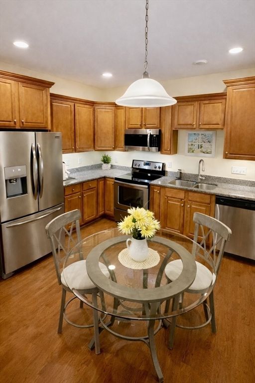 Luxury living at The Pines at Reading Woods, a desirable 55+ active adult community. This beautifully maintained 2 bedroom, 2 bath corner, ground-level unit offers effortless one-level living with an open floor plan, hardwood floors, and private outdoor access. The kitchen features granite countertops, stainless steel appliances, and a dining area perfect for everyday living and entertaining. The spacious primary suite includes a walk-in closet and en-suite bath with double vanity and walk-in shower. A second bedroom and full bath provide flexibility for guests or office space. Additional highlights include in-unit laundry, central air, and ample storage. Enjoy two deeded garage parking spaces in a heated garage with elevator access, plus clubhouse, fitness center, and walking trails—all close to shopping, dining, and easy access to I-95/128.