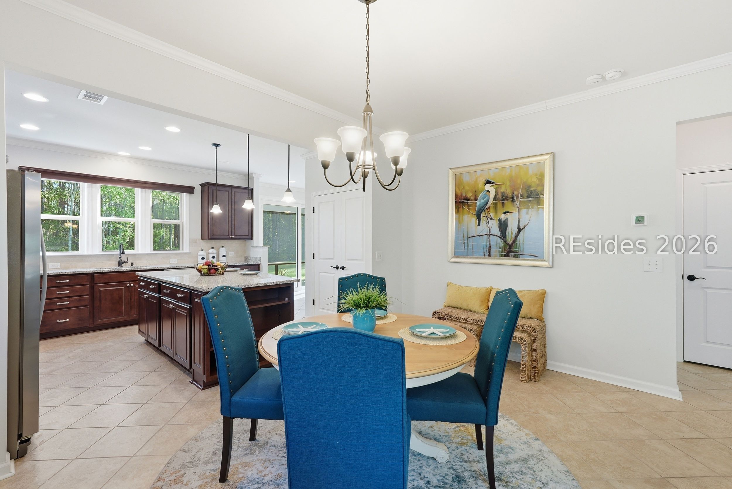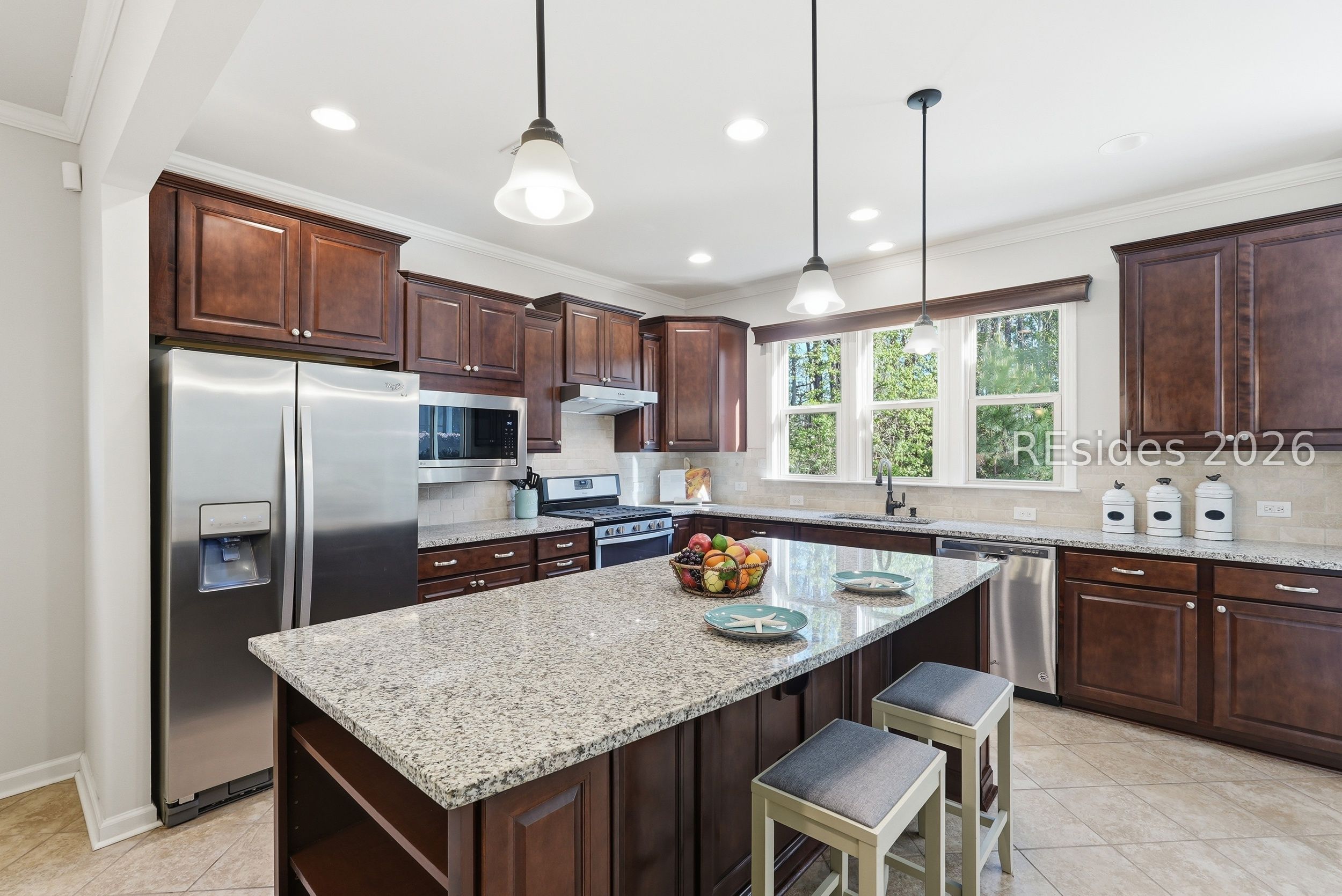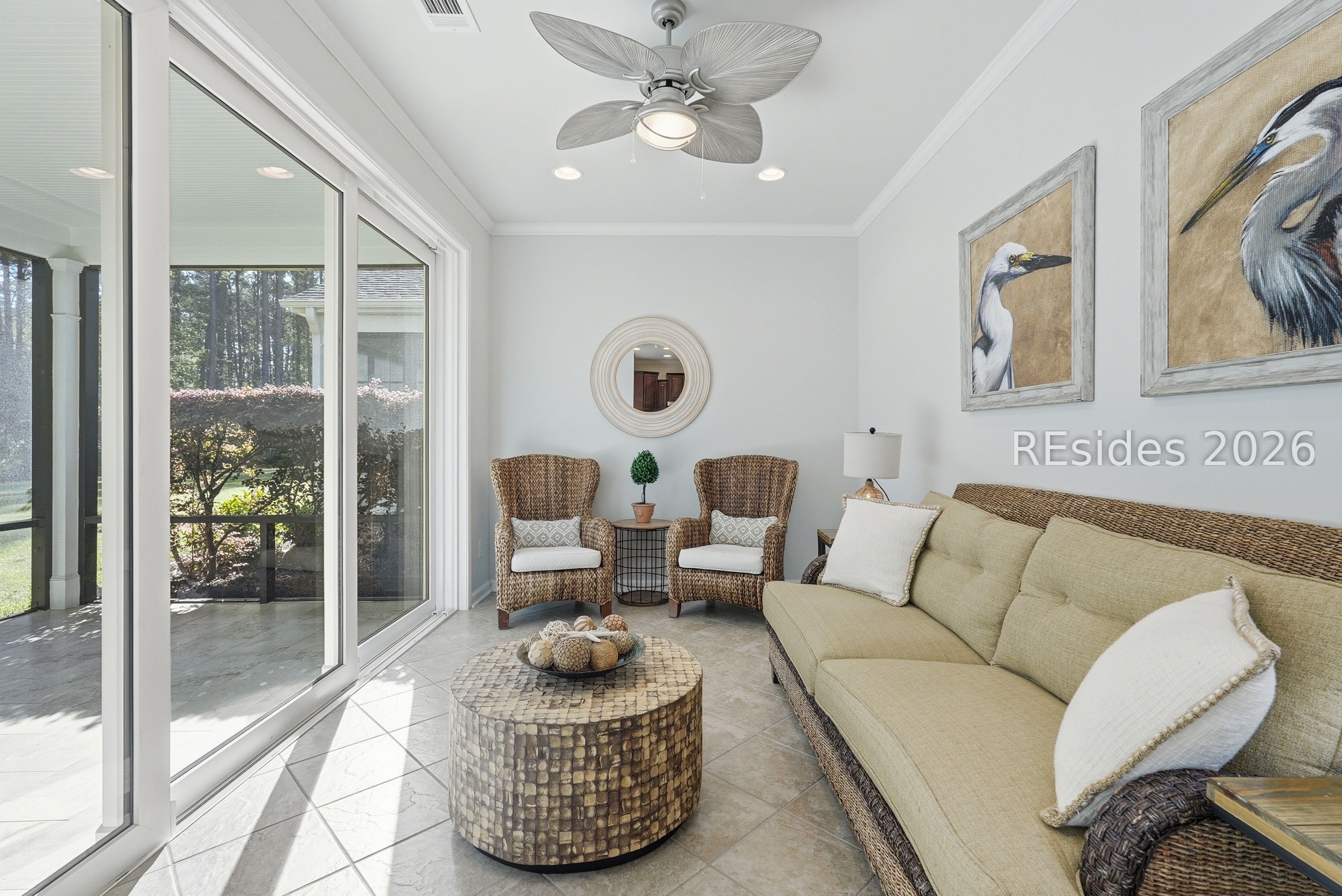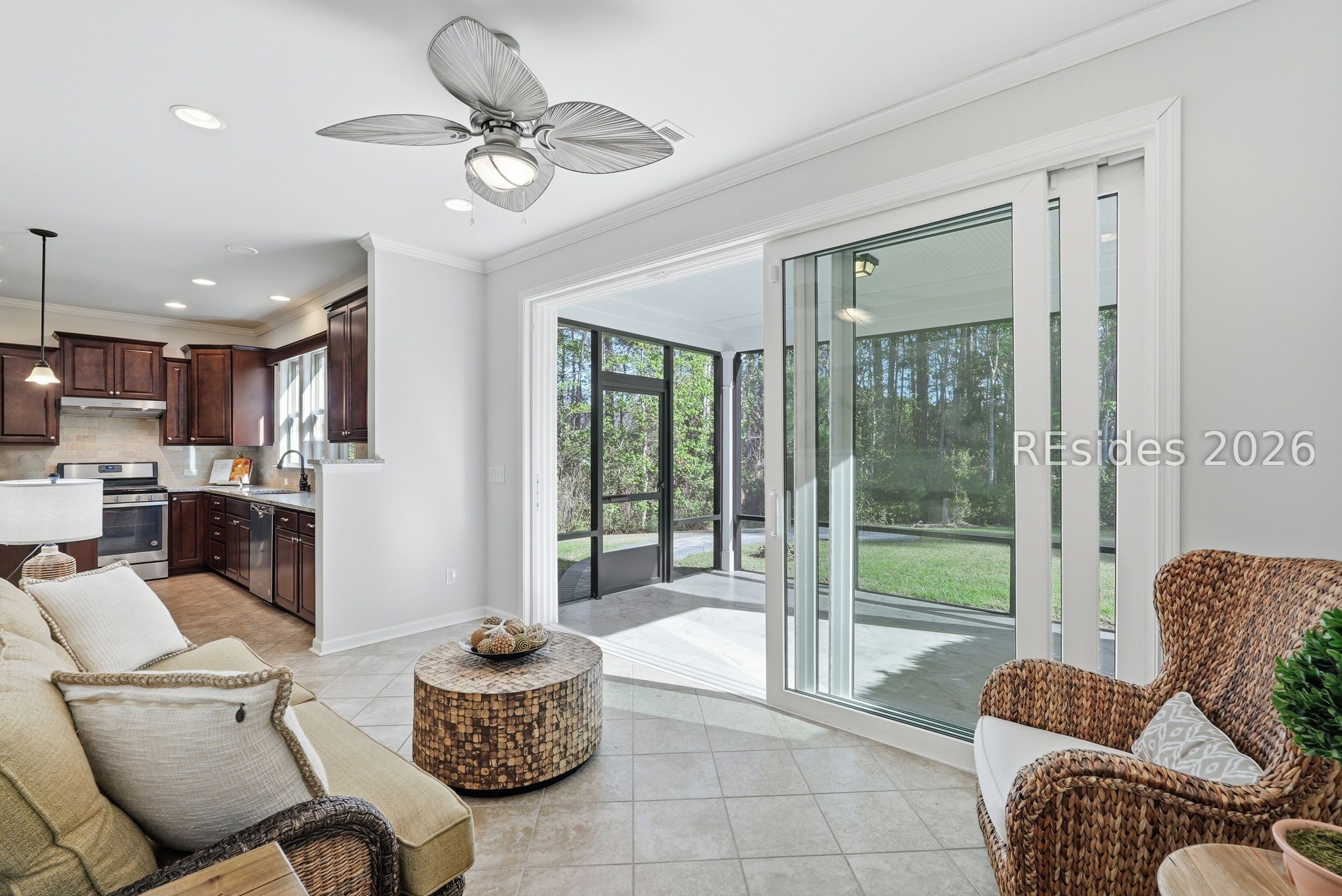 One-of-a-kind location! This home blends exceptional convenience to amenities, local dining and shopping with the quiet luxury of a peaceful, wooded setting. Thoughtful design and effortless Lowcountry living come together in this beautifully maintained Taft Street model, ideally positioned on the South Side of Sun City in Beaufort County. Built in 2017, this home offers a modern design and layout. Featuring 3 bedrooms, 2 baths, and a spacious Carolina Room, this home lives larger than its footprint with a bright, open layout and seamless flow throughout. Tile flooring runs through the main living areas, complemented by crown molding, recessed lighting, and abundant natural light. The kitchen is both functional and inviting, featuring granite countertops, tile backsplash, gas range, and a generous island with added cabinetry and pull-out drawers-ideal for everyday living or entertaining. A light-filled Carolina Room extends the living space, opening through a triple-panel slider to a covered screened porch and paver patio. The primary suite offers hardwood flooring, a tray ceiling with crown molding, and a spacious walk-in closet, while the en-suite bath features a dual vanity and a beautifully tiled walk-in shower with bench seat and transom window. A flexible third bedroom with French glass doors provides the perfect space for a home office or guest accommodations. Additional highlights include a stained-glass front door, epoxy garage flooring with pull-down attic storage, and a gas stub for grilling. Set on a private homesite on a quiet cul-de-sac street with minimal traffic, this home also offers exceptional convenience with easy golf cart access to nearby restaurants, shops, and everyday essentials, along with close proximity to the main amenity center. Enjoy resort-style amenities including pools, fitness centers, golf, pickleball, tennis, and over 200 clubs that define the Sun City lifestyle.