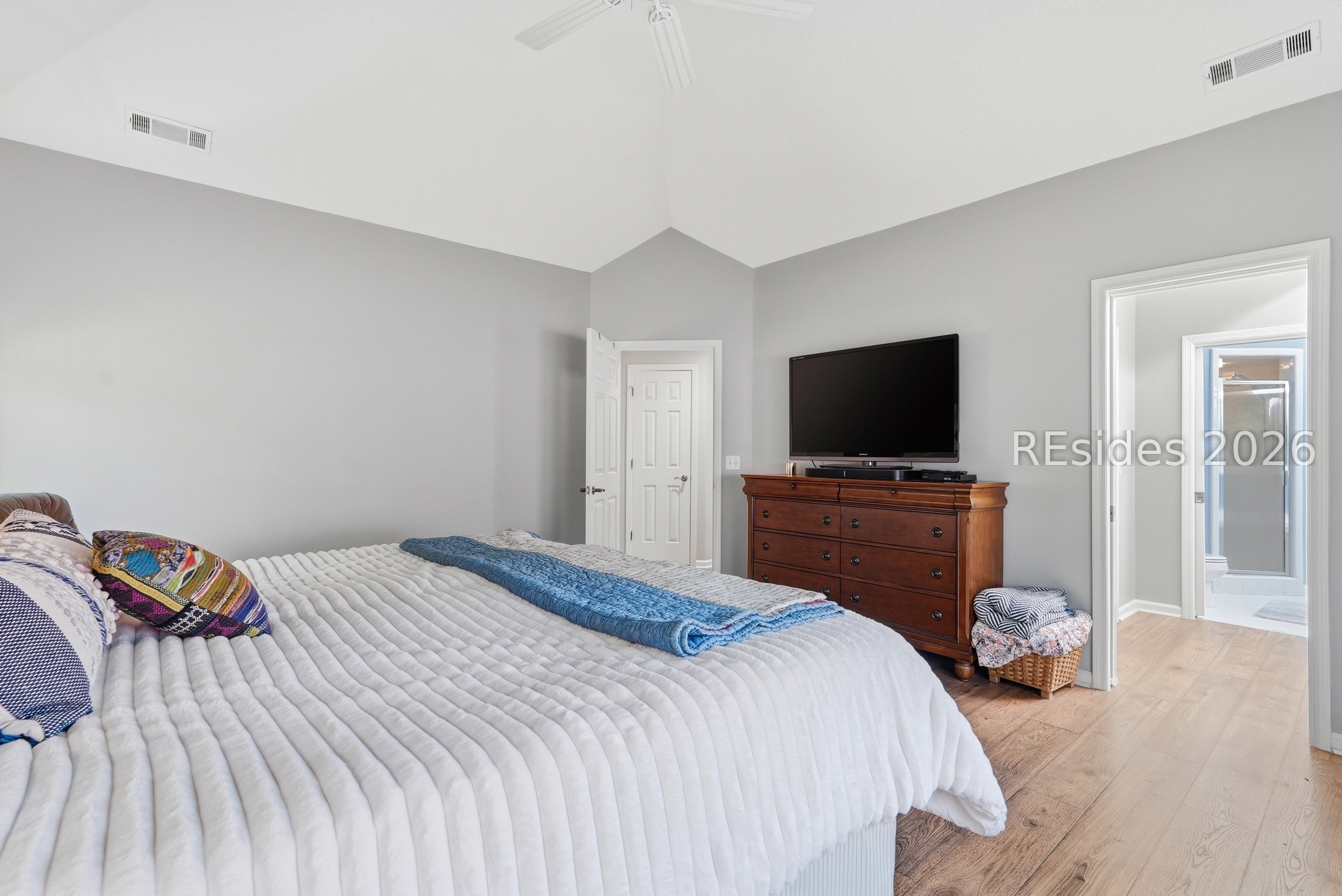 - Attic Access, Ceiling Fan(s), Cathedral Ceiling(s), Fireplace, High Ceilings, Jetted Tub, Main Level Primary, Multiple Primary Bathrooms, Pull Down Attic Stairs, Smart Thermostat, Cable TV, Vaulted Ceiling(s), Window Treatments