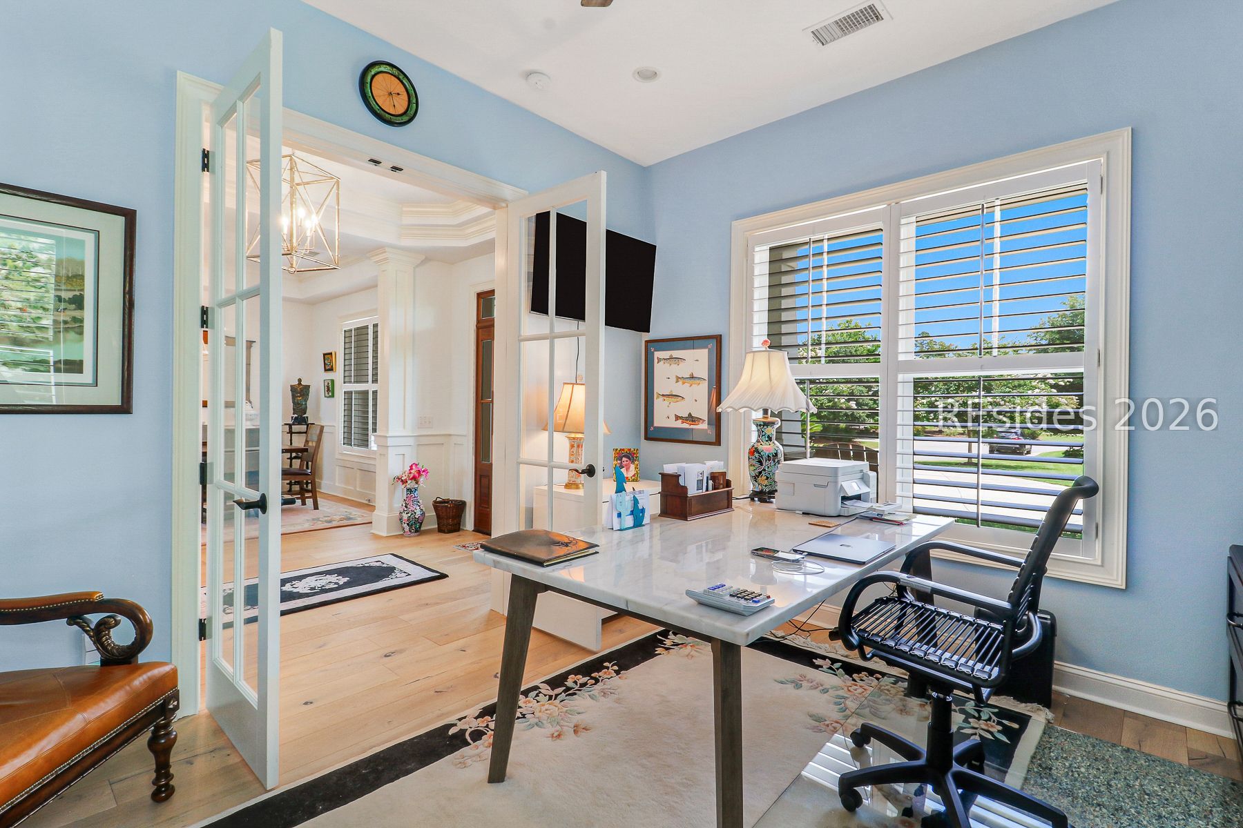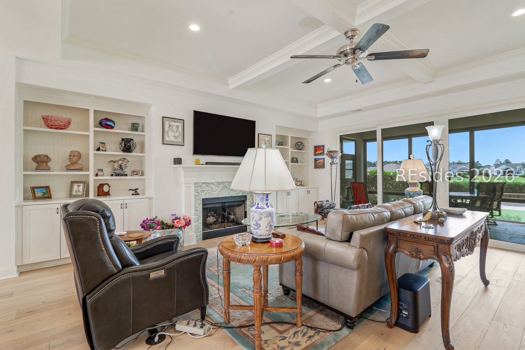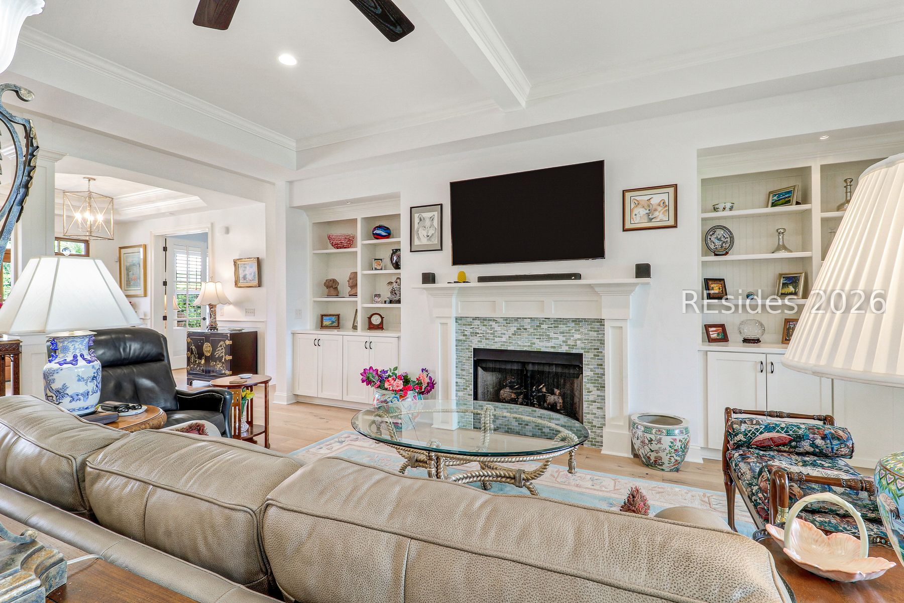 - Attic Access, Bookcases, Built-in Features, Tray Ceiling(s), Ceiling Fan(s), Fireplace, Main Level Primary, Multiple Primary Bathrooms, Smooth Ceilings, Separate Shower, Cable TV, Window Treatments, Entrance Foyer, New Paint, Pantry, Workshop