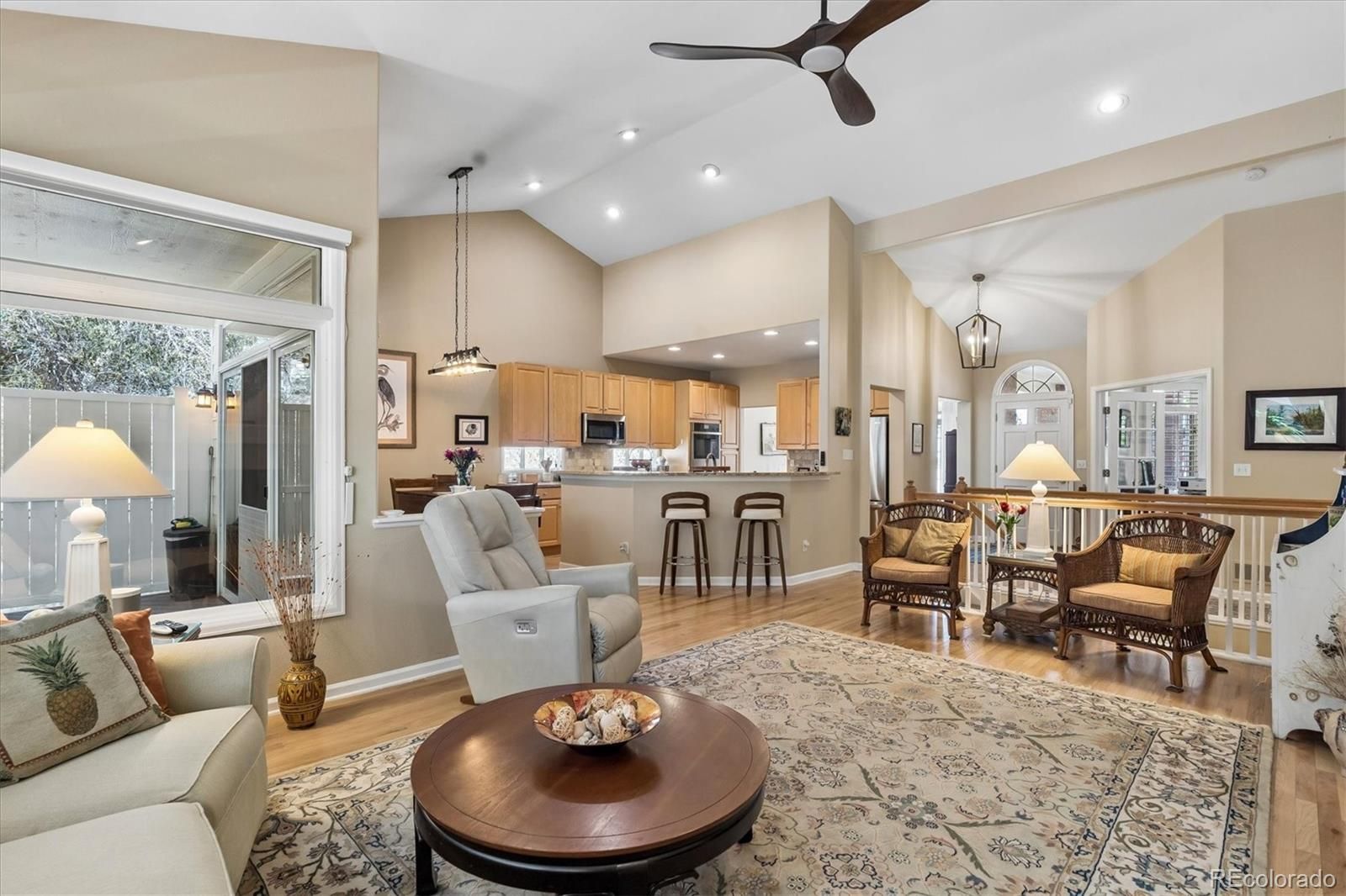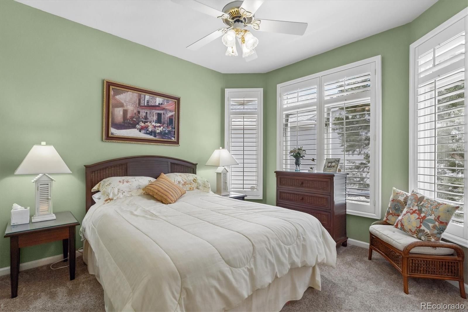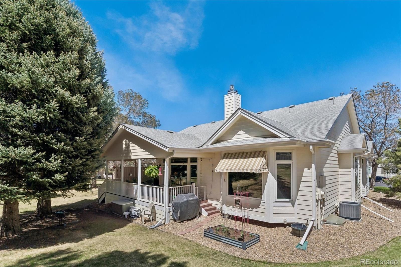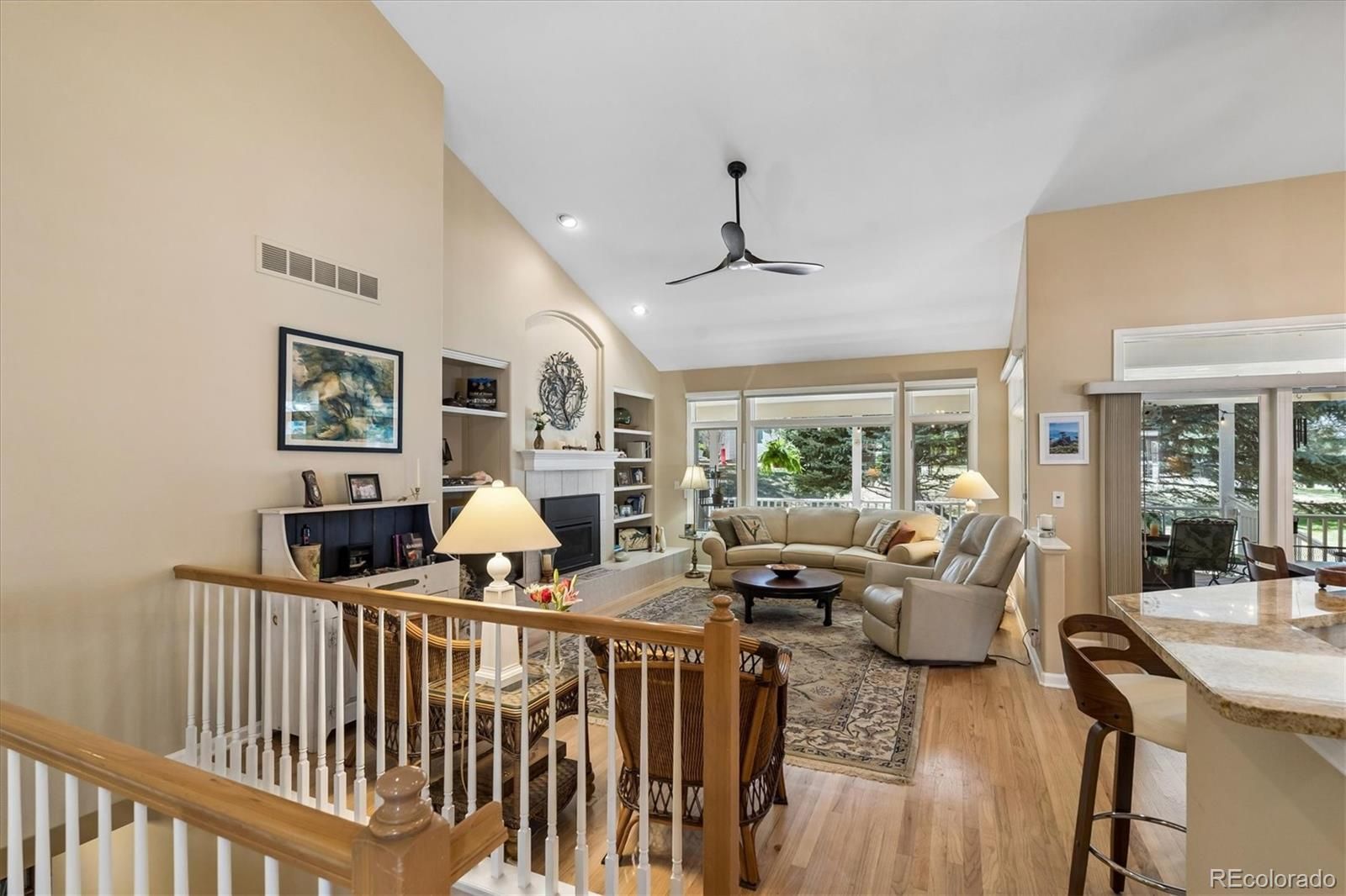 Welcome to 7 Skye Pl in Gleneagles Village, a premier 55+ gated community surrounded by The Links Golf Course in Highlands Ranch! This meticulously maintained and beautifully updated Scottsdale (most popular) model ranch home is ideally situated on a quiet cul-de-sac, backing to a lush greenbelt with mature pine trees that provide exceptional privacy. This tranquil oasis features 3 bedrooms plus study and 3 bathrooms. Enter through the spacious, gated front patio and step into a warm, welcoming open floor plan highlighted by soaring vaulted ceilings. Rich hardwood floors extend throughout the great room, dining area, kitchen, breakfast nook, and study. The great room impresses with expansive windows, an inviting gas log fireplace, and built-in shelving. The updated gourmet kitchen is designed to impress, featuring 42” cabinetry, slab granite countertops, marble tile backsplash, and stainless steel appliances-including double ovens. The adjacent breakfast nook opens via sliding glass doors, to a peaceful covered back deck - an ideal retreat for morning coffee or evening relaxation. Perfect for entertaining, the formal dining room showcases elegant bay windows. The private study offers a quiet workspace complete with French doors and built-in shelving. The luxurious primary suite is a serene escape, featuring vaulted ceilings, ceiling fan, bay windows overlooking the greenbelt, a spacious walk-in closet, and a beautifully appointed five-piece bath. A secondary bedroom with bay windows sits near an updated, full bathroom. Laundry room includes a utility sink, built-in cabinetry, and direct access to the attached two-car garage. The finished basement expands the living space with a large rec/media room, a conforming third bedroom with a walk-in closet, a ¾ bathroom, a workshop or craft room w/ sink, and an expansive storage area. The newer HVAC system & water heater was installed in 2021. Residents enjoy an active clubhouse & pool. Low-maintenance living at it's best!
