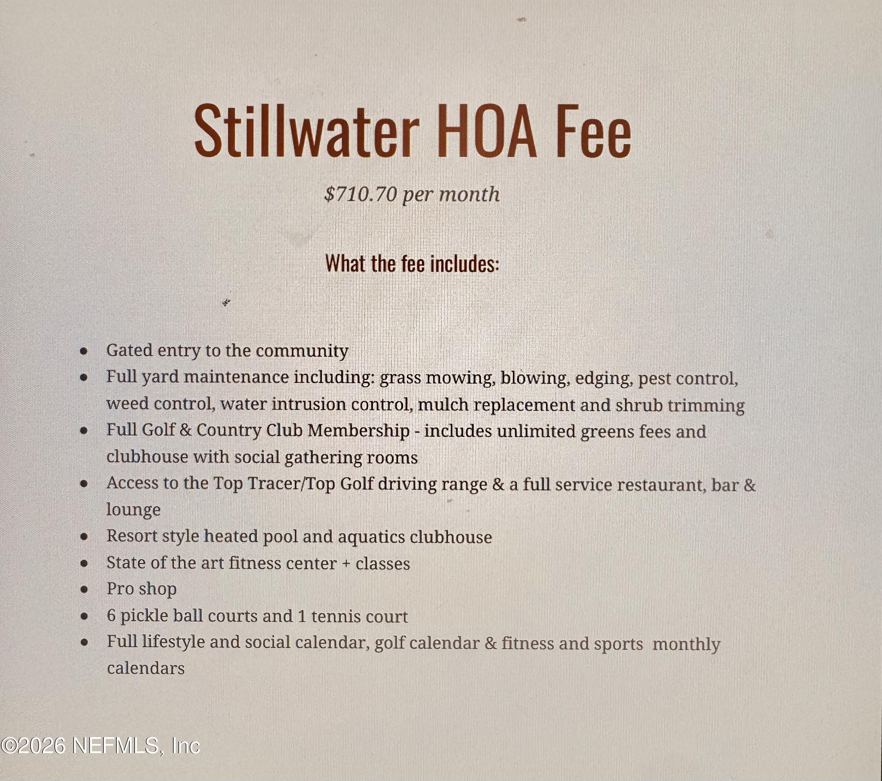 OPEN HOUSE SAT. 4/25 11-1:00 & SUN 4/26 12-2:00 SPETACULAR STILLWATER GOLF & COUNTRY CLUB HOME ON PRESERVE! Lawn care & Golf Membership included! Maintenance Free Living at its best in this Beautiful & Amazing home loaded with upgrades and backs to a Picturesque Preserve for Privacy. Located on one of the best streets in the community w/one of the most sought after Floorplans, a Premier Gated Adult Community in the Heart of St. John's County, Home includes a Chef Kitchen with Double Oven, Gas Cooktop, Quartz Counters, 42' Cabinets w/ Crown Moldings, loads of Tile, Oversize Primary Bedroom w/ Designer Wall, Walk-in Closet, Huge walk-in Shower tiled to ceiling & Rain head, Laundry Room with sink & cabinet, Large Screened in Lanai, Plantation Shutters, Shark Coat Garage Floor, Brick Paver Driveway & Lanai, Sprinkler System, 2 Bedrooms, plus Office w/ French Doors, & large flex space which can be 3rd Bedroom or 2nd Living Space. Resort Style Living in this Golfers Paradise w/ World Class Amenities including Golf Course designed by Bobby Weed, Pro-Shop, Restaurant & Bar, Tracer Golf...Huge Gym, & Resort Style Heated Pool with Cabana's, Yogo Room, Pickleball & Tennis Courts, Bocce Ball, & Tons of Social & Year-Round Events. Don't miss out on this Amazing home, call today for your Private tour! No Flood Zone! Golf Cart Negotiable - CDD is included in the tax bill - With HOA dues all owners are members and have full golf membership, Lawn maintenance covered, access to new lodge, unreal Golf Amenities, Aquatic Center, Amazing Fitness Center, Stunning Full Service Restaurant & Lounge, Top Tracer Facility, Tennis & Pickleball Courts, Gated Community Access, Entrance Christmas Decorations, Pond & Grounds Maintenance, Golf Pro shop on site and more...