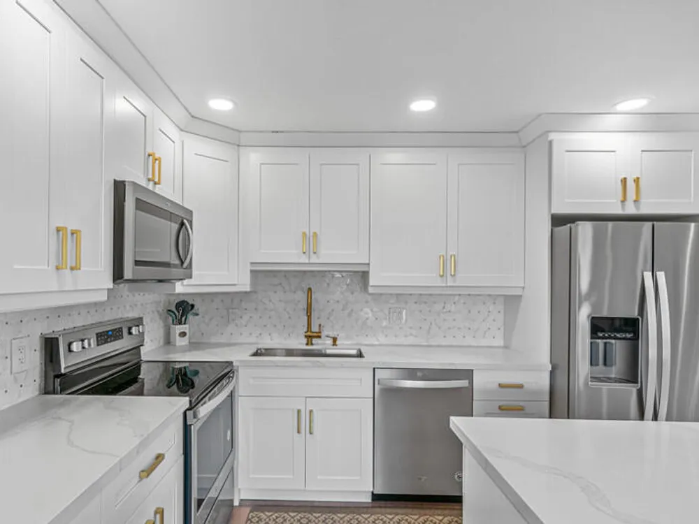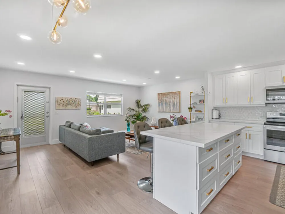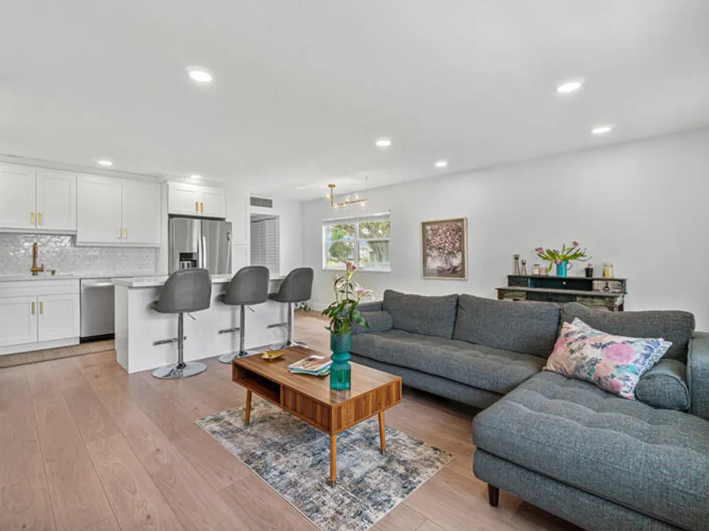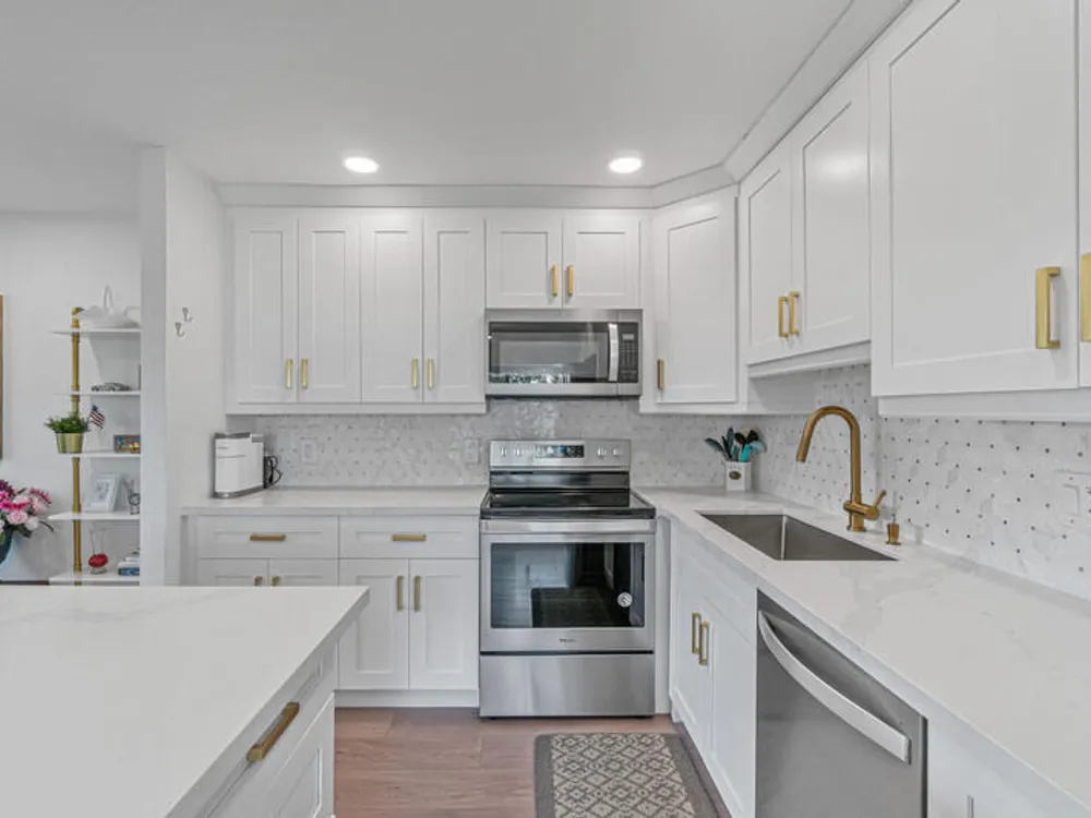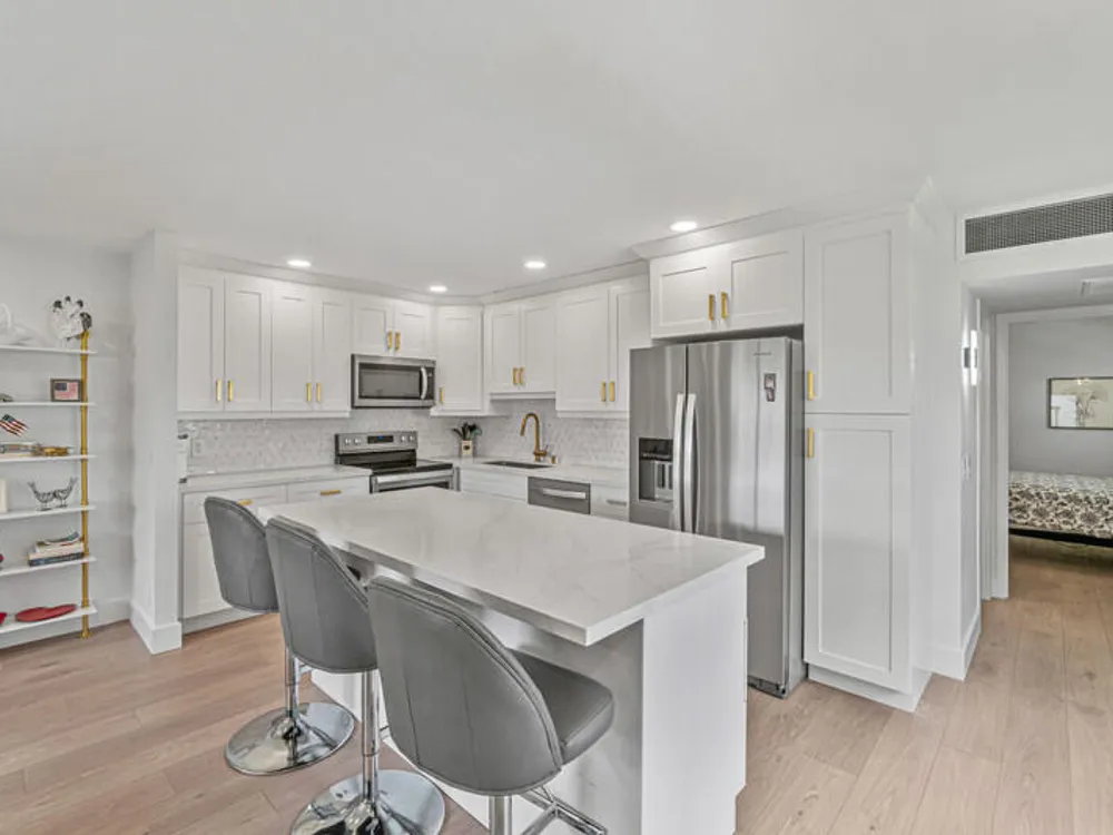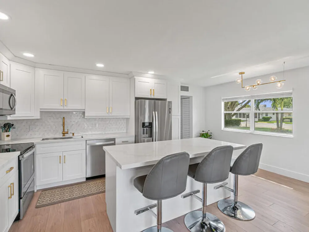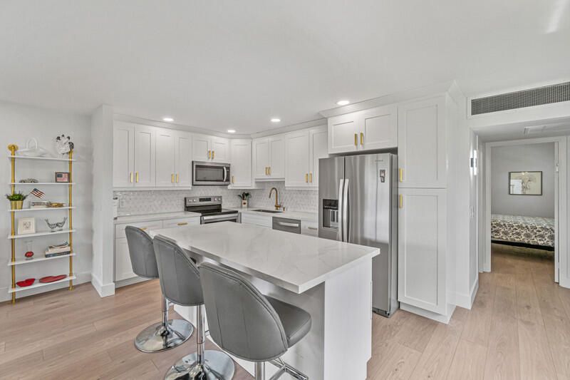 Turnkey and completely renovated 1/1.5 plus enclosed Florida room in Valencia section of Kings Point. This corner apartment shows like a model with a gorgeous white kitchen with large island, quartz countertops, and stainless steel appliances. Luxury vinyl flooring throughout, two renovated bathrooms, smooth ceilings, and lots of windows with natural light. Kings Point is a premier 55+ community with 24/7 gate access and a state of the art clubhouse facility with multiple pools, tennis, clubhouse, fitness center, restaurant, card rooms, and the list goes on.
