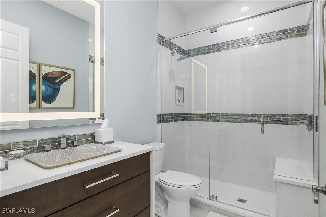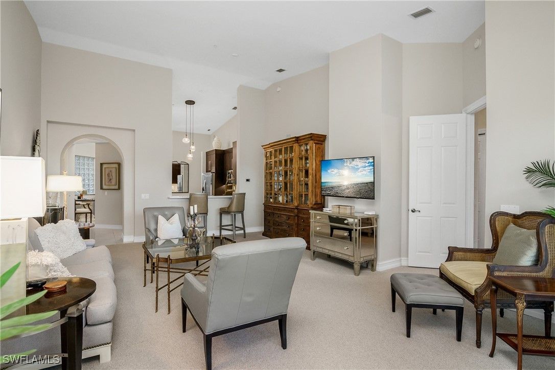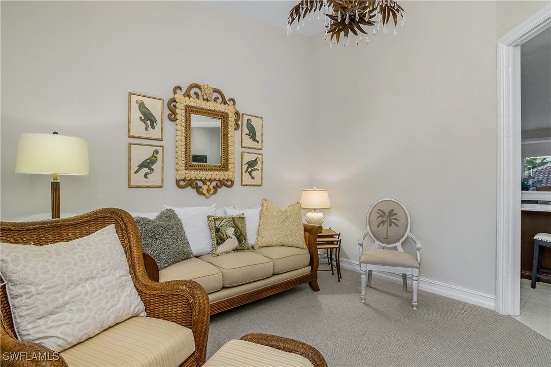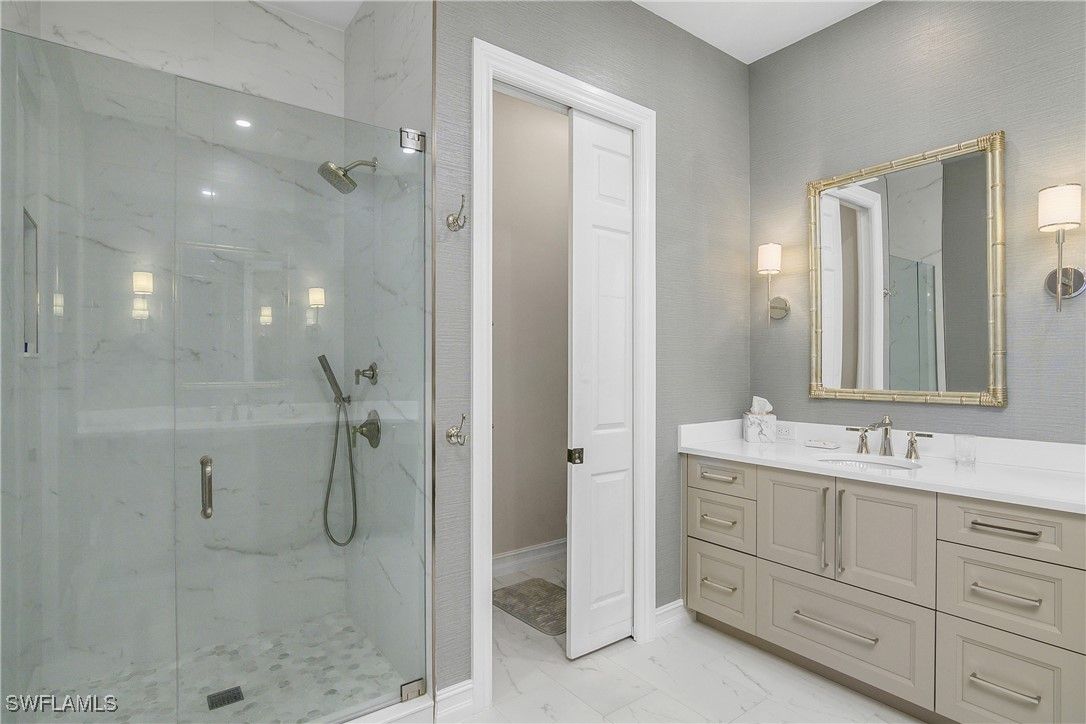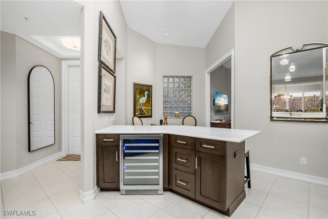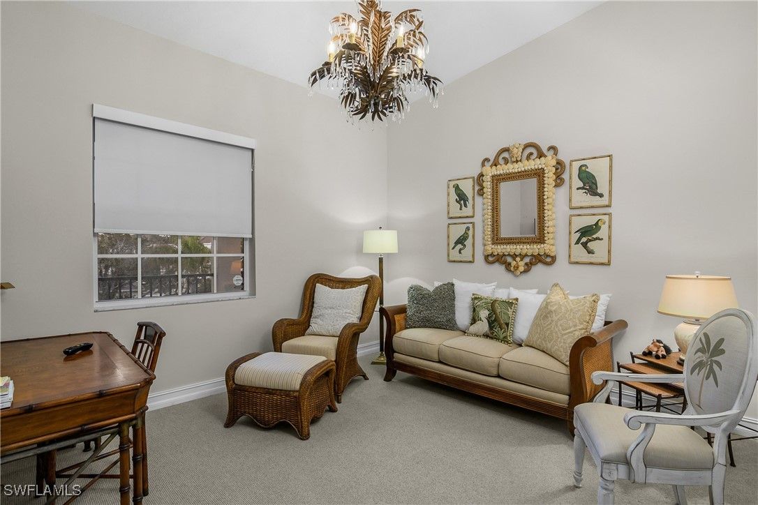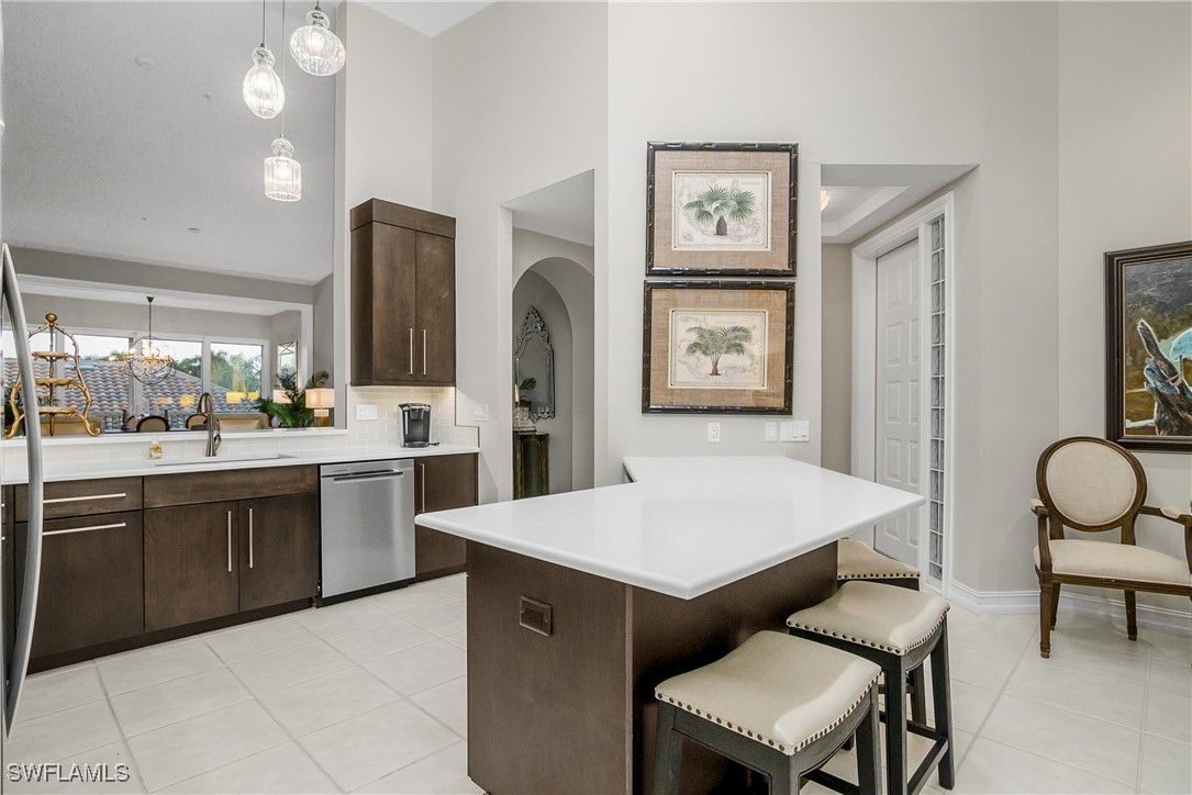 Welcome to this beautifully remastered Breakwater two bedroom plus a den condo with its unique 2 car plus storage enclosed garage, directly under your unit. In 2023 the entire unit underwent a NEW and LUXURIOUS TRANSFORMATION that created a sophisticated designer interior with high quality appointments throughout. The remodel included the replacement of all plumbing piping...very important, the building roof tiles, new impact glass sliding glass doors were installed on the lanai in front of the screen enclosure creating a grand dining area that is in the air conditioned space as well as being able to open the SGDs and have the outside air to fill the unit on a beautiful day. The AC and Hot Water Heater were replaced in 2022. Partially furnished, see inclusion list, this unit location offers a very private view with no units looking back into your home and is directly across the street from the community club house and pool area with lots of guest parking. Located directly inside the main gate allows for a quick walk or bike ride to the many amenities in Pelican Bay ! Pelican Bay is a world class amenity filled lifestyle that includes 3 miles of undeveloped beachfront for residents to walk, swim, sail, kayak, paddle board and embrace this natural shoreline, 2 resident only beach clubs, 2 tennis complexs, pickle ball, grand fitness center, spa by appointment, walking and fitness trails, the Waterside Shops, Artis philharmonic center and the Baker Museum, all within the community. This is a must see Naples lifestyle !