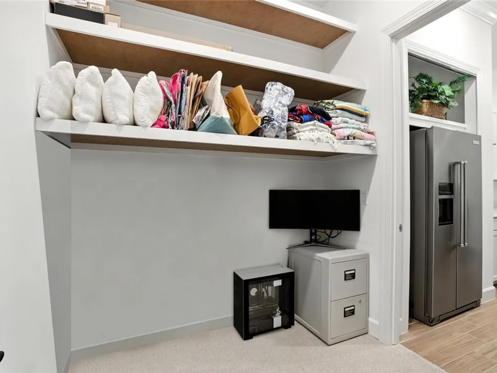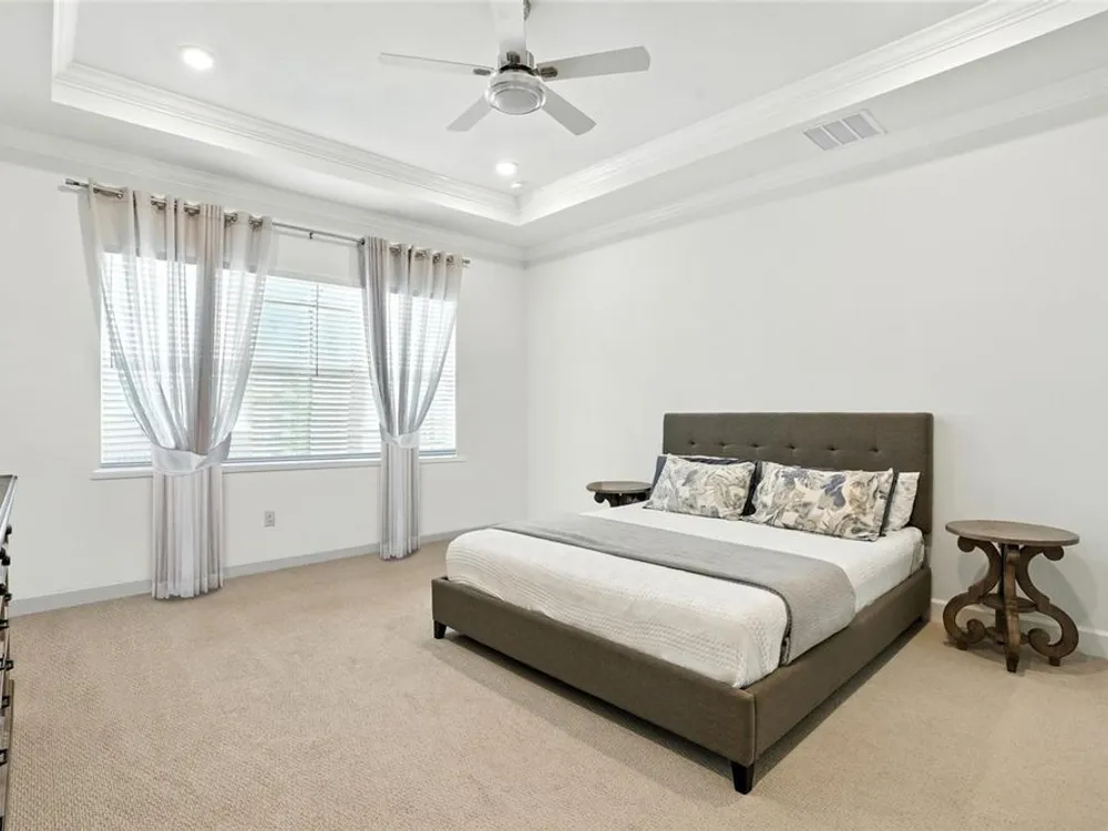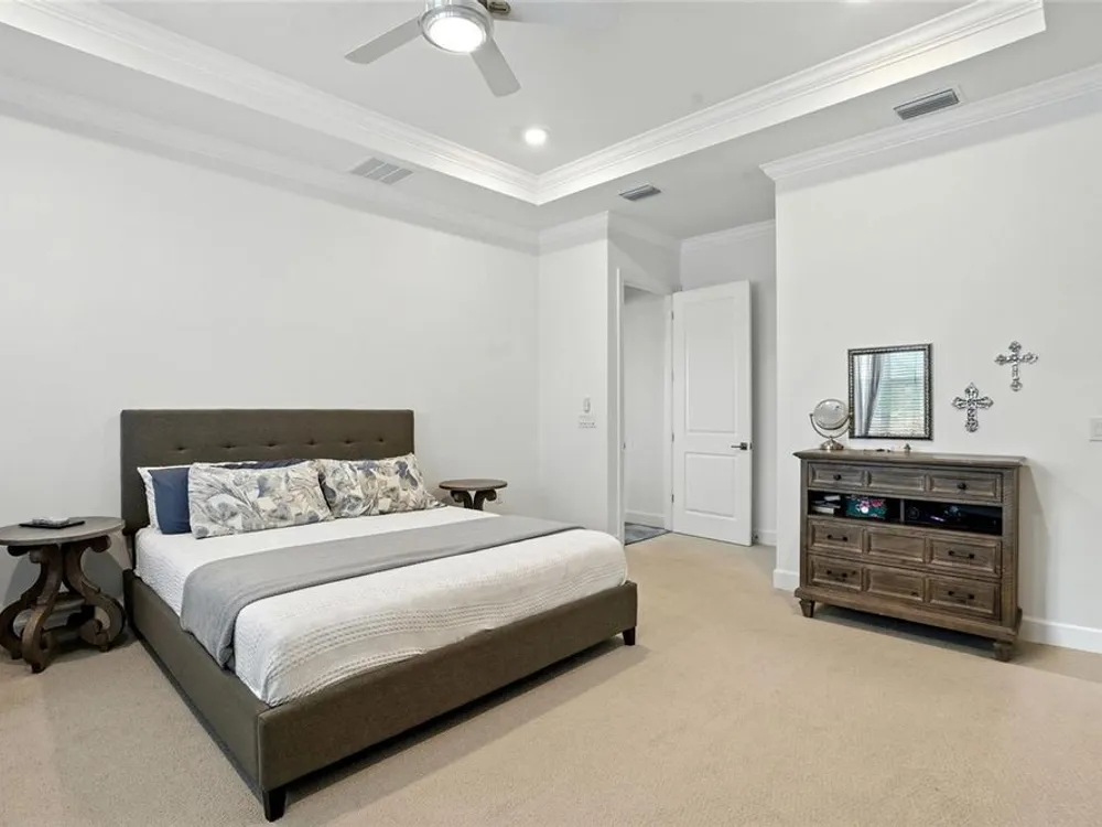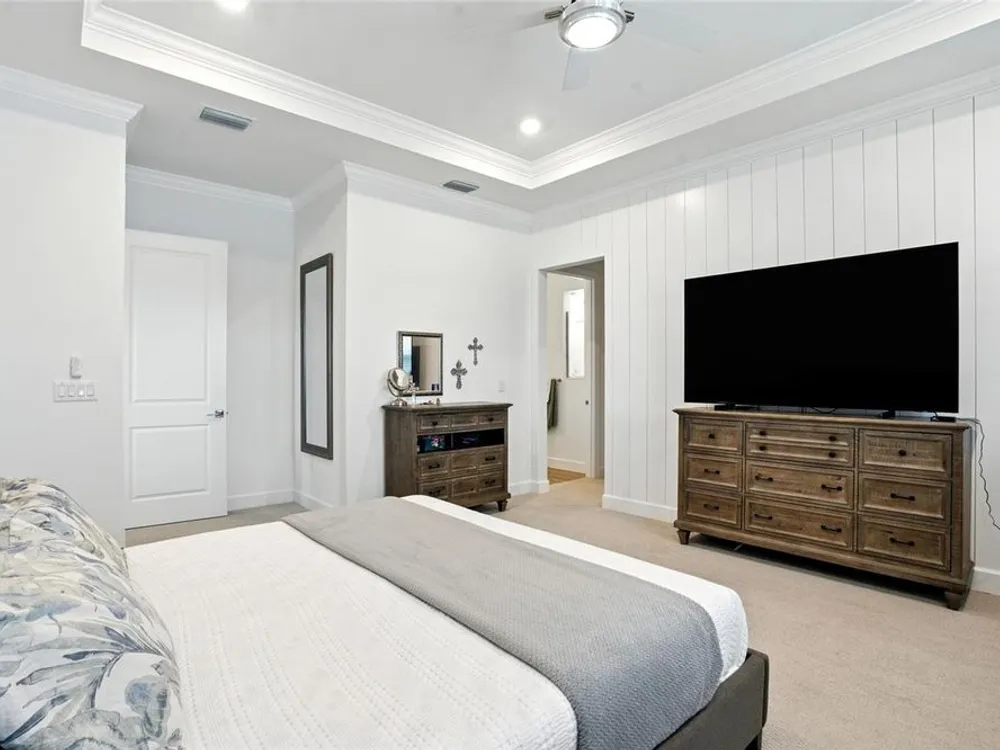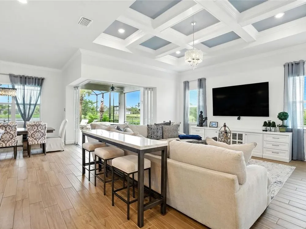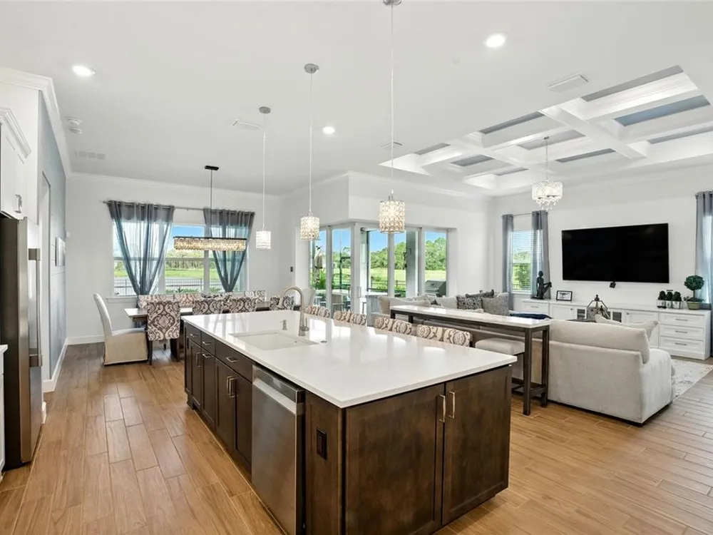- Built-in Features, Ceiling Fan(s), Coffered Ceiling(s), Crown Molding, Eat-in Kitchen, High Ceilings, In-Wall Pest Control, Kitchen/Family Room Combo, Living/Dining Room, Open Floorplan, Main Level Primary, Smart Home, Split Bedrooms, Tray Ceiling(s), Walk-In Closet(s), Window Treatments