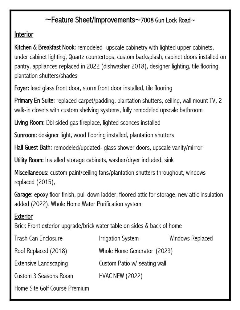 Welcome Home to 7008 Gun Lock Rd! Beautifully maintained home all on one level, situated on a golf course lot offering privacy, space and upgrades throughout in this highly desirable location in Colonial Heritage. The spacious layout includes an upscale remodeled kitchen with lighted upper cabinets, quartz countertops, newer appliances & gorgeous custom pantry that opens to a lovely breakfast nook and family room. Impressive ceilings in the dining room and family room flow perfectly into a delightful sunroom. The PBR with vaulted ceiling, 2 closets with custom shelving/cabinets and a gorgeous remodeled bath are sure to impress. A large custom 3 seasons room and patio w/ paver wall seating is surrounded by plush landscaping and amazing panoramic views of the golf course. A two car garage , whole home generator, water purifier, HVAC (2022), Roof (2018), plantation shutters throughout are just some of the features you will find. Many thoughtful touches and extras to discover in this move-in ready home. A one of a kind and true gem!