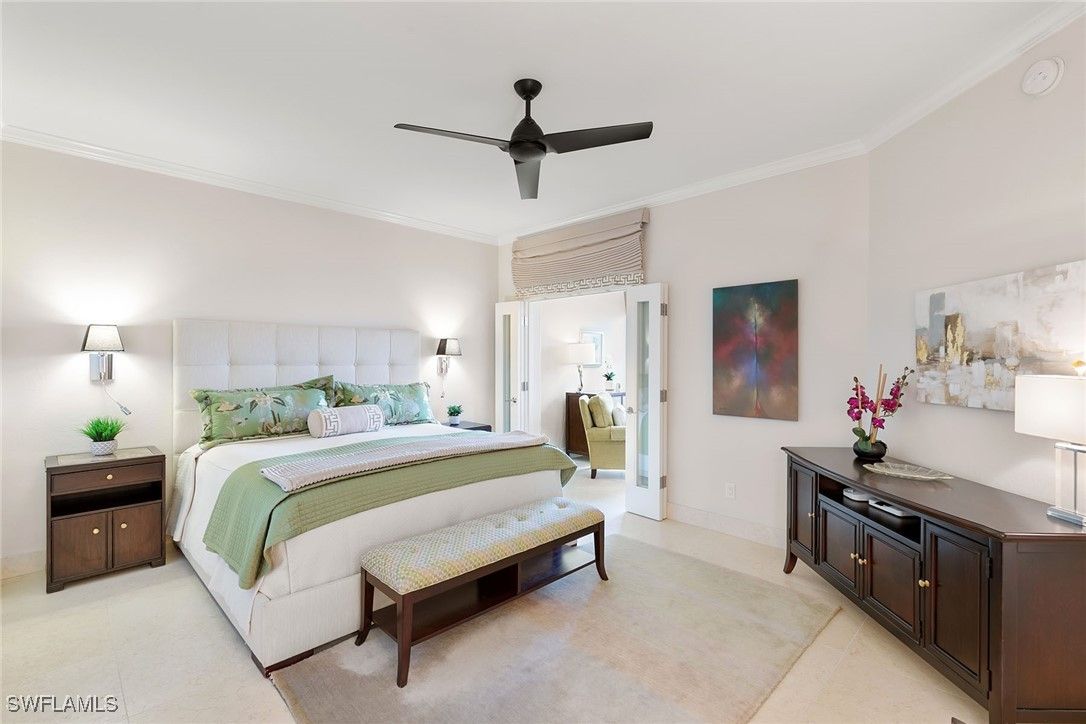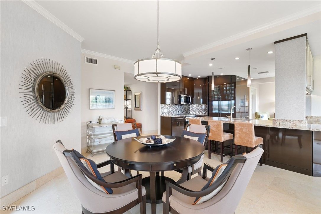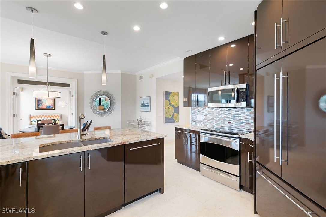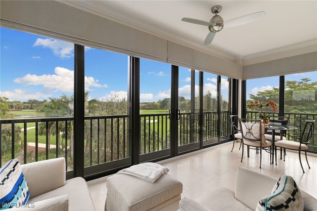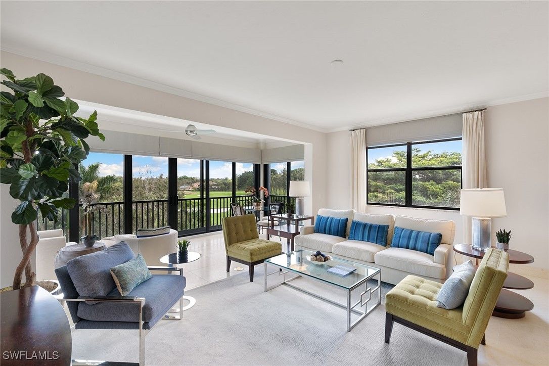 A property for view lovers! Move right in to this renovated Calais residence in the heart of Pelican Bay. This condo was taken down to the studs and reimagined with a light, modern aesthetic and an open floor plan that captures wide golf course views the moment you walk in. Walls were removed to create a spacious great room with 9 foot ceilings and large scale travertine tile flooring throughout, setting a soft, neutral backdrop for the modern kitchen and baths. The designer selected furnishings are included and were curated specifically for this home, blending modern and eclectic pieces with warm tones and comfortable seating. A split bedroom plan provides privacy for owners and guests, while the third floor location places you at tree-top level with an expansive view over the Pelican Bay golf course. Under building parking, extra storage and closets, secure entry and Calais' central Pelican Bay location make everyday living easy. From here it is a short, convenient walk to the Pelican Bay beach tram and all of the amenities that make this community so desirable.