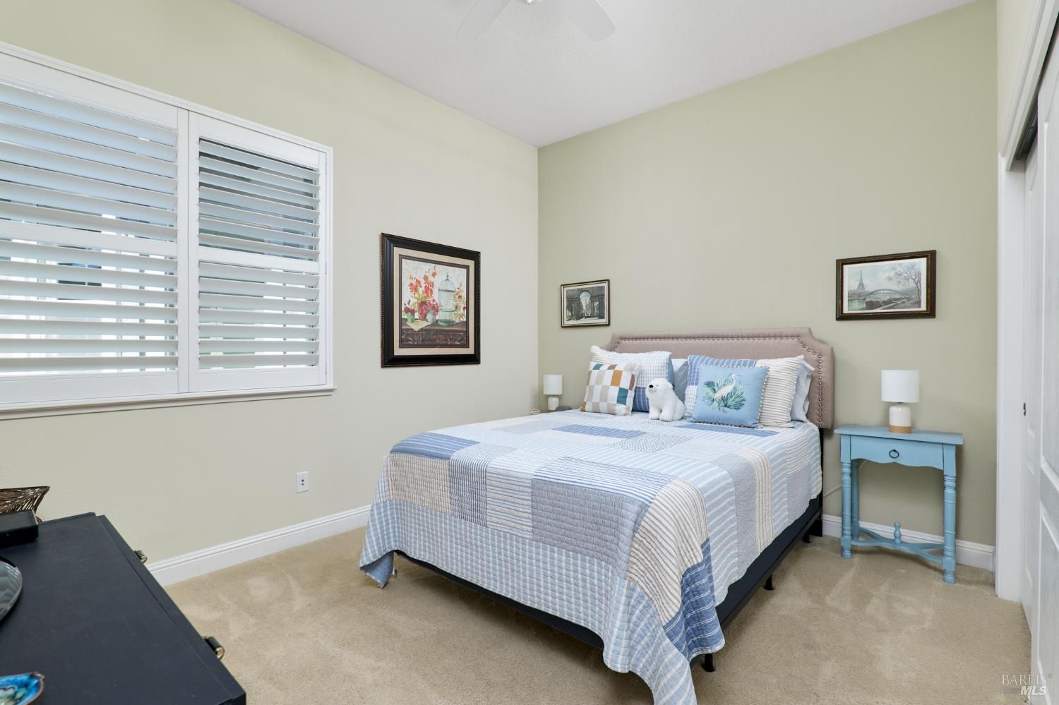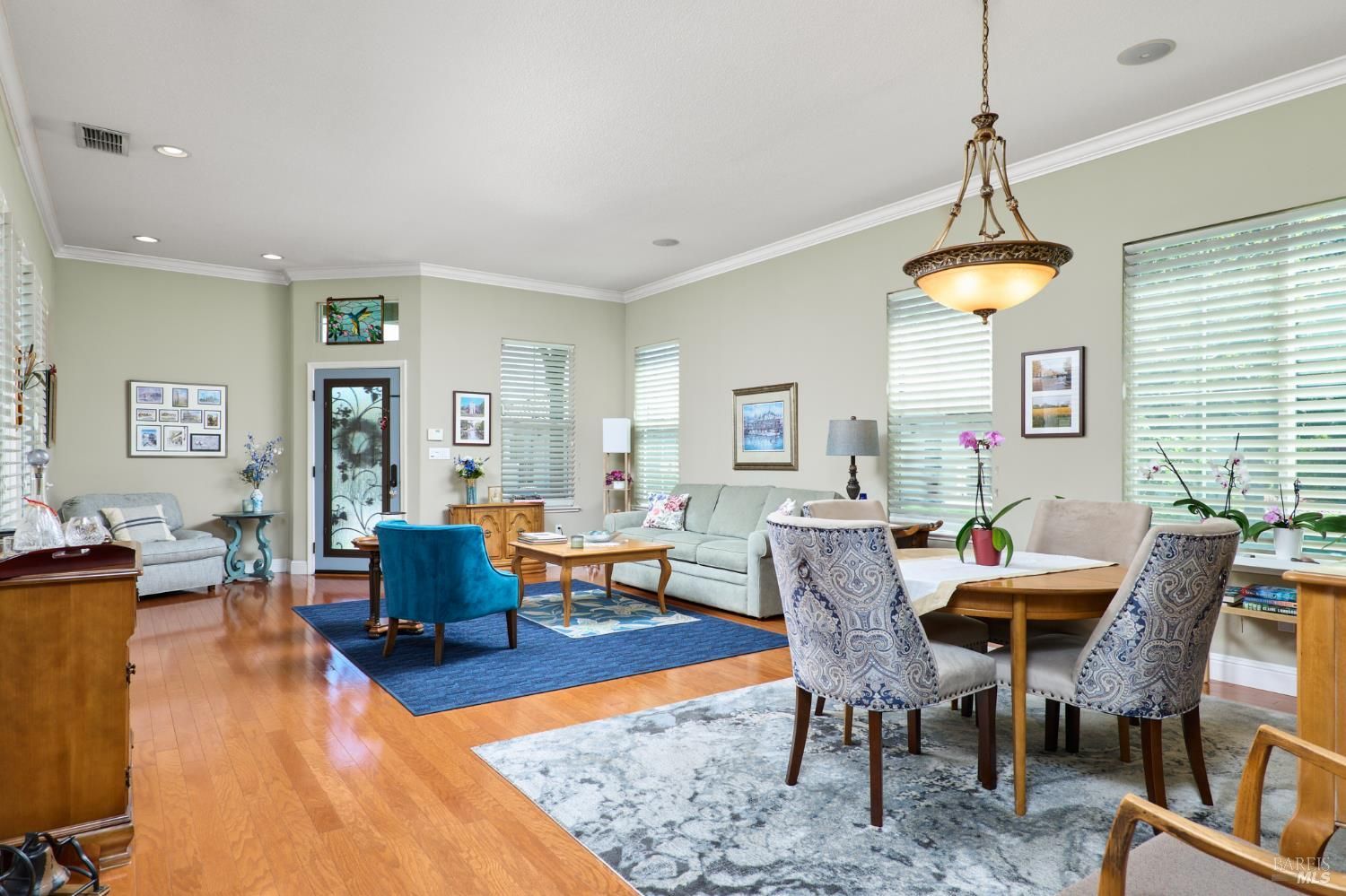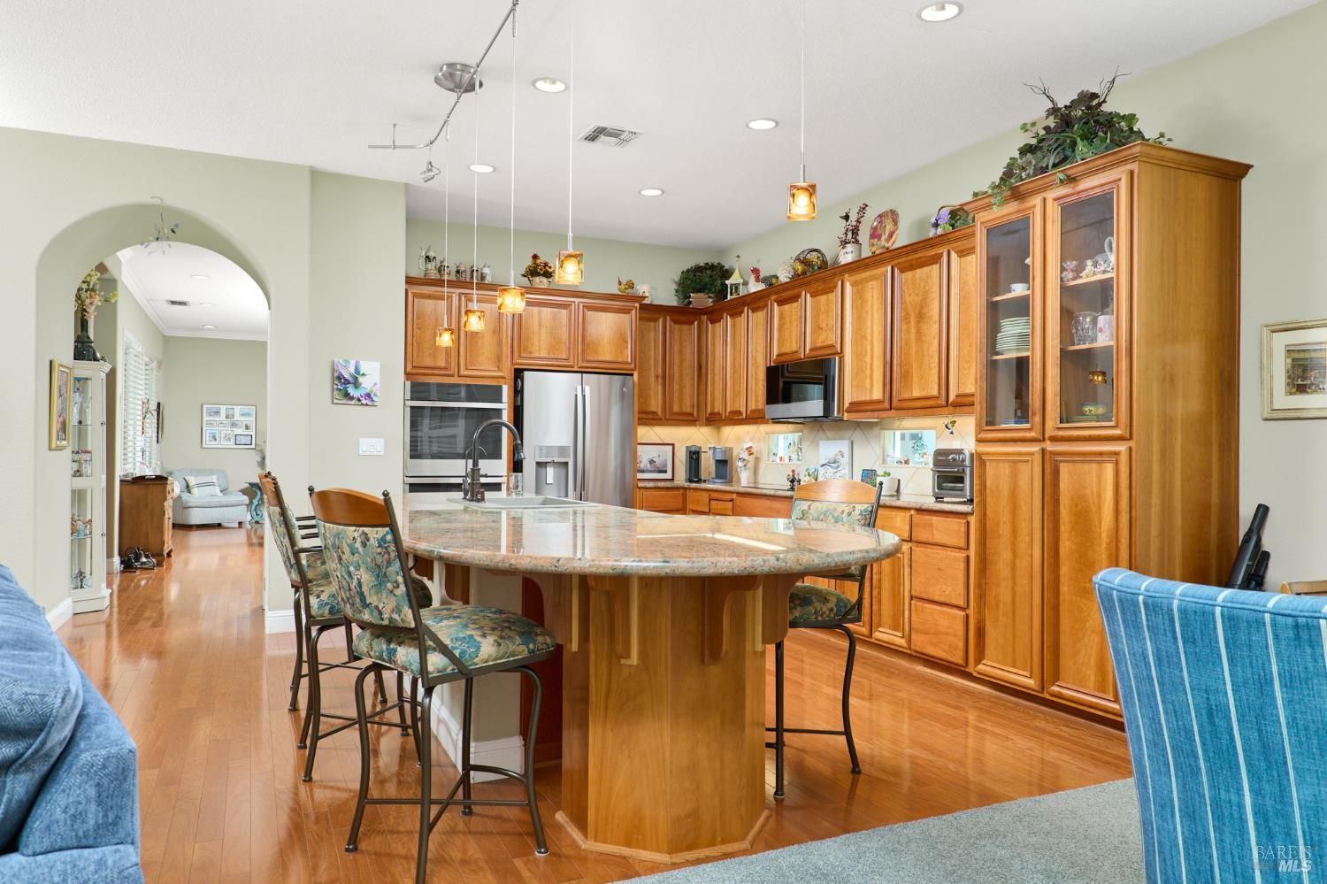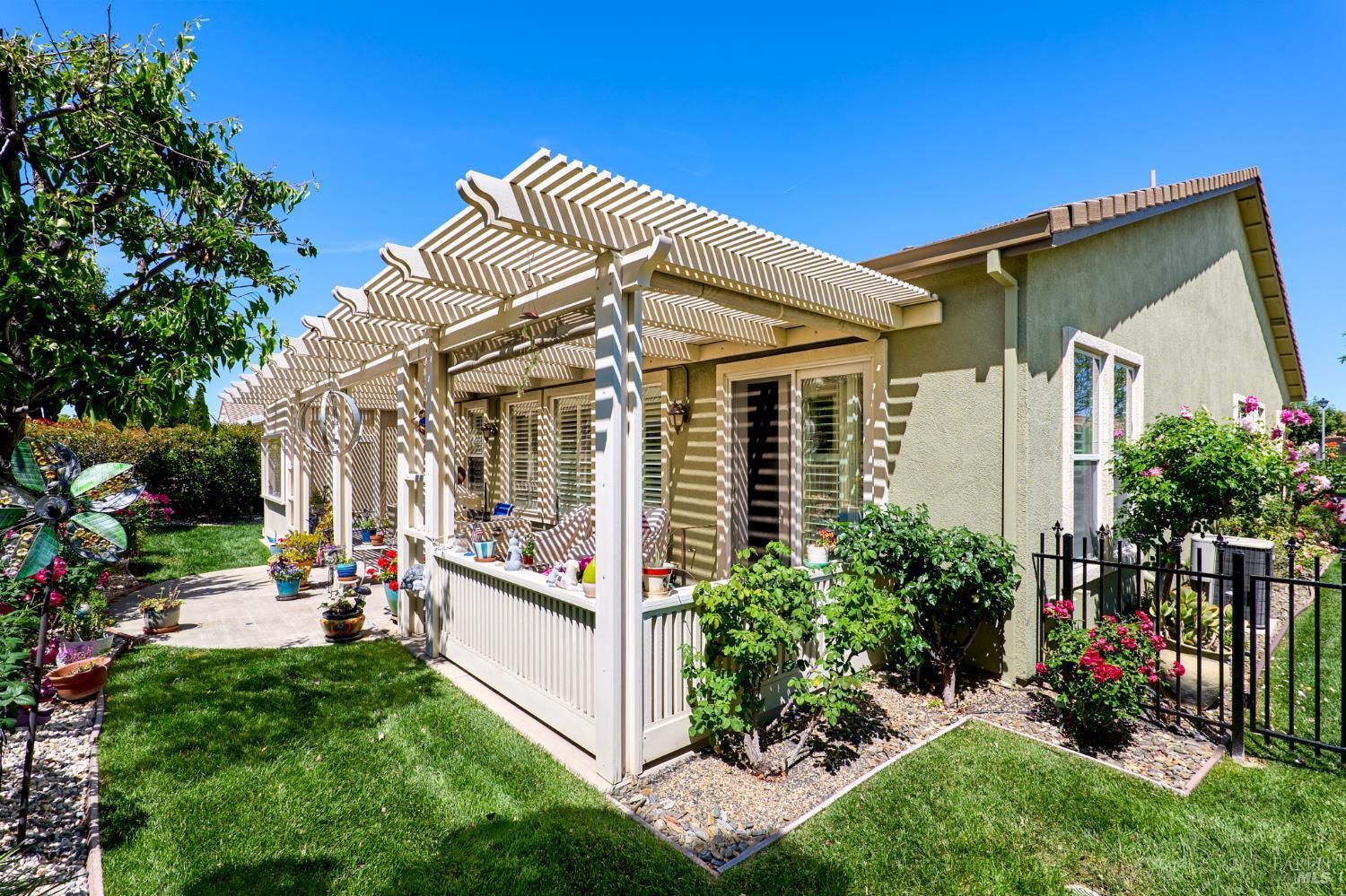 Walking this neighborhood for several years, one would enjoy the beautiful landscape and effort this seller has put into their yard. With curb appeal all the way to the back fence, this home is a showplace! The use of color from the walls to the warm wood floors through most of the home will bring a smile to your face. This is the Asti plan done the way it should be! After marveling at the beautiful yard, you will enter through the custom glass front door to the family and dining rooms with a wall of windows and doors viewing onto the courtyard with a custom wood burning fireplace. What a great place to sit and share a beverage. Off the dining room is an office/den with built in bookcases and views to courtyard. Now into the great room you will be greeted by granite counters, clear finish cherry cabinets, stainless appliances with true double ovens, an electric cooktop (pre-plumbed for gas), over the range type micro/hood and dishwasher. The unique island has a rounded end to it and the custom pendant lights follow that flow from above. The adjacent breakfast nook sits near rear patio doors with white shutters peaking out to the back yard where the rounded look is carried through to the patio hard surface. Another highlight are the two peak-a-boo windows under the cabinets. Across from the kitchen, the family room sits with wine/beverage bar, fireplace and room for your entertainment center. Meander down the hallway a bit and you will see the tech area with built in desk and then a half bath. Continue to the bedroom wing and to the left is the primary suite with spacious bedroom, a grand bathroom with 2 separate walk-in closets two vanities and a large soaking tub and separate shower. To the right is a secondary bedroom/bathroom suite before you come to the indoor laundry room. Yes, this home has a lot, including a 2 car and a 1 car garage, a large patio with an Alumawood type patio cover surrounded by stunning grounds! Trilogy at Rio Vista is a gated community built around an 18-hole golf course that weaves through the development. There are clubhouses, indoor and outdoor pools, BBQ areas, an indoor walking track, a gym and spa, many club rooms, tennis/pickleball courts bocce and so much more. There are about 100 clubs and groups to be involved with. HOA dues do not include golf play.