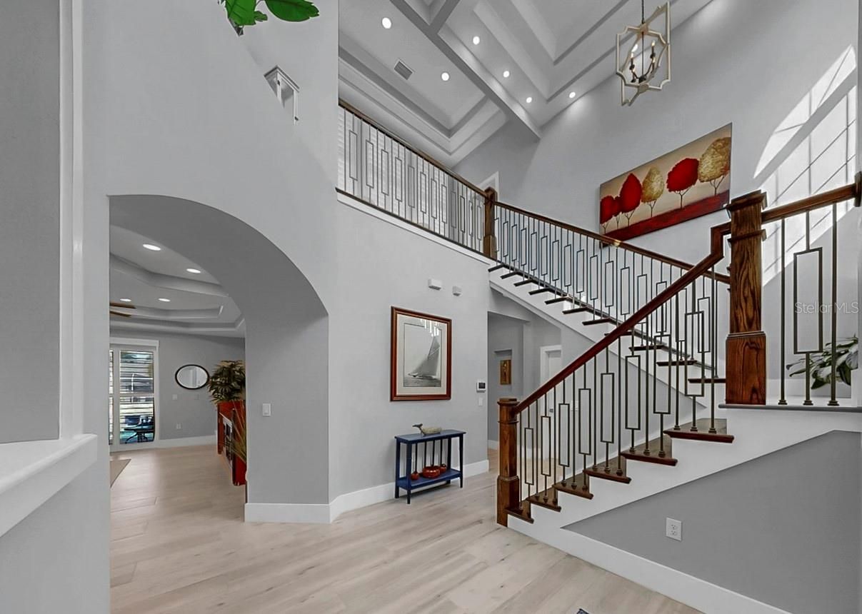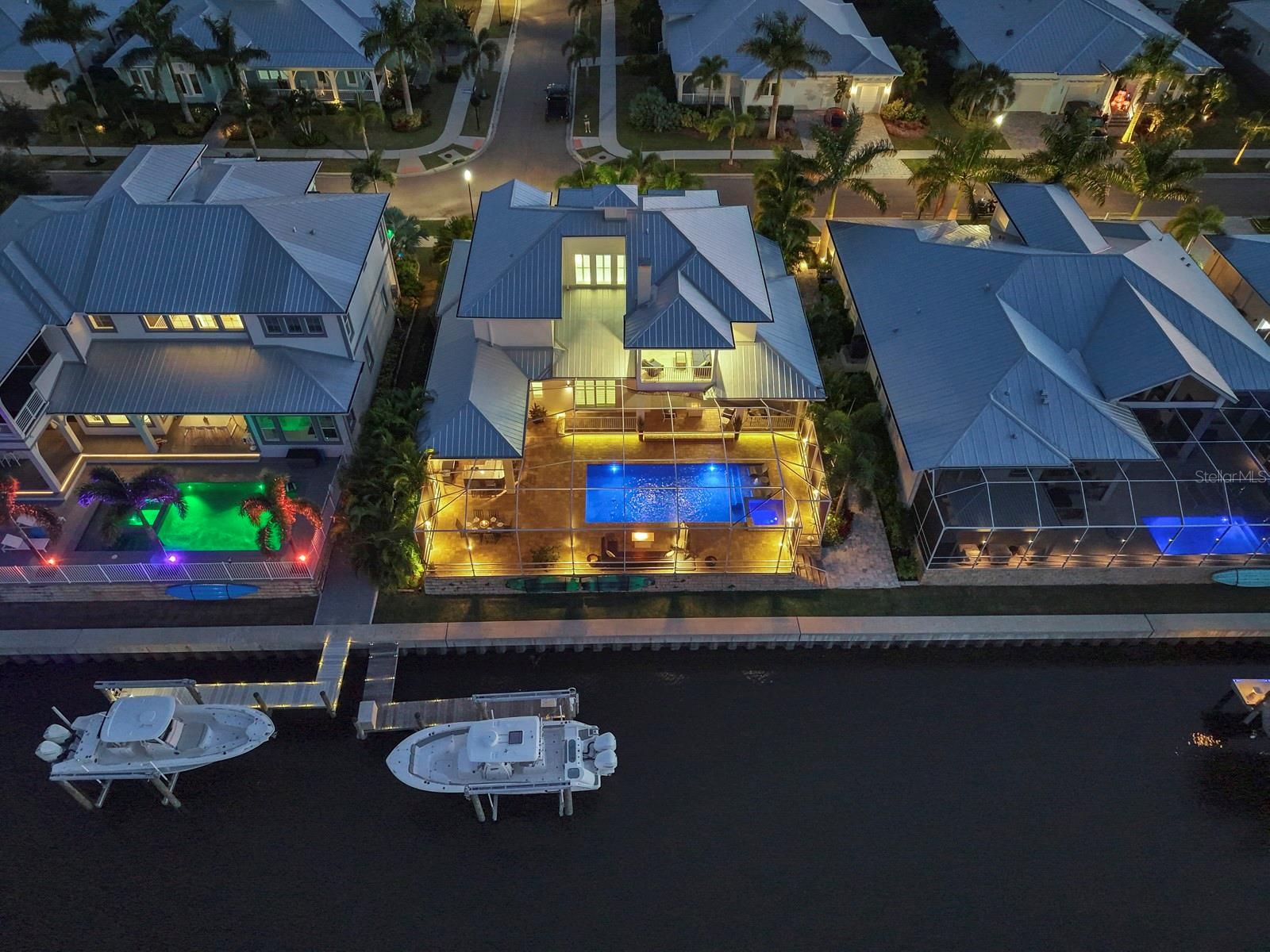 Welcome to your own luxury waterfront retreat in the coveted gated community of MiraBay, where sophistication, comfort, and resort-style living come together in perfect harmony. From the moment you step through the front door, you’re greeted by soaring ceilings, natural light, and sweeping water views that immediately draw you toward the heart of this exquisite home. Thoughtfully designed with refined finishes and timeless style, each space flows effortlessly, creating a perfect balance between modern luxury and relaxed coastal living. The main living areas open seamlessly to your outdoor oasis, where every detail has been curated for entertaining and tranquility. A custom outdoor kitchen and bar with built-in grills sets the stage for unforgettable gatherings. As evening falls, the ambiance comes alive with custom landscape and pool cage lighting, reflecting across the sparkling pool and spa, all easily managed with the OmniLogic wireless controller. A remote-controlled SunSetter shade extends comfort and sophistication, allowing you to enjoy the Florida lifestyle year-round. Your private dock with a 13,000-pound boat lift invites endless adventures on the water, while the circular driveway and lush landscaping create a grand first impression. Inside, every bedroom is a private retreat, each featuring its own ensuite bathroom. Upstairs bedrooms open to private balconies, offering serene morning views and gentle coastal breezes. A bonus room provides flexible living space, perfect for a media room, gym, or home office. The primary suite is a sanctuary of its own, showcasing a custom walk-in closet by California Closets and luxurious finishes designed for ultimate comfort. This home also features hurricane-impact windows on all windows, whole-home gutters, and a water softener system for peace of mind and everyday convenience. As a MiraBay resident, you’ll enjoy world-class amenities including tennis, pickleball, and basketball courts, a fitness center, a resort-style pool, three playgrounds, and a charming waterside café, all within a short stroll or golf cart ride from your door. Combining luxury design, modern comfort, and resort-style living, this exceptional waterfront home captures the very essence of the Florida coastal lifestyle—from the moment you enter to the moment you step into your own private paradise outdoors. Don’t miss out on your opportunity to tour this amazing waterfront home!