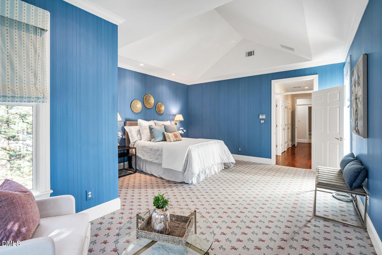 A RARE OFFERING IN ONE OF CHATHAM COUNTY'S MOST DISTINCTIVE COMMUNITIES Resting on just over an acre and positioned well back from the road for privacy and presence, this impressive residence welcomes you with a generous driveway leading to a gated front courtyard. A brick walkway sets an elegant tone from the very first step. Inside, the main level unfolds with exceptional flow, abundant light, and the richness of Brazilian Cherry wood floors. The large living room, anchored by a gas fireplace, opens through multiple doors to an expansive deck overlooking the wooded surroundings. A separate dining room connects to the kitchen through a convenient serving area, ideal for effortless entertaining. The renovated 2024 kitchen blends modern updates with timeless functionality and opens to a warm, inviting family room with space for a breakfast table. From here, enjoy direct access to both the screened porch and the two car garage with dual storage closets. The main level features two well appointed bedrooms, each with its own private bath. The primary suite offers exceptional comfort with direct access to the expansive deck, crating a seamless connection to the outdoors. A second en-suite bedroom on this level provides its own private retreat, ideal for guests or quiet workspace needs. Two additional powder rooms enhance convenience for everyday living and entertaining. The upper level offers a private retreat with spacious bedroom, full bath and a stunning bonus room filled with natural light. This flexible space features extensive built-ins, a gas fireplace, and access to a charming balcony deck. A dumbwaiter connects the bonus room to the kitchen below, an unexpected luxury that adds both fun and function. The lower level extends the home's versatility with a large recreation room lined with custom built-ins, a bedroom and a full bath, multiple storage rooms and exterior access, a thoughtful design element that enhances privacy and flexibility. Outdoor living is equally impressive, with a large deck, a generous screen porch, and the serenity afforded by the home's deep setback and wooded surroundings. With substantial square footage, thoughtful layout across three levels, and a setting within one of Chatham County's most desirable and unique communities, this home offers a rare opportunity to live expansively, entertain beautifully and enjoy a lifestyle of comfort and distinction.